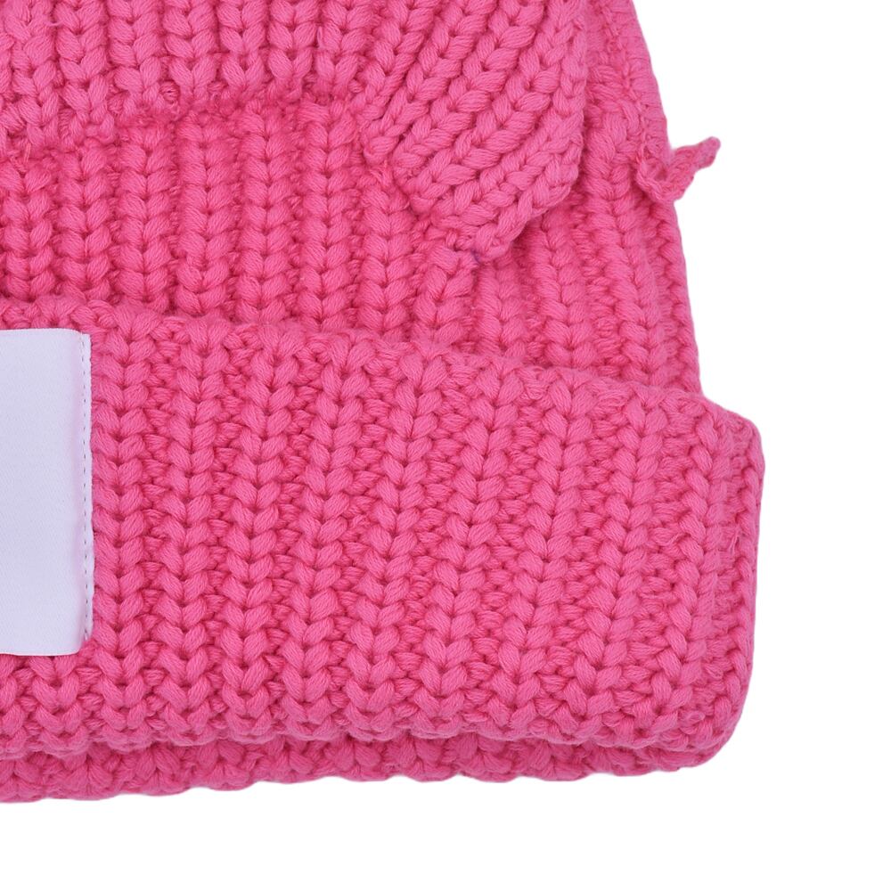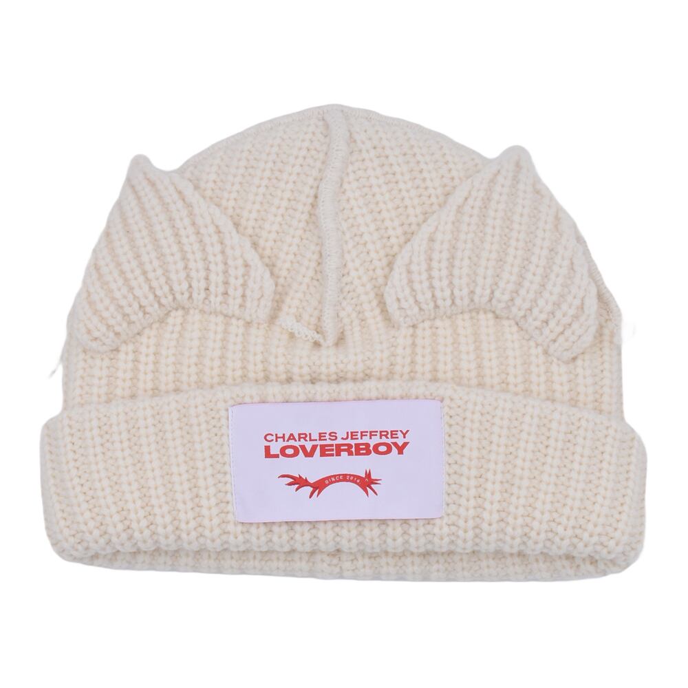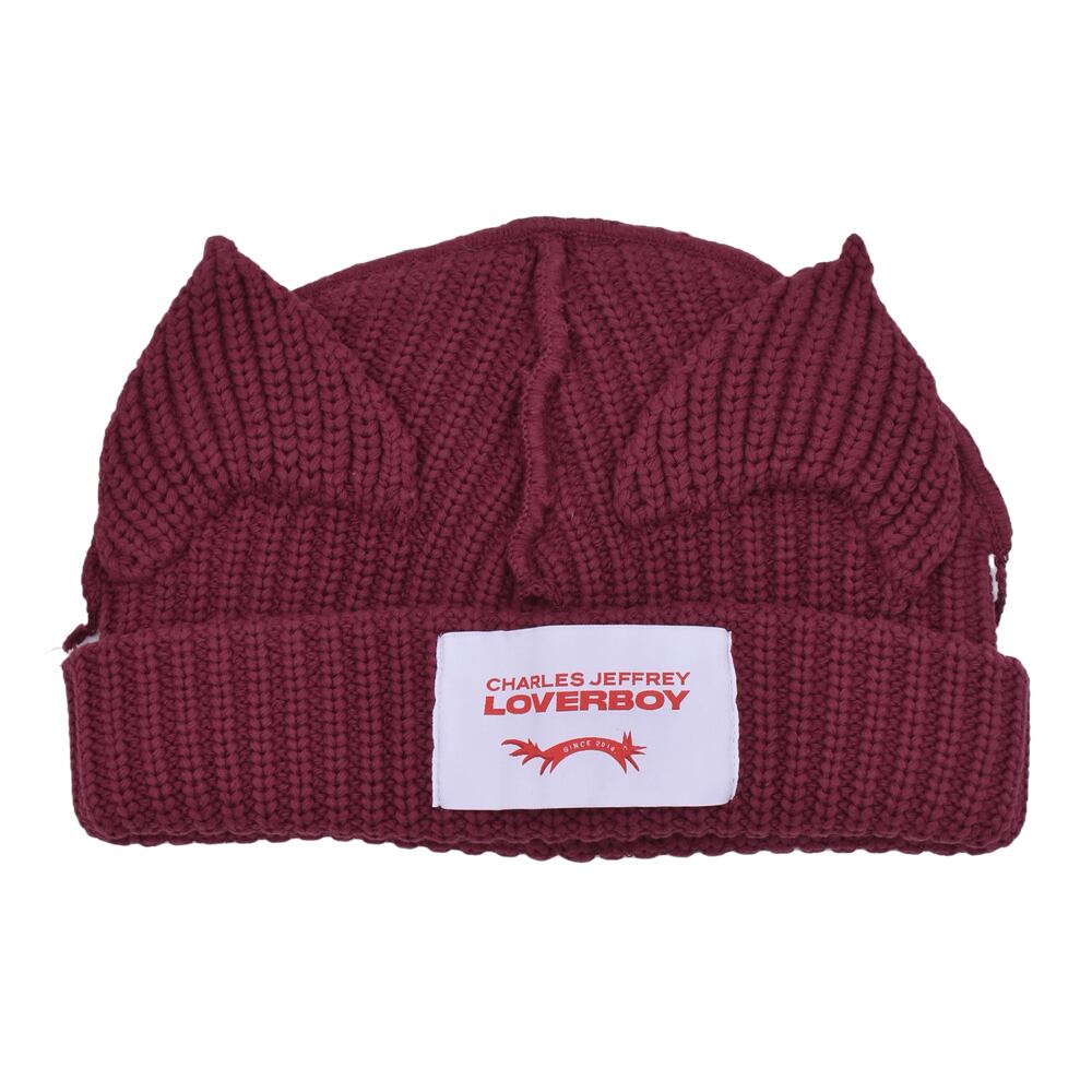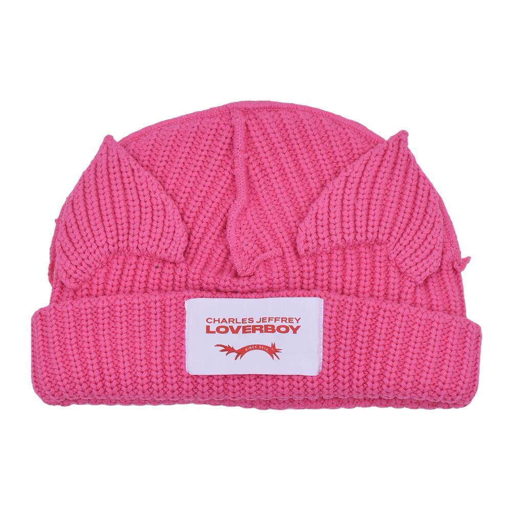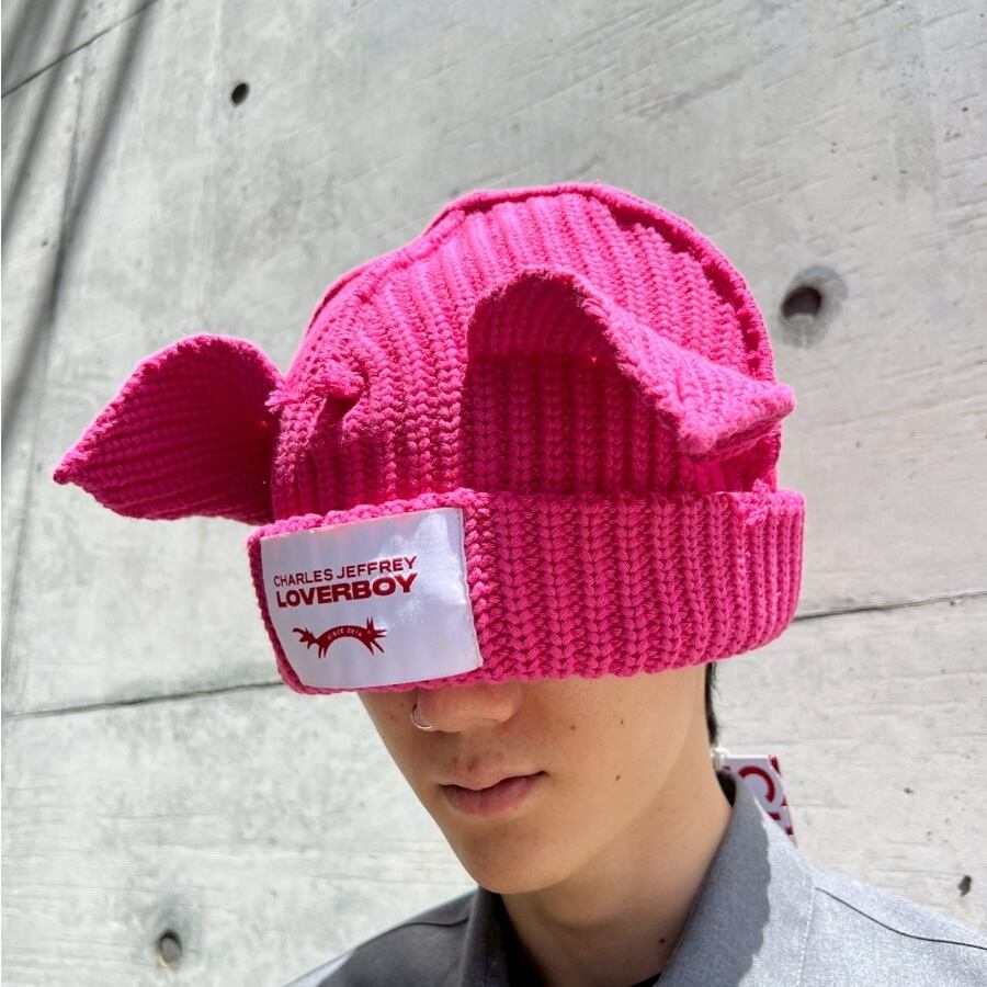 A knit beanie with a unique design shines from the hot brand “CHARLES JEFFREY LOVERBOY” from the United Kingdom. The bright pink color and three-dimensional cat ear details add a playful touch. The front label features the brand's logo and trademark red eyelash motif, creating a great impact. Wearable by both men and women, this item is perfect for accenting your outfits.