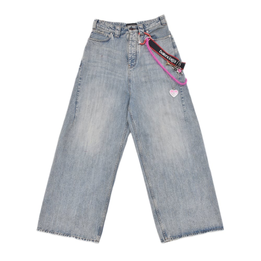 このBalenciaga Charms Baggy Jeansは、ハイウエストで極太のシルエットが特徴のストリート感あふれる一着。ヴィンテージ風のウォッシュ加工が施され、個性的なチャーム付きキーチェーンがアクセントに。前衛的な美学と実用性を融合したデザインです。