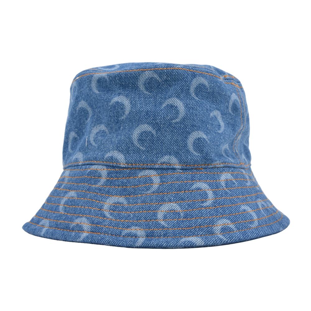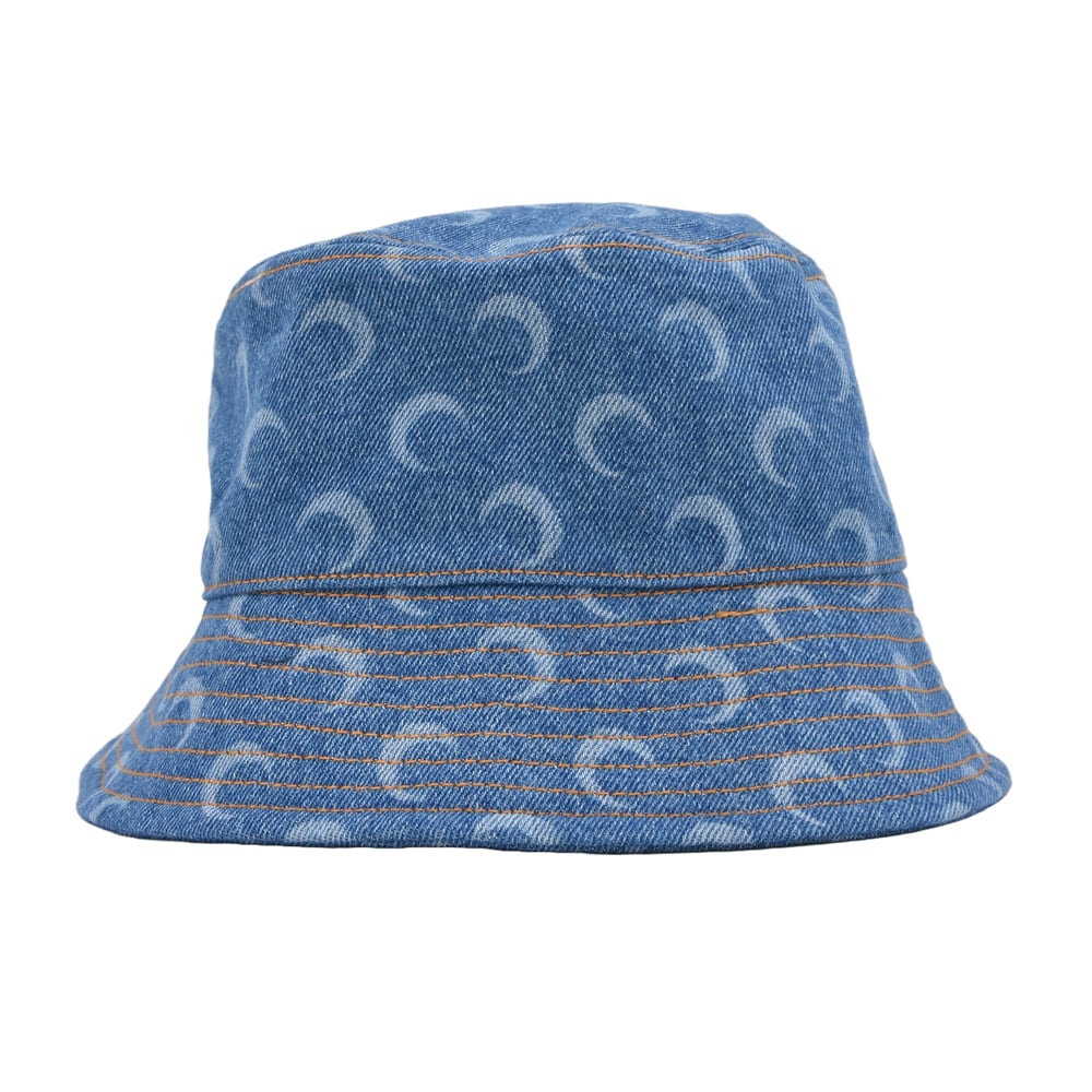 A trendy denim-style bucket hat with the brand's iconic crescent moon pattern scattered throughout.