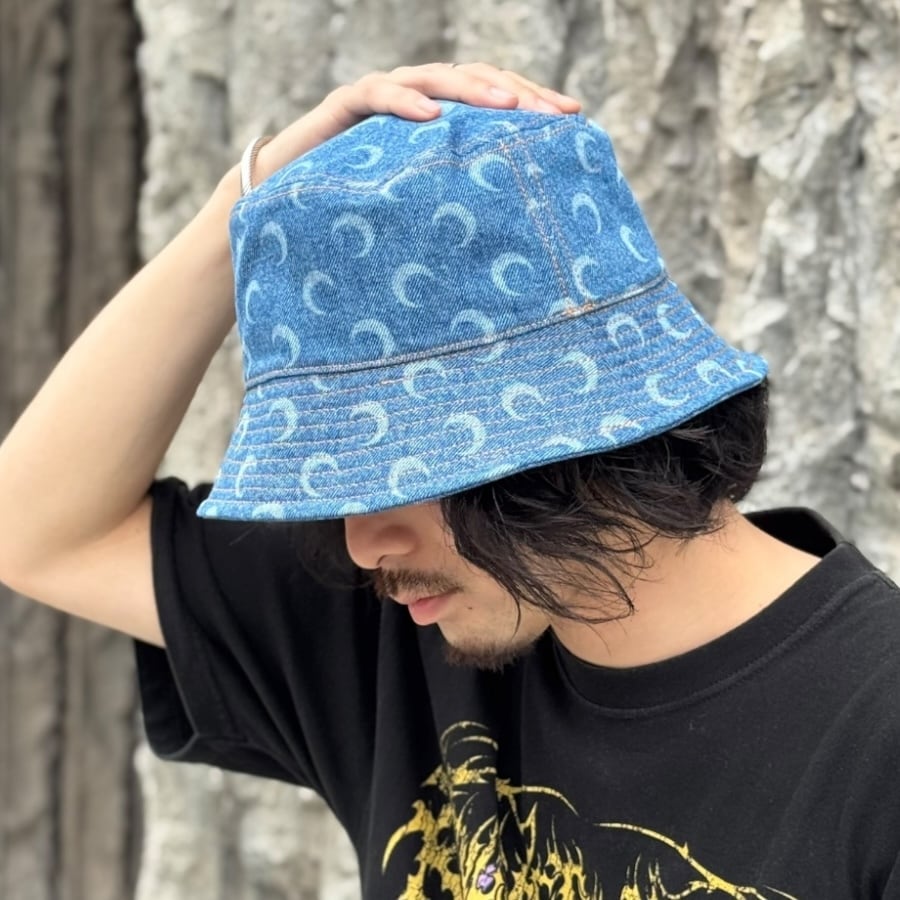 トレンド感あふれるデニム風バケットハットに、ブランドのアイコニックの三日月柄を散りばめた一品。