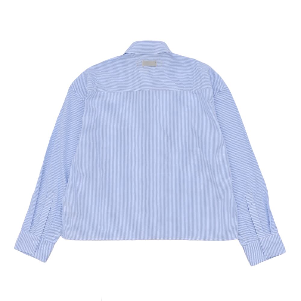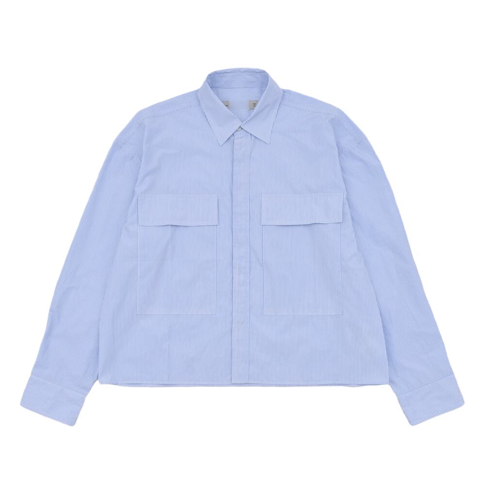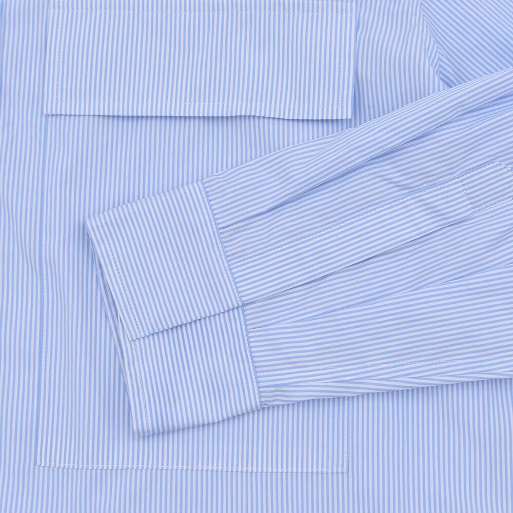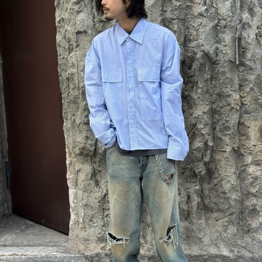 胸ポケットがアクセントになったライトブルーのシャツ。