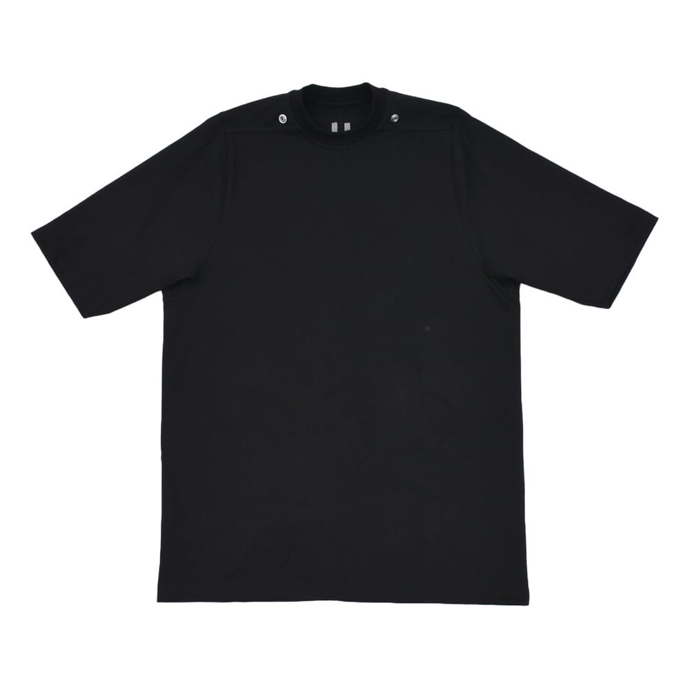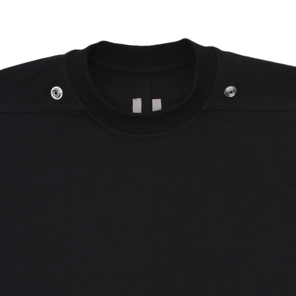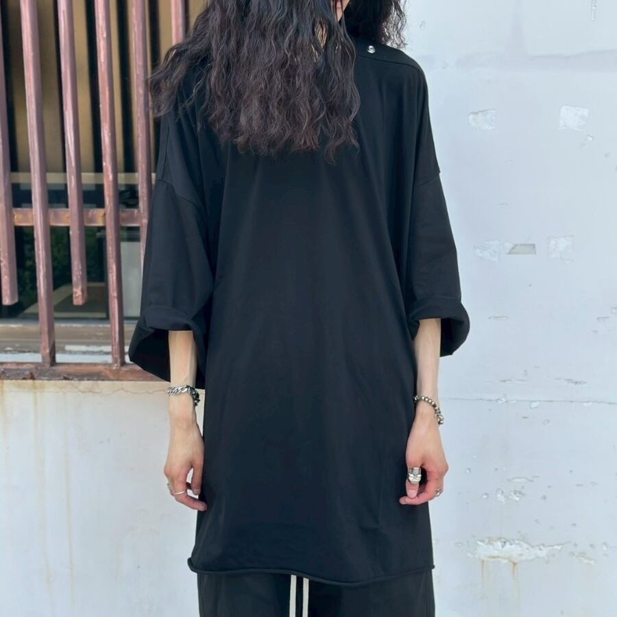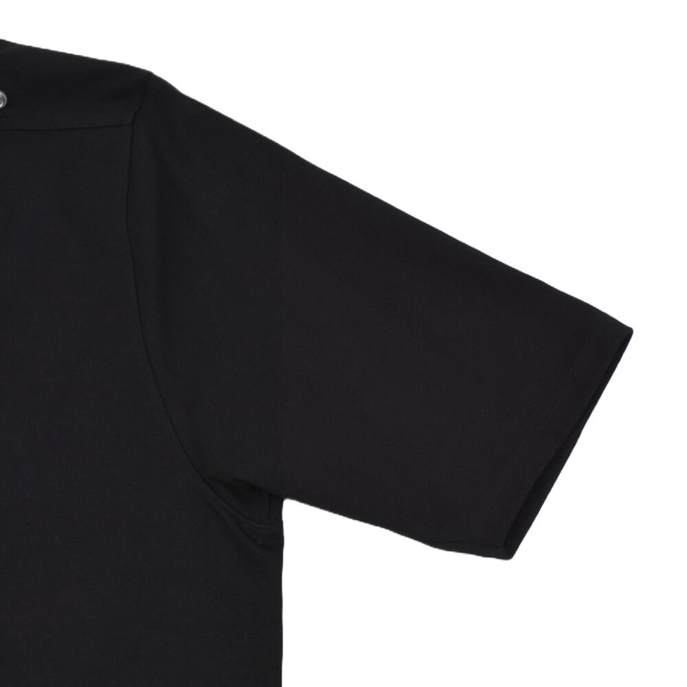 シンプルながらもディテールにこだわった、ブラックのクルーネックTシャツです。肩部分にはスナップボタンが施されており、ミリタリーテイストを感じさせるアクセントに。程よくゆったりとしたシルエットで、リラックス感のある着心地を実現。どんなスタイルにも合わせやすく、カジュアルからモードなコーディネートまで幅広く活躍する一着です。
