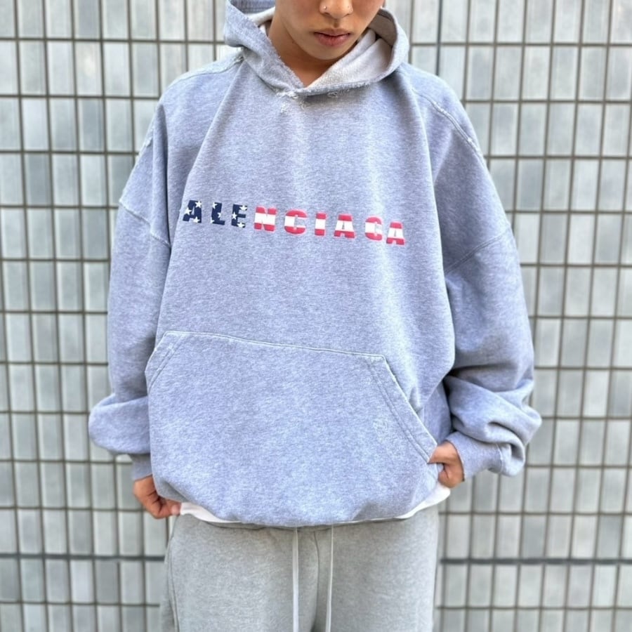 アメリカ国旗モチーフを取り入れた「BALENCIAGA」ロゴが目を引く、グレーのプルオーバーパーカー。柔らかなスウェット生地とゆったりとしたシルエットで、着心地抜群。カジュアルなスタイリングはもちろん、ストリートやモードミックスにもぴったりの一着です。フロントのカンガルーポケットやフード付きのデザインが、実用性とファッション性を両立しています。
