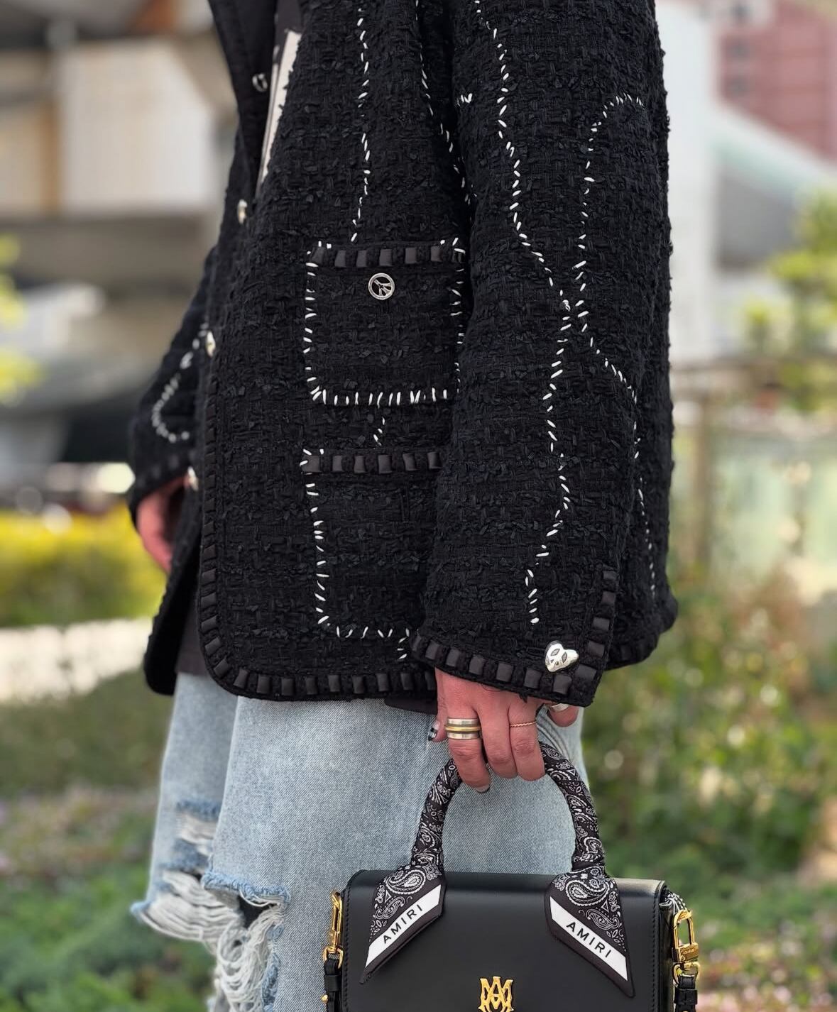 ブランドの特徴であるミリタリーリメイクの美学と、ツイード素材のクラシックな魅力を融合させたこだわりの一着です。