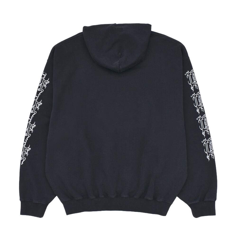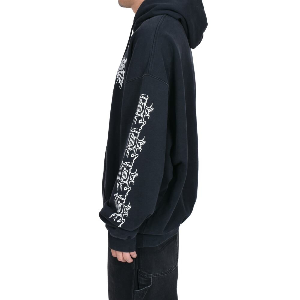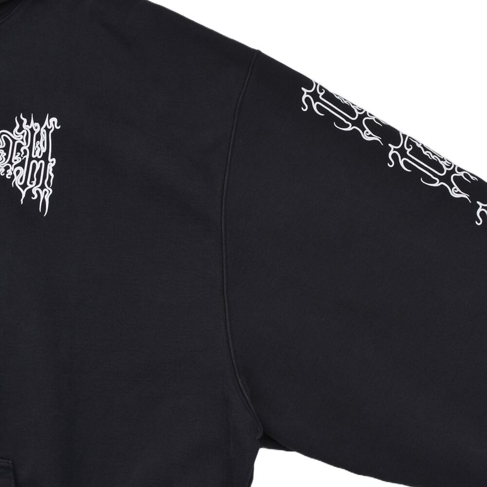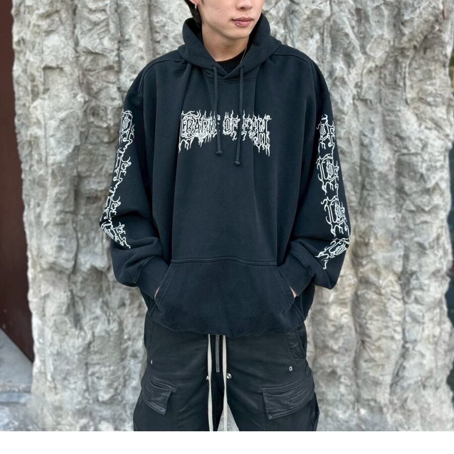 フロントと両袖にあしらわれた鋭利なグラフィックフォントが、ゴシック&メタルなムードを醸し出し、インパクト抜群の一着に仕上がっています。ゆったりとしたシルエットと裏起毛素材で、秋冬のヘビロテアイテムとしても◎。ロック・パンク・ストリートスタイルのアクセントにぴったりの一枚です。