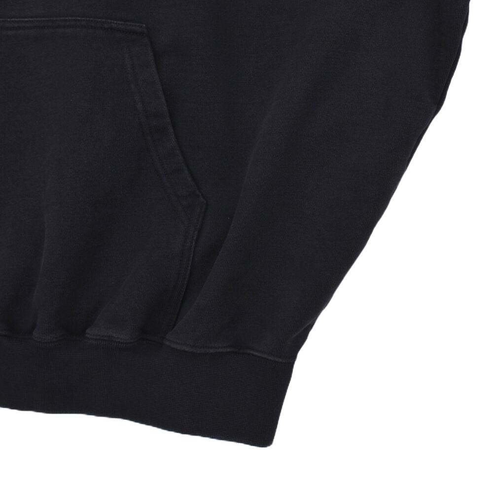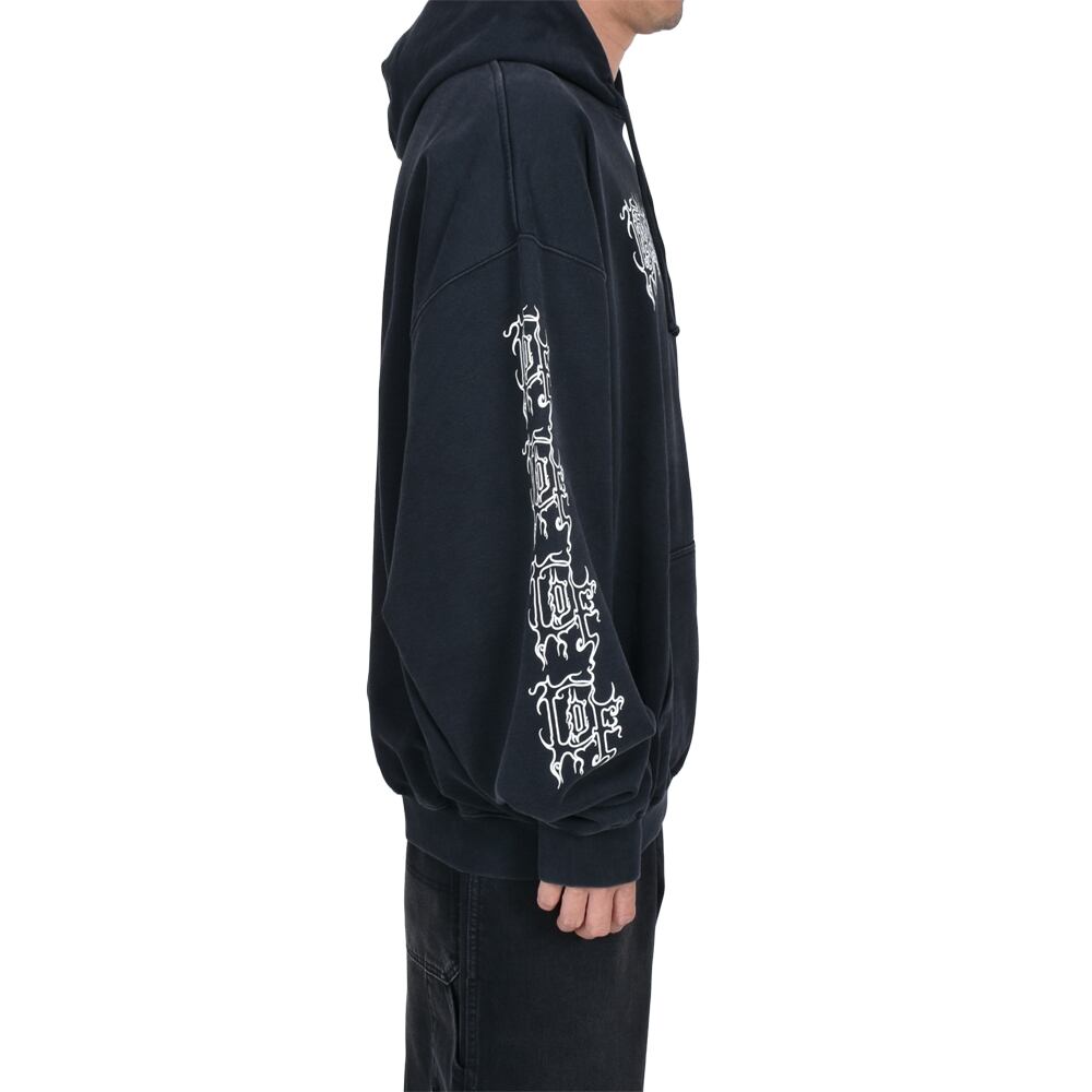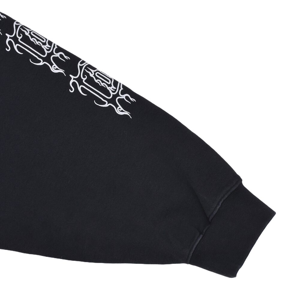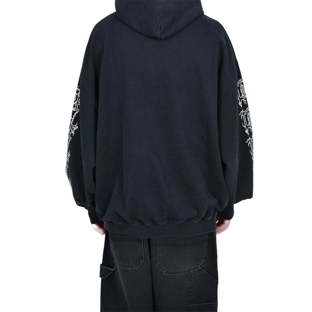 フロントと両袖にあしらわれた鋭利なグラフィックフォントが、ゴシック&メタルなムードを醸し出し、インパクト抜群の一着に仕上がっています。ゆったりとしたシルエットと裏起毛素材で、秋冬のヘビロテアイテムとしても◎。ロック・パンク・ストリートスタイルのアクセントにぴったりの一枚です。