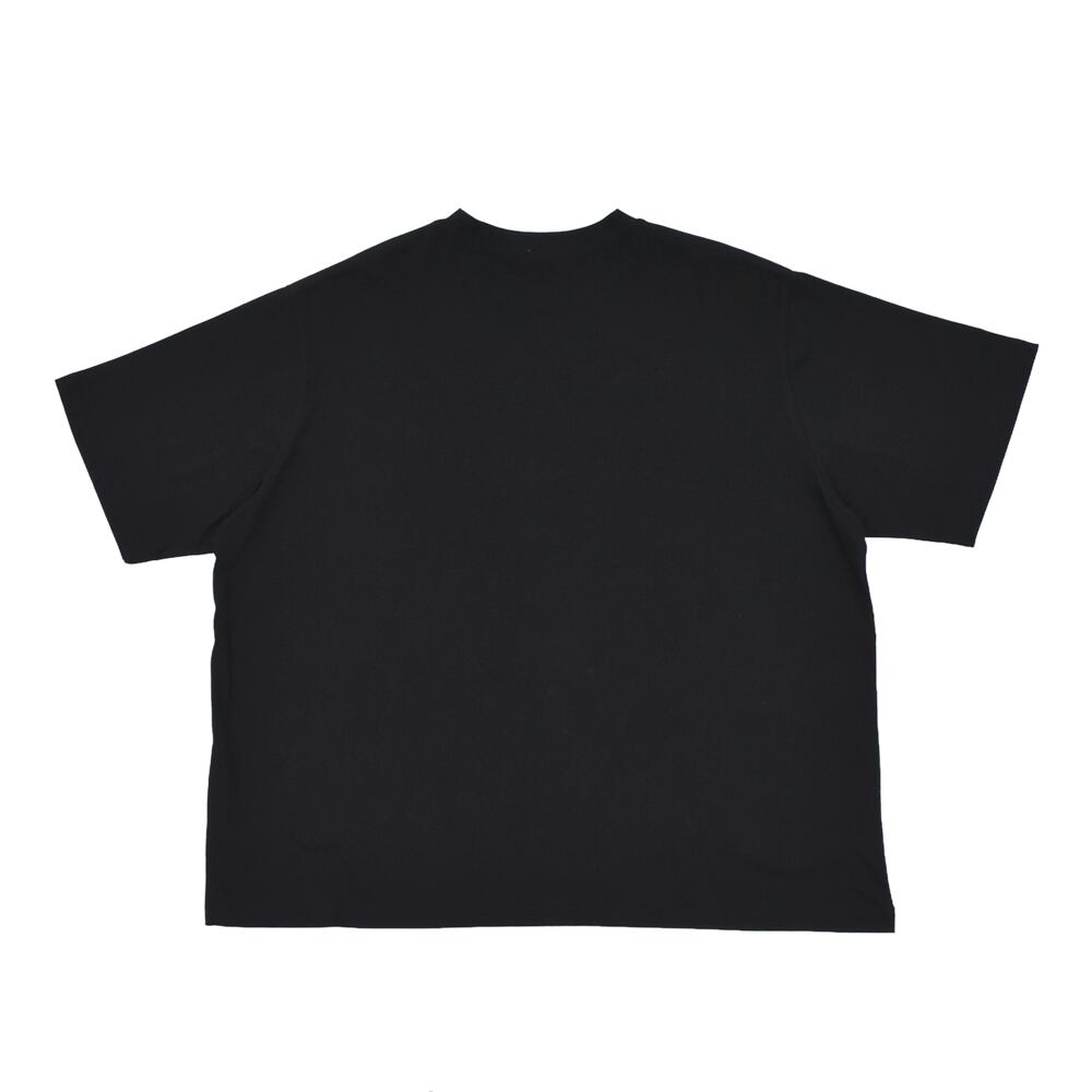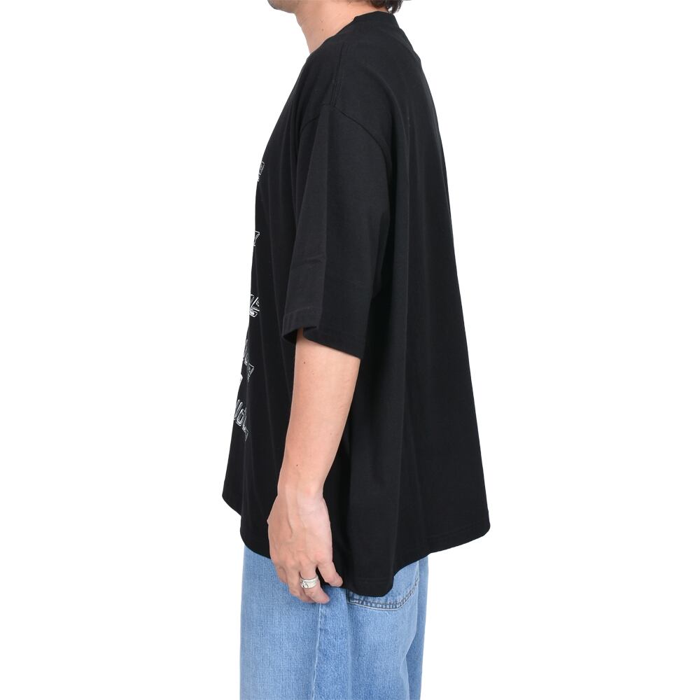 存在感抜群のフロントプリントが魅力のブラックTシャツ。中央に縦に並んだロゴが目を引くデザインで、ストリート感とモード感を絶妙にミックスした一着です。ややゆったりめのシルエットで、トレンドのオーバーサイズスタイルにもぴったり。シンプルながらも印象的なルックスで、コーディネートの主役になるアイテムです。