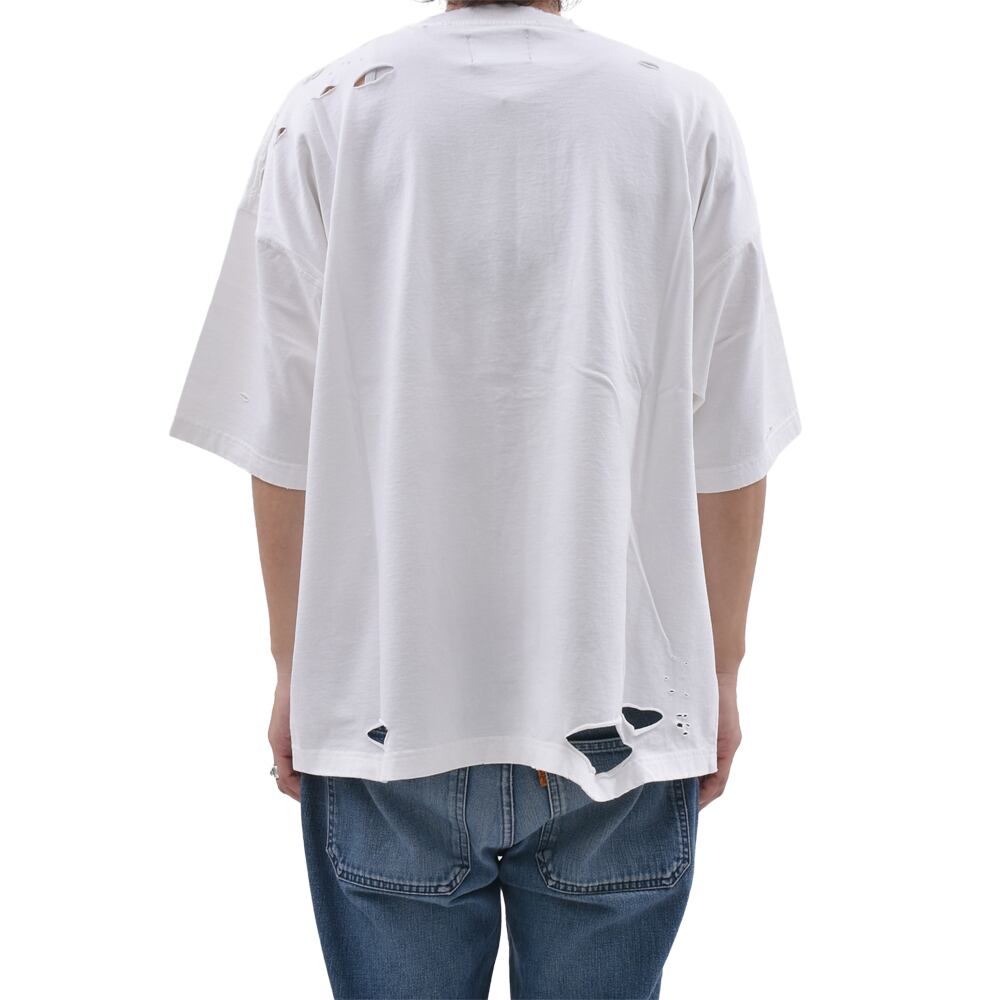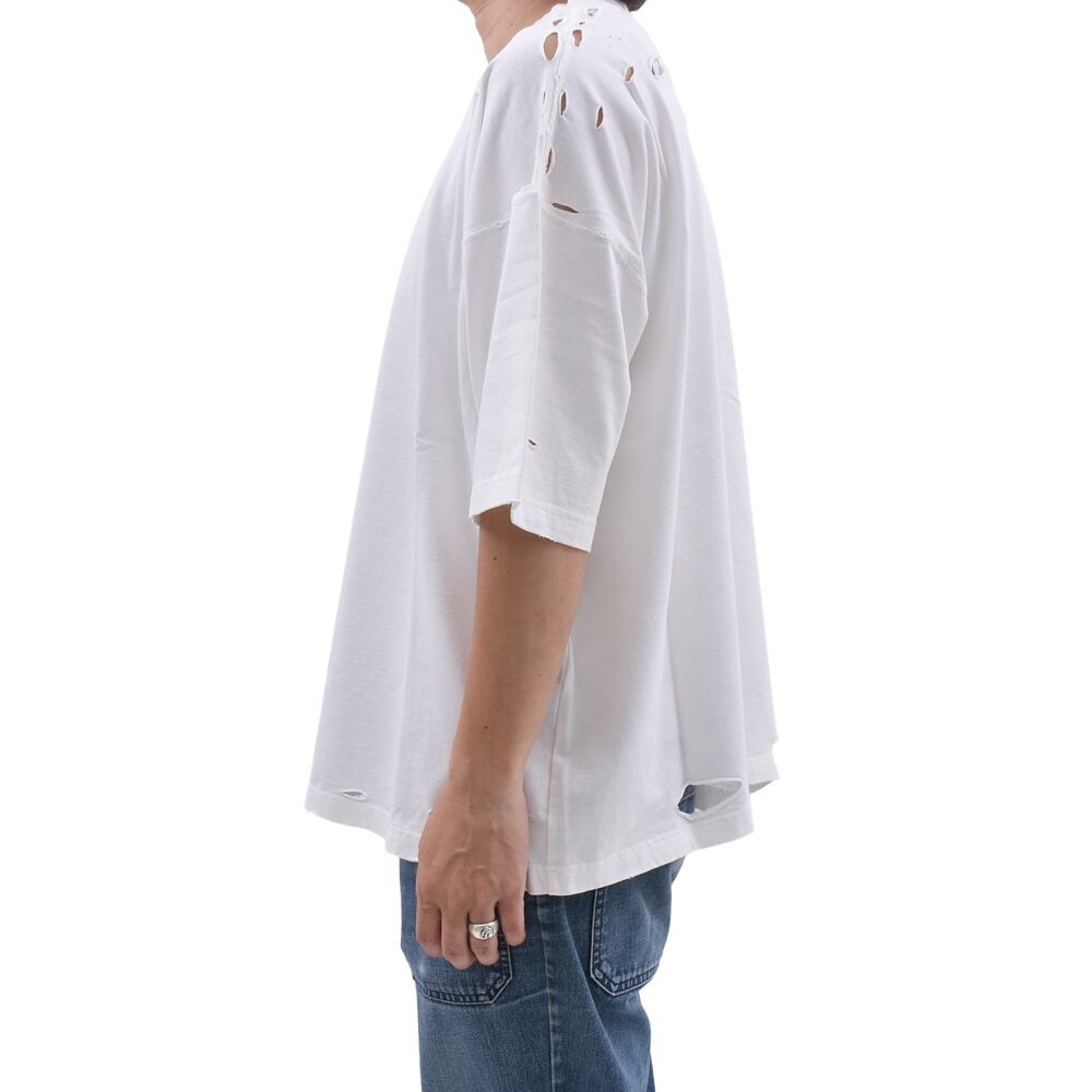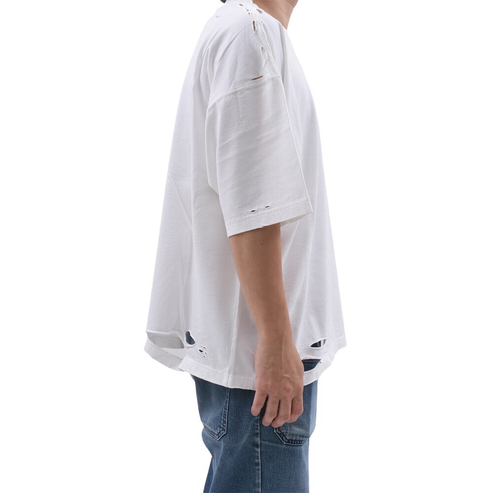This white T-shirt features an appealing minimalist design. Its subtle distressing adds a touch of individuality to a basic look. The relaxed silhouette creates a relaxed feel, making it a versatile piece that can be easily coordinated with any style. It can be worn on its own or as an inner layer under a jacket or shirt.
