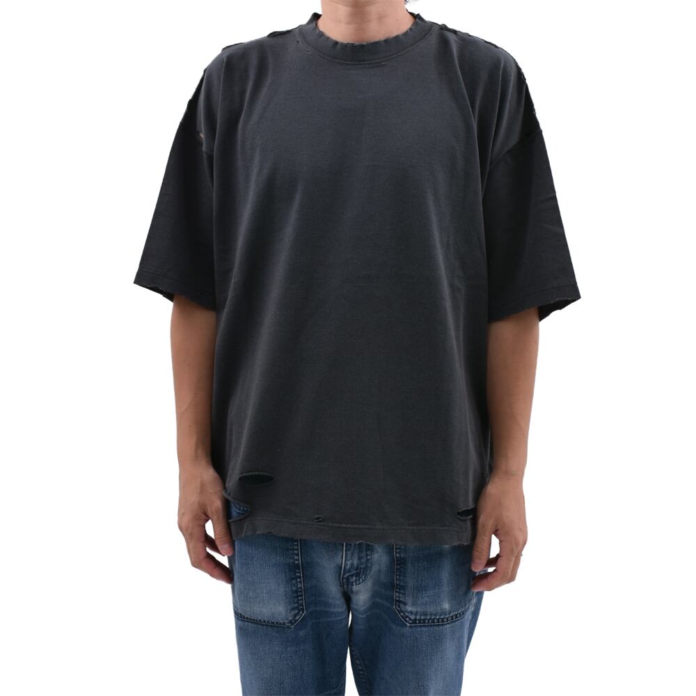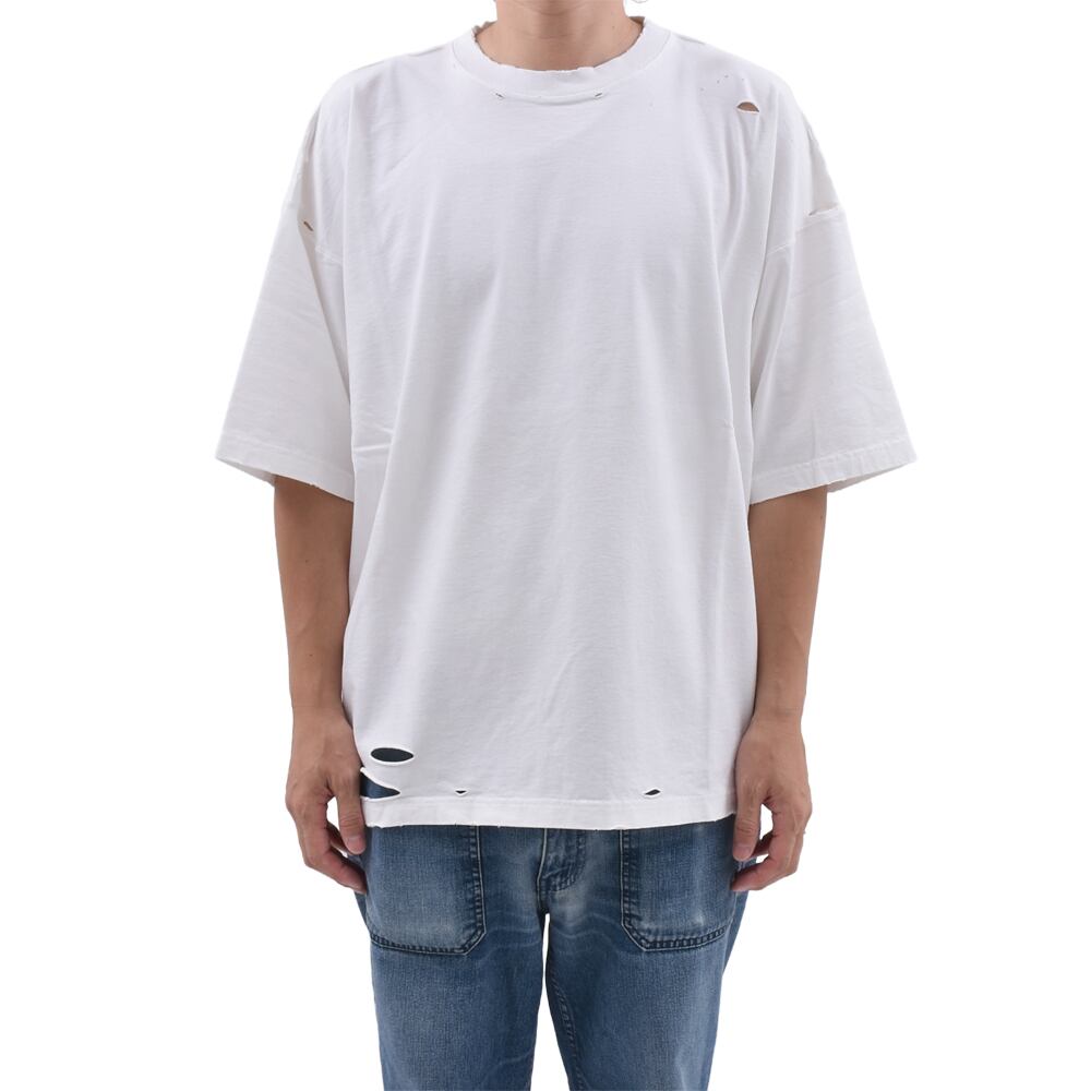 ミニマルなデザインが魅力のホワイトTシャツ。程よいダメージ加工が施され、ベーシックながらも個性をプラスしています。ゆったりとしたシルエットでリラックス感があり、どんなスタイルにも合わせやすい万能アイテム。1枚で着ても、ジャケットやシャツのインナーとしても活躍する一着です。