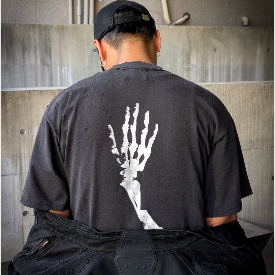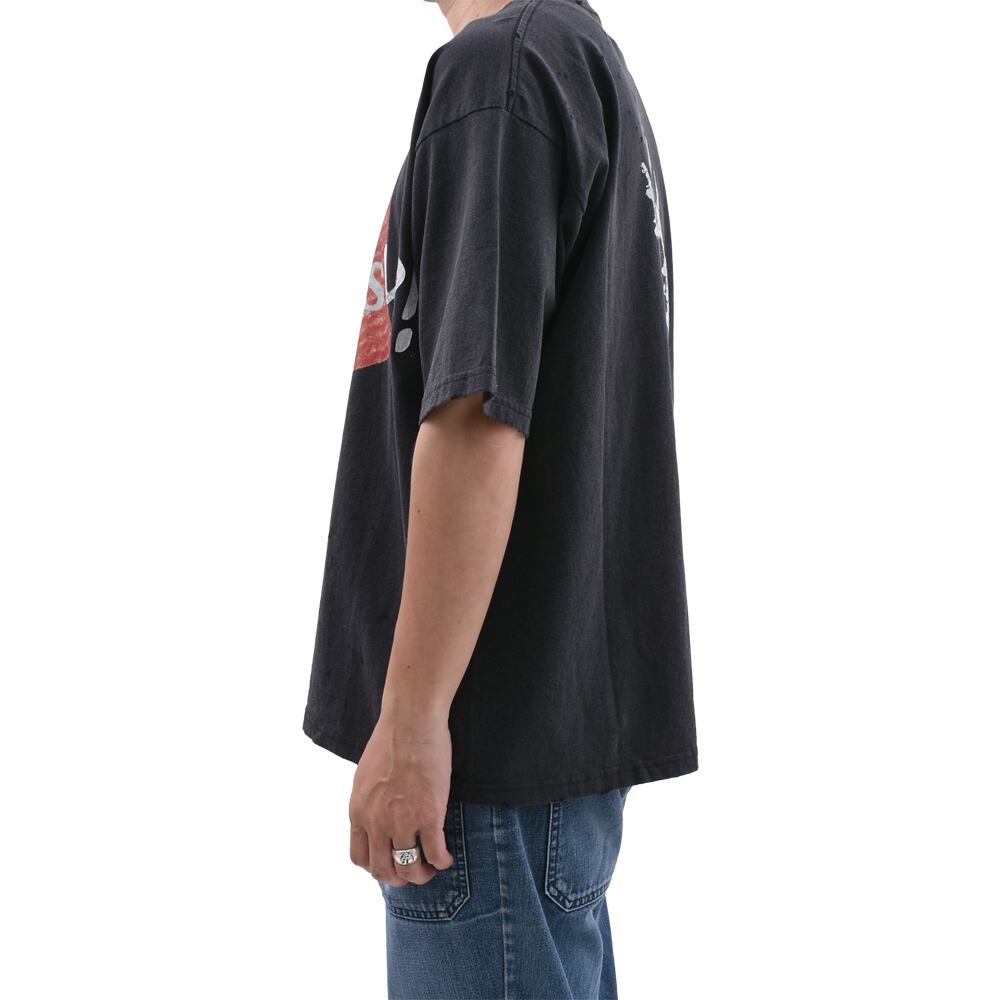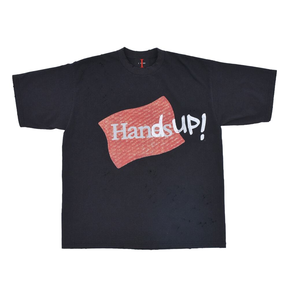 ヴィンテージ感あふれるTシャツ。フロントのHands UP!グラフィックがストリート感のあるアートな仕上がりになっています。程よいダメージ加工や色褪せが、リアルなユーズドライクな雰囲気を演出。ゆったりとしたシルエットで、ラフに着こなすだけでコーディネートの主役になる一枚です。デニムやカーゴパンツとの相性も抜群。