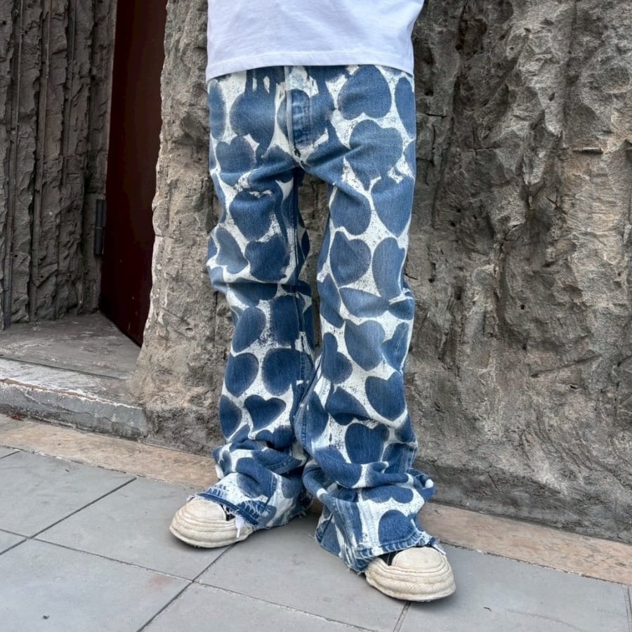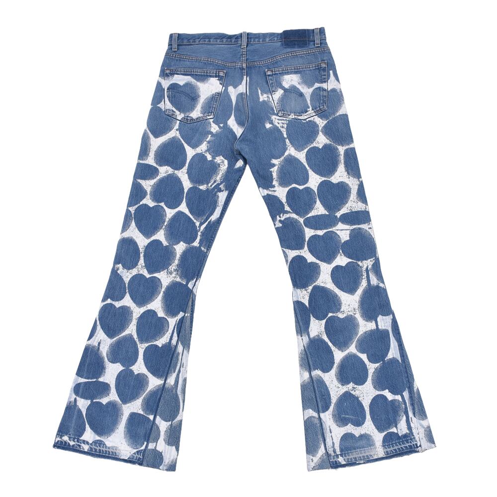 インディゴブルーのデニムにホワイトのブリーチ加工で大きなハートを全体にあしらったデザインが特徴的。存在感抜群で、一本でコーディネートの主役になるアイテムです。裾に向かって広がるフレアシルエットがレトロかつスタイリッシュな雰囲気を演出。Tシャツやスウェットなどシンプルなトップスと合わせるだけで、遊び心あるファッションが楽しめます。