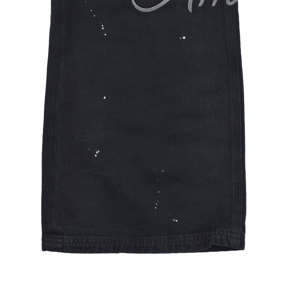 These are black denim pants with a strikingly unique design. They feature bold patchwork-style processing and distressed detailing on the front, blending vintage vibes with a street style. With a moderately wide silhouette, you can enjoy a trendy look. Just pairing them with a simple top makes them the centerpiece of your outfit.
