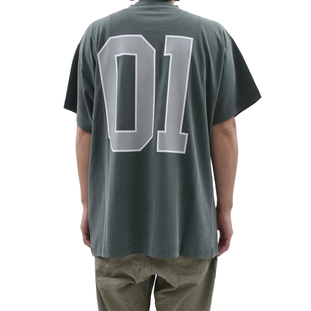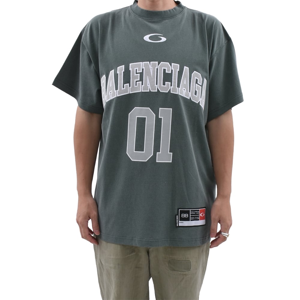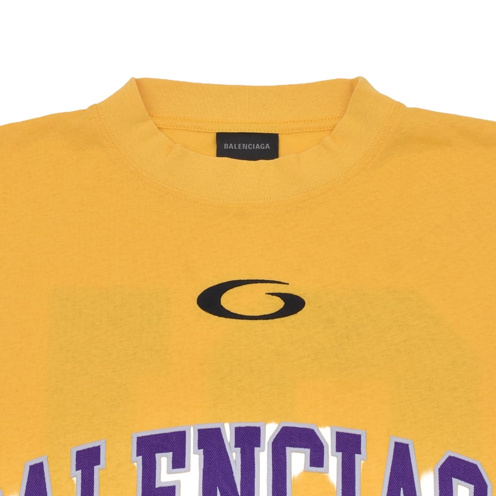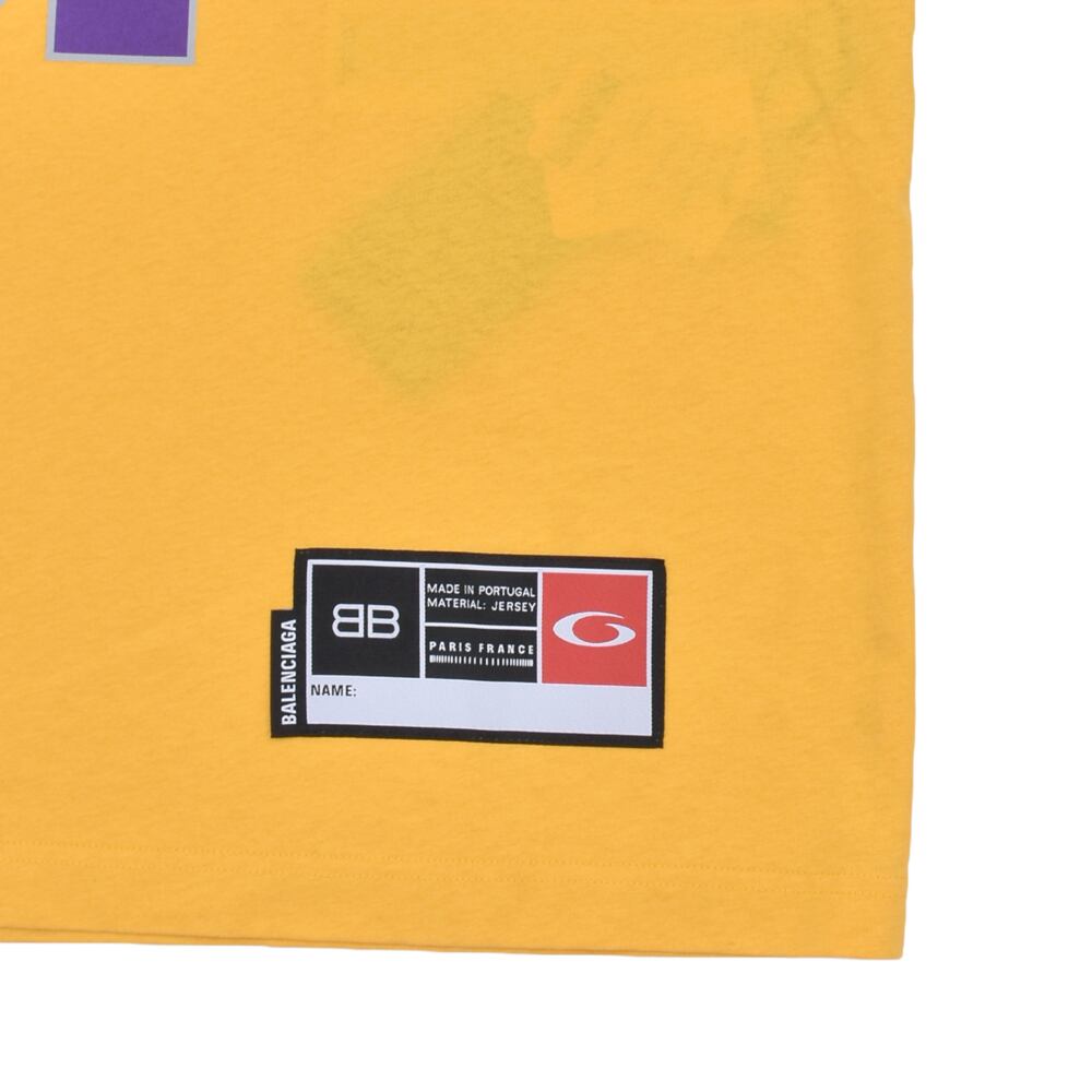 鮮やかなイエローボディに、スポーツユニフォームを思わせるパープルの「BALENCIAGA」ロゴと「01」のナンバリングが映える一枚。胸元にはオーバルロゴ、裾にはチームタグ風のディテールが施され、ストリートとラグジュアリーを融合させたデザインが魅力です。