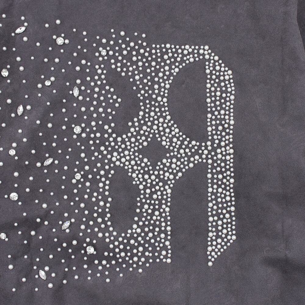 The studs and pearl-like embellishments scattered throughout add a modern touch to the classic checkered pattern. The hem is purposefully cut off, giving it both a casual feel and an edgy design.