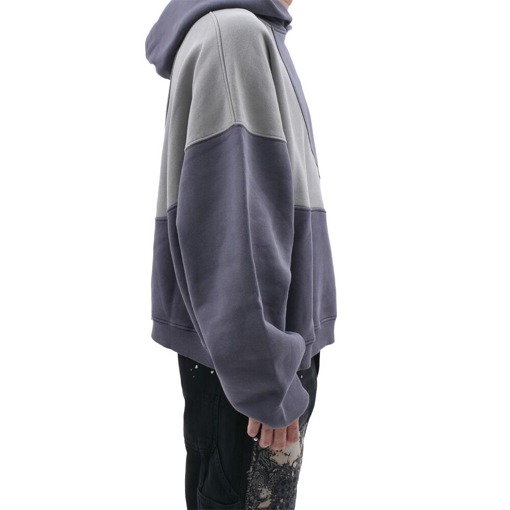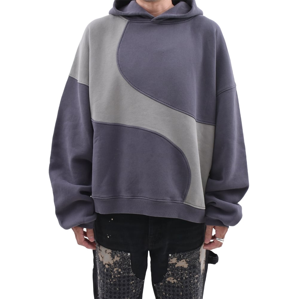 こちらは、ERLらしい遊び心とデザイン性が光るプルオーバーパーカーです。ダークグレーとライトグレーを組み合わせた大胆な切り替えパターンが特徴で、存在感抜群の一着。胸元にはさりげなくブランドロゴが刺繍され、シンプルながらも上品なアクセントに。程よくゆったりとしたシルエットで、リラックスした着心地を楽しめるアイテムです。カジュアルコーデの主役としておすすめ。