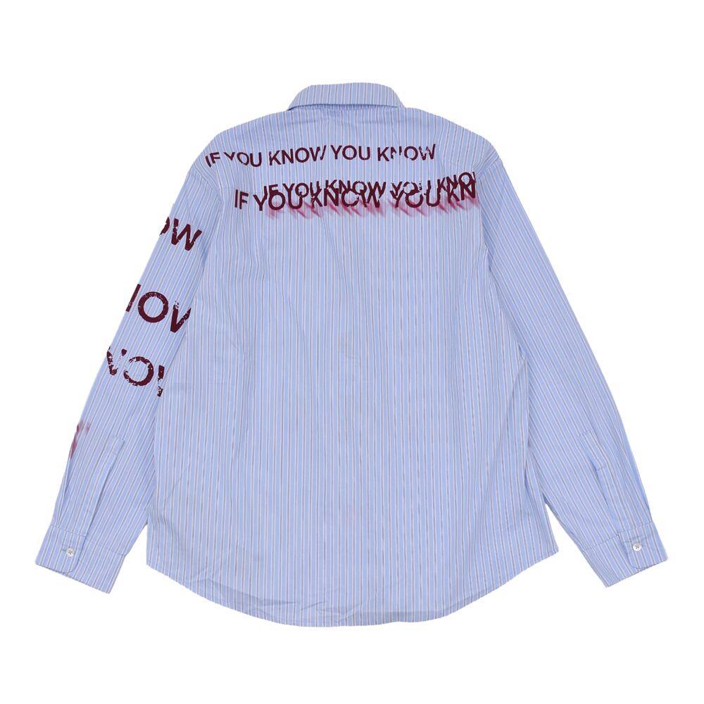 ベースは爽やかなブルーのストライプで、上から「IF YOU KNOW」の文字を大胆にプリントし、ブレたようなグラフィック加工が目を引く個性的な仕上がり。クラシカルなボタンダウンカラーと遊び心のあるデザインが絶妙に融合しており、1枚で主役級の存在感を発揮します。カジュアルなスタイリングはもちろん、ジャケットのインナーとしてもおすすめのアイテムです。