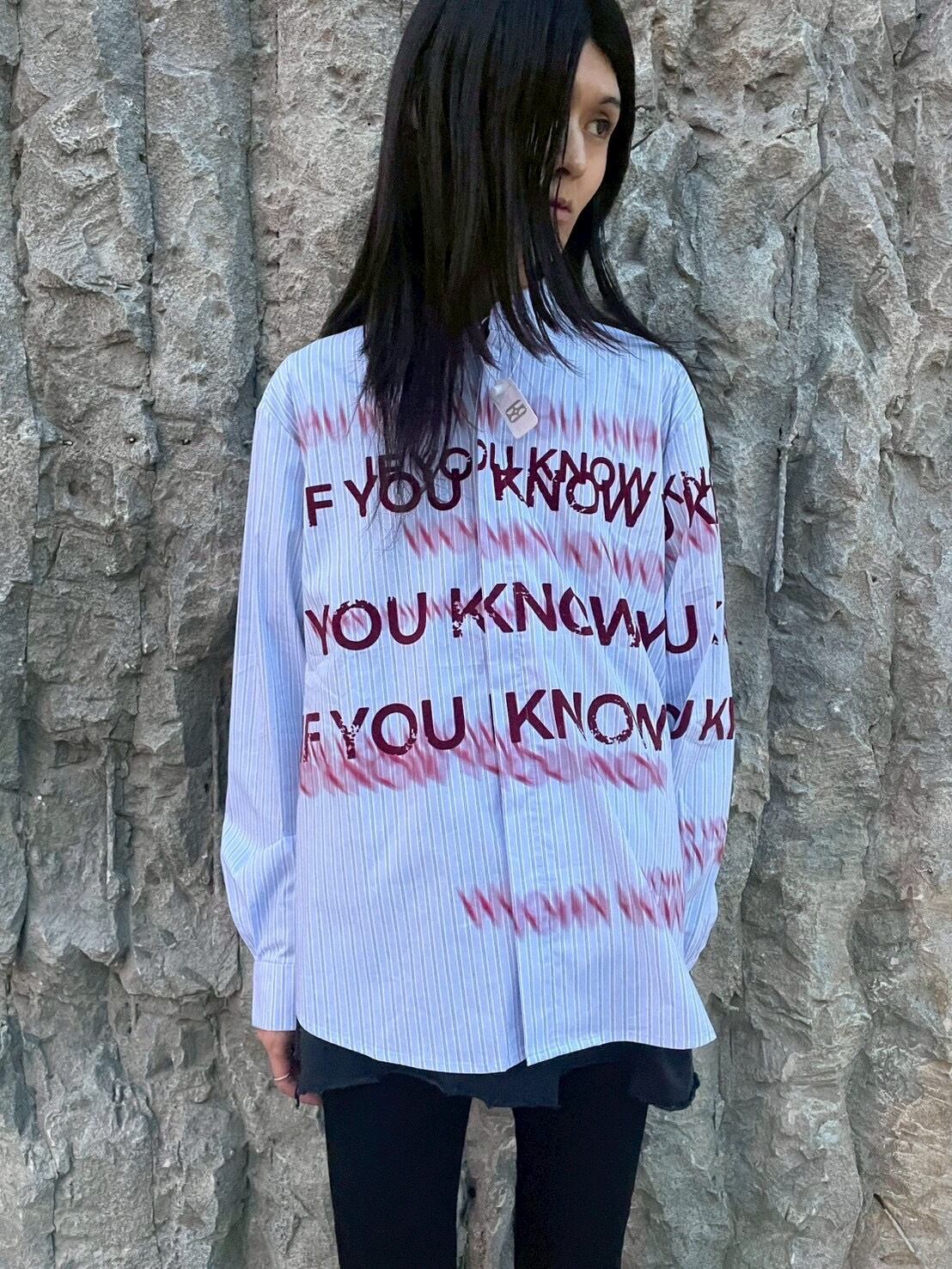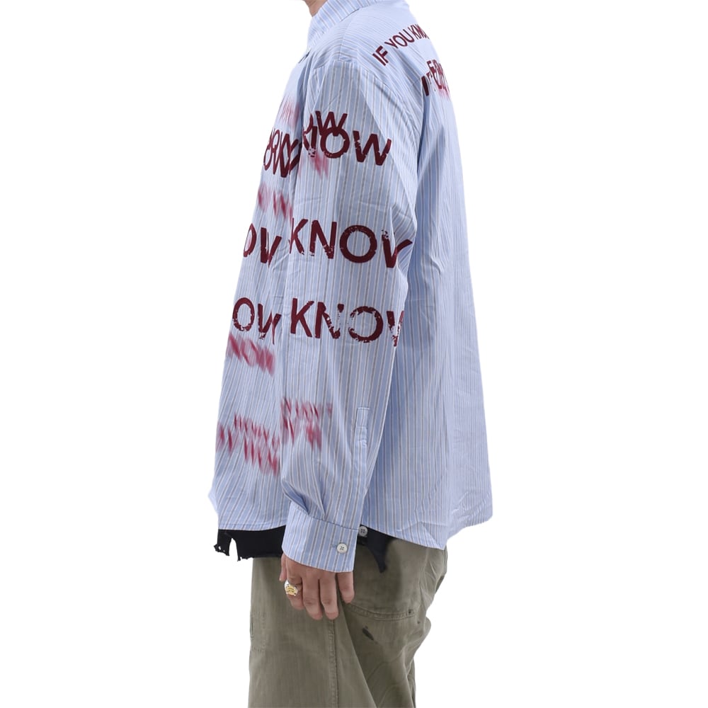 The base is a refreshing blue stripe with the words "IF YOU KNOW" boldly printed on top, and the blurred graphic processing gives it an eye-catching, unique finish. The classic button-down collar and playful design are exquisitely combined to create a piece that stands out on its own. This item is recommended not only for casual styling, but also as an inner layer under a jacket.