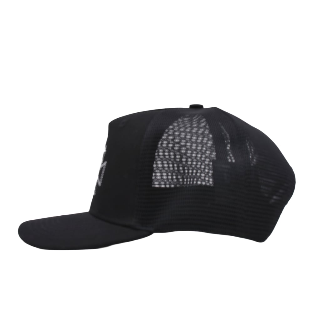 こちらは、フロントにスタッズ風のデザインが施されたブラックメッシュキャップです。