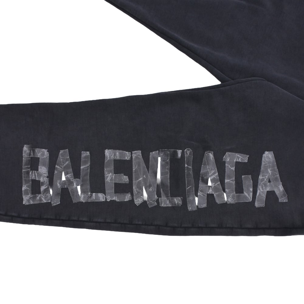 These sweatpants feature a striking washed black color with a vintage feel. They offer a relaxed fit for comfortable wear, while the bold 'BALENCIAGA' logo on the side enhances their street style vibe. The cut-off hem adds a casual, effortless touch. When paired with a hoodie of the same design, they create a standout, cohesive look.