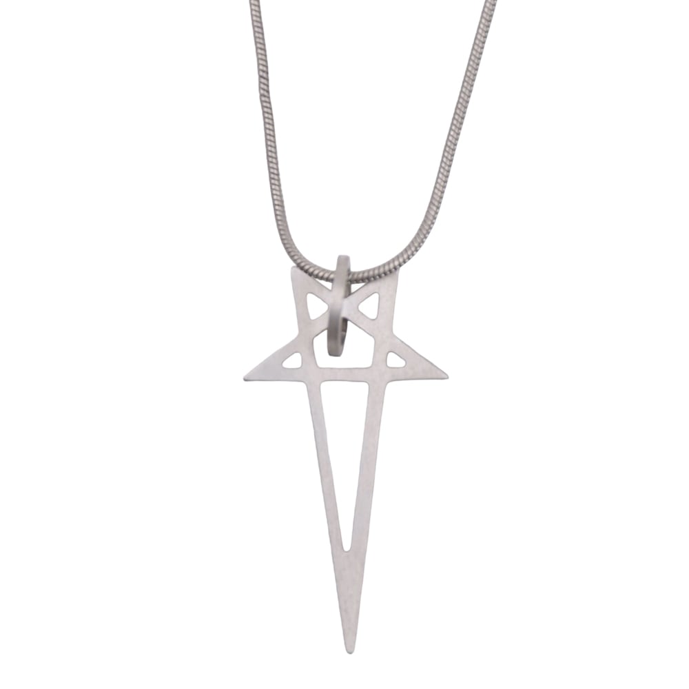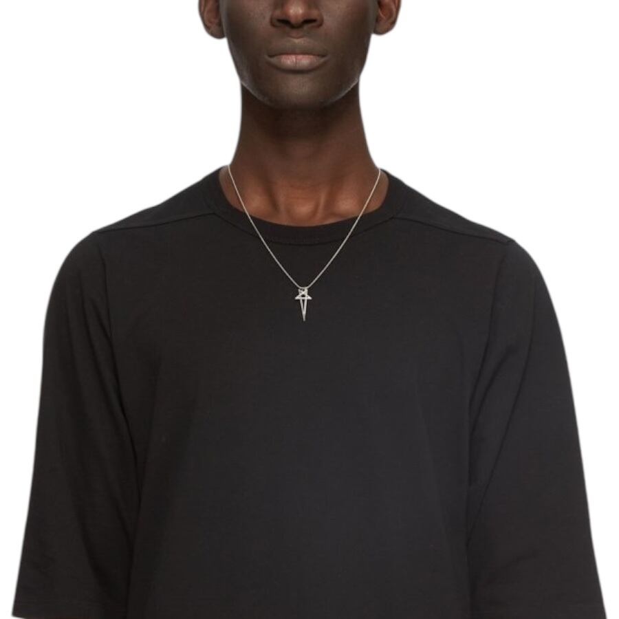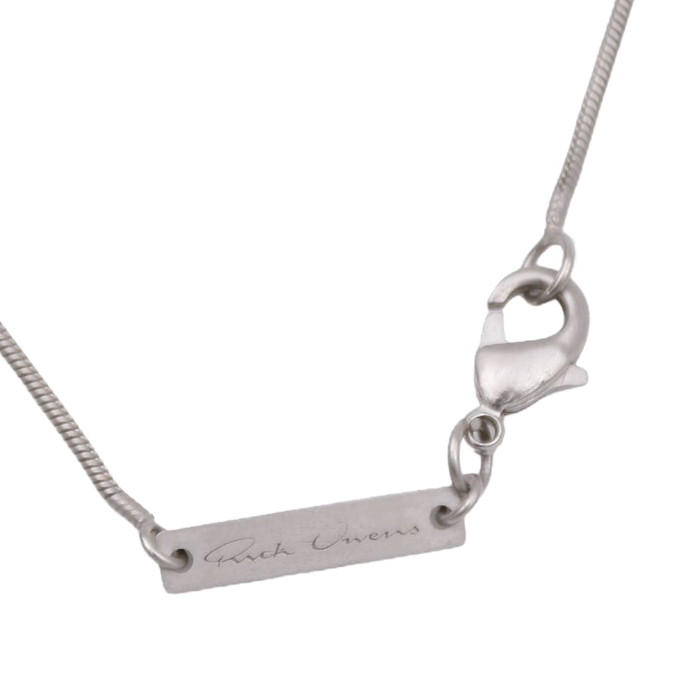 THIS PENTAGRAM CHARM NECKLACE HAS A SMALL PENTAGRAM CHARM, HANGING FROM A SNAKE CHAIN NECKLACE. IT HAS THE RICK OWENS LOGO ENGRAVED ON A SMALL PLATE ATTACHED TO THE CHAIN AND HOOK CLOSURE.