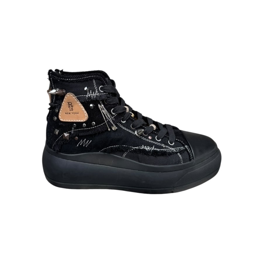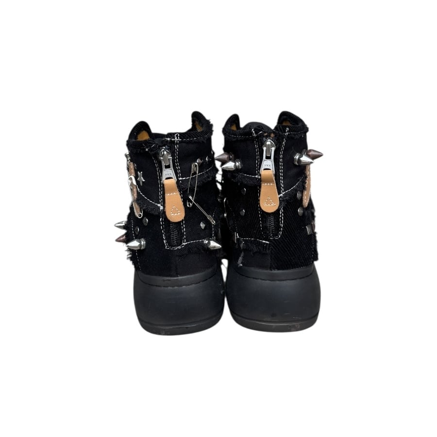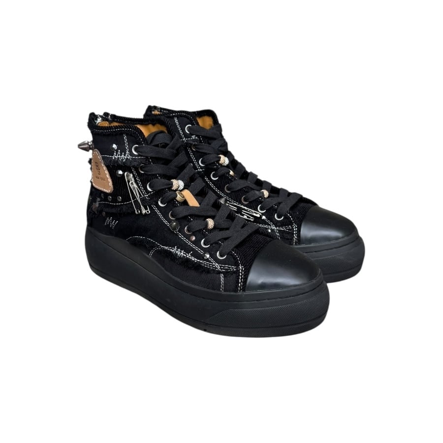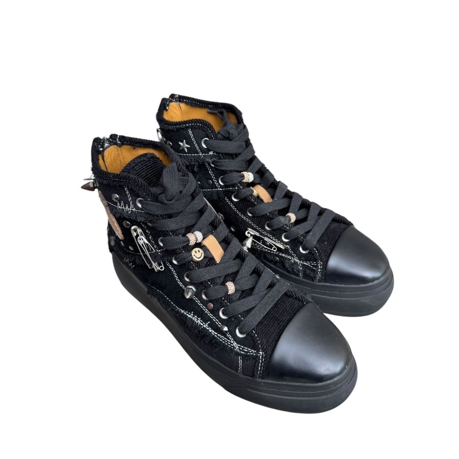 High-top sneakers with a street-style design. The black canvas is highlighted with white stitching, and subtle punk details such as smile pins and safety pin decorations enhance individuality. The thick sole provides stable comfort. This pair matches not only casual styles but also fashion-forward or vintage mix looks.