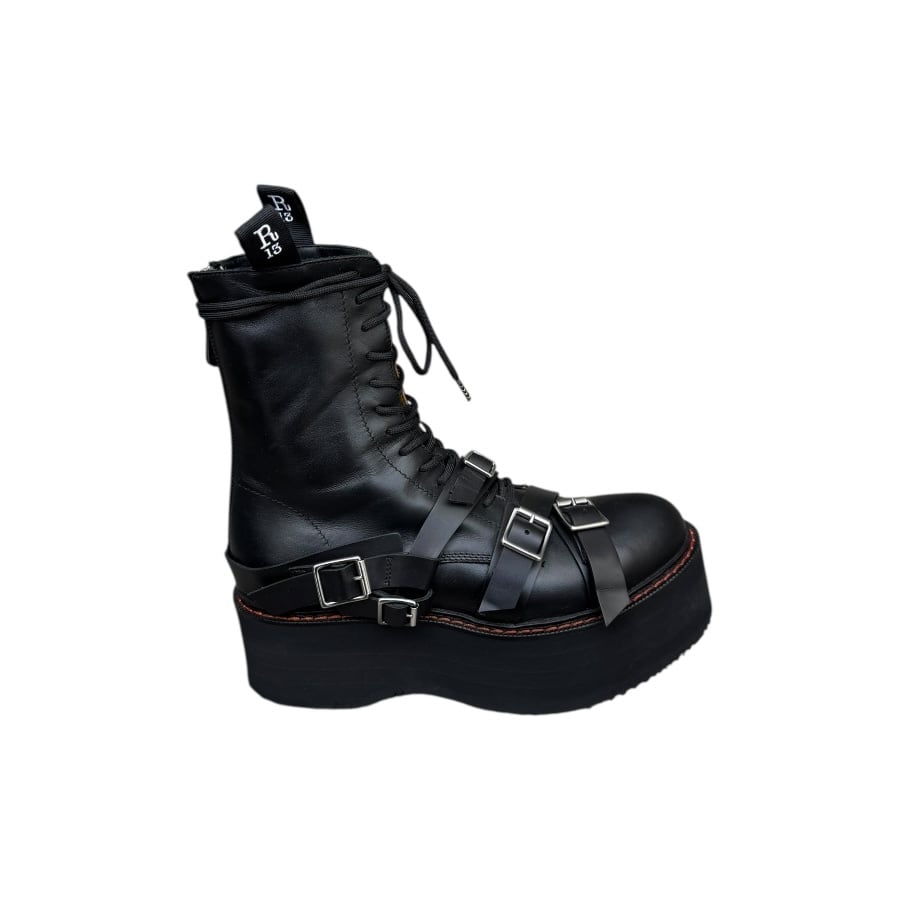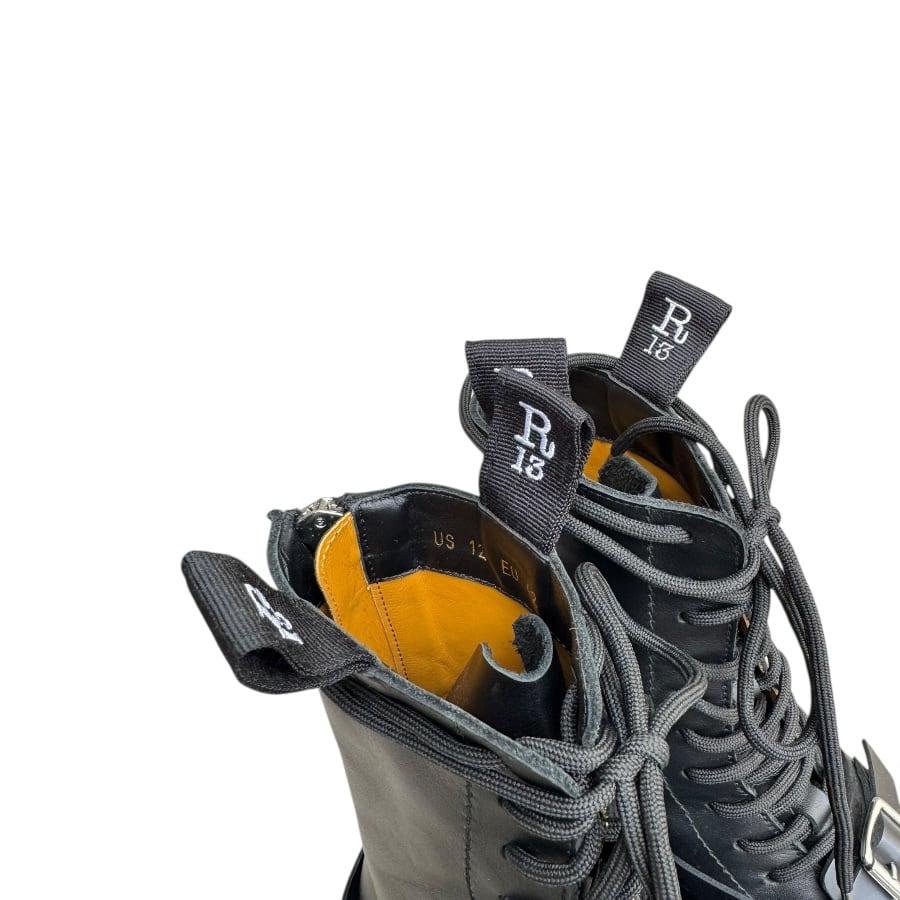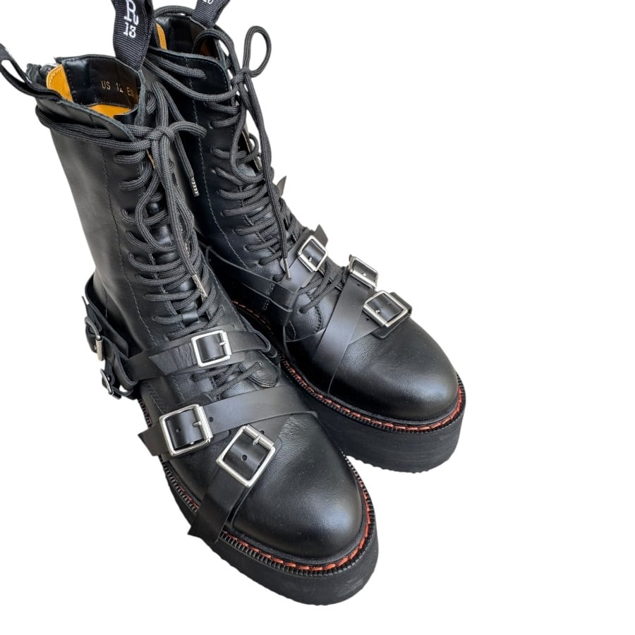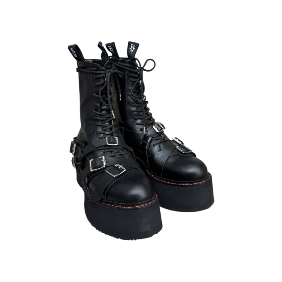 Sturdy and striking lace-up boots. The thick sole and robust buckle strap create an impact that epitomises a rock style. Made from high-quality leather, they combine toughness with luxury. Perfectly matched with skinny denim or a biker jacket, these boots are the star of any outfit.