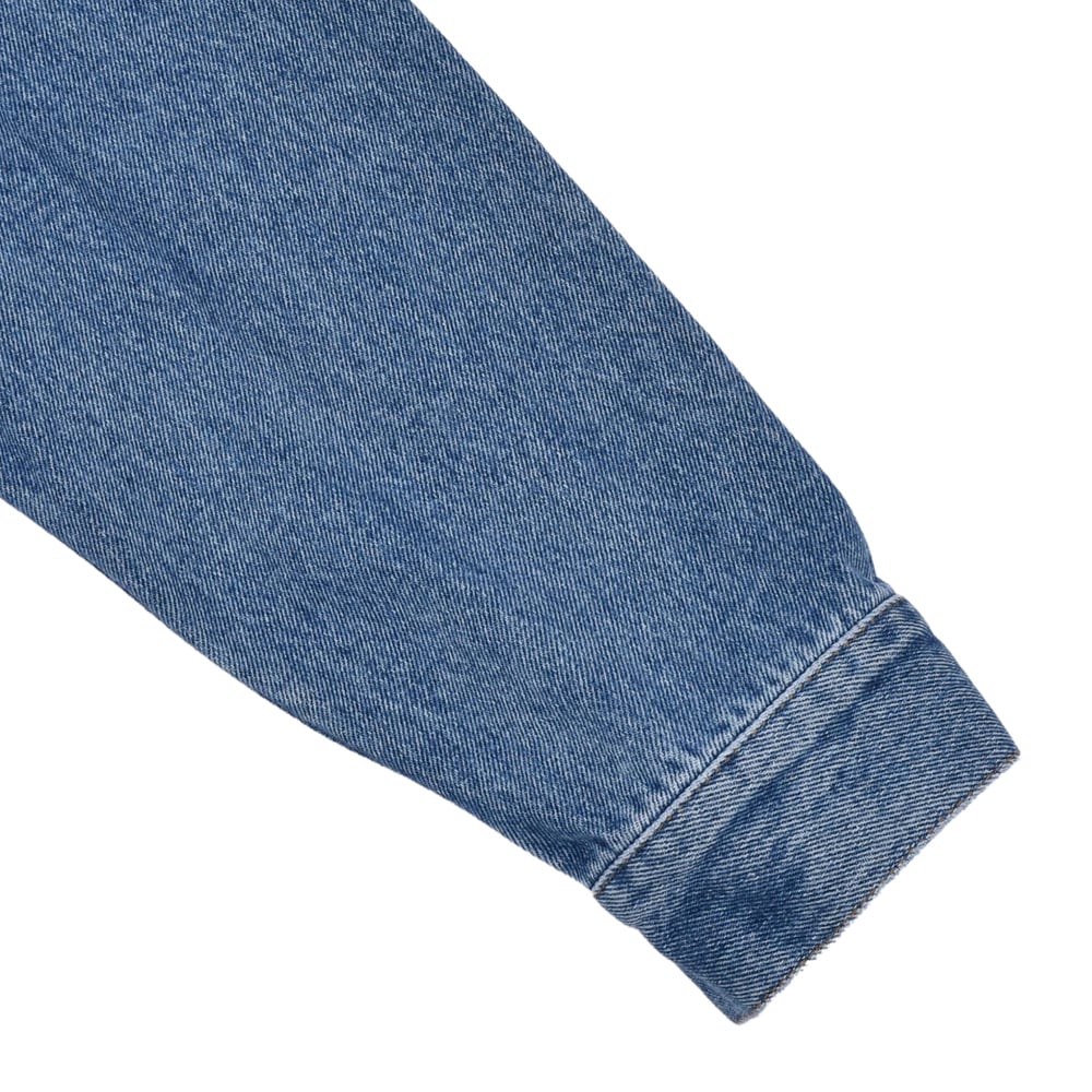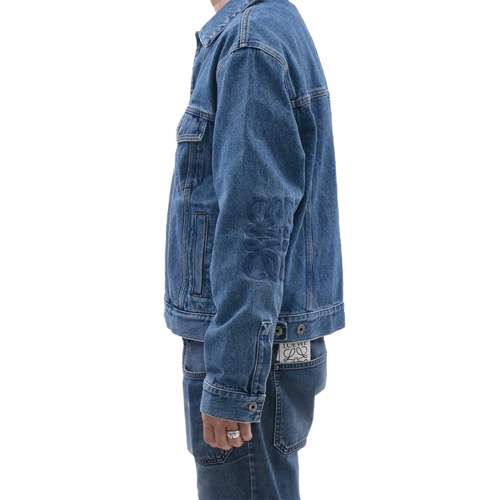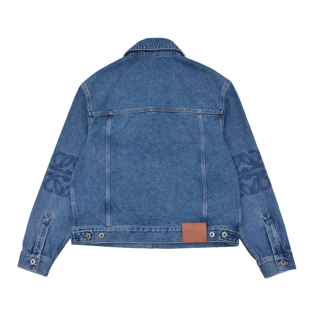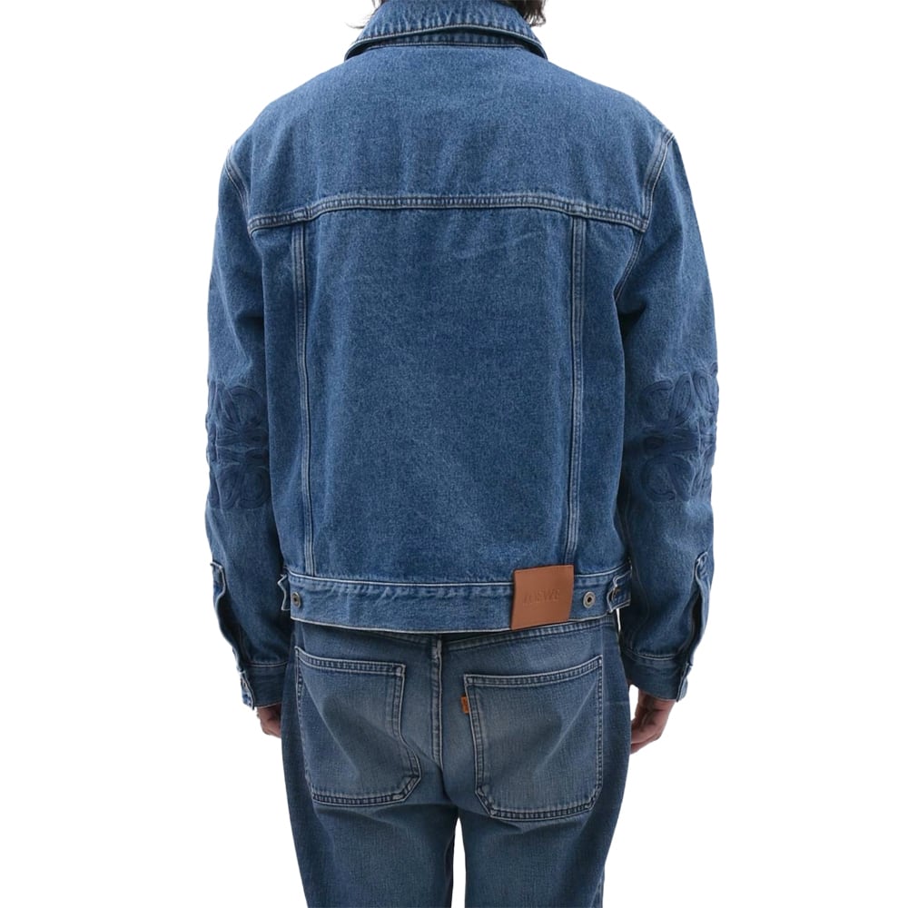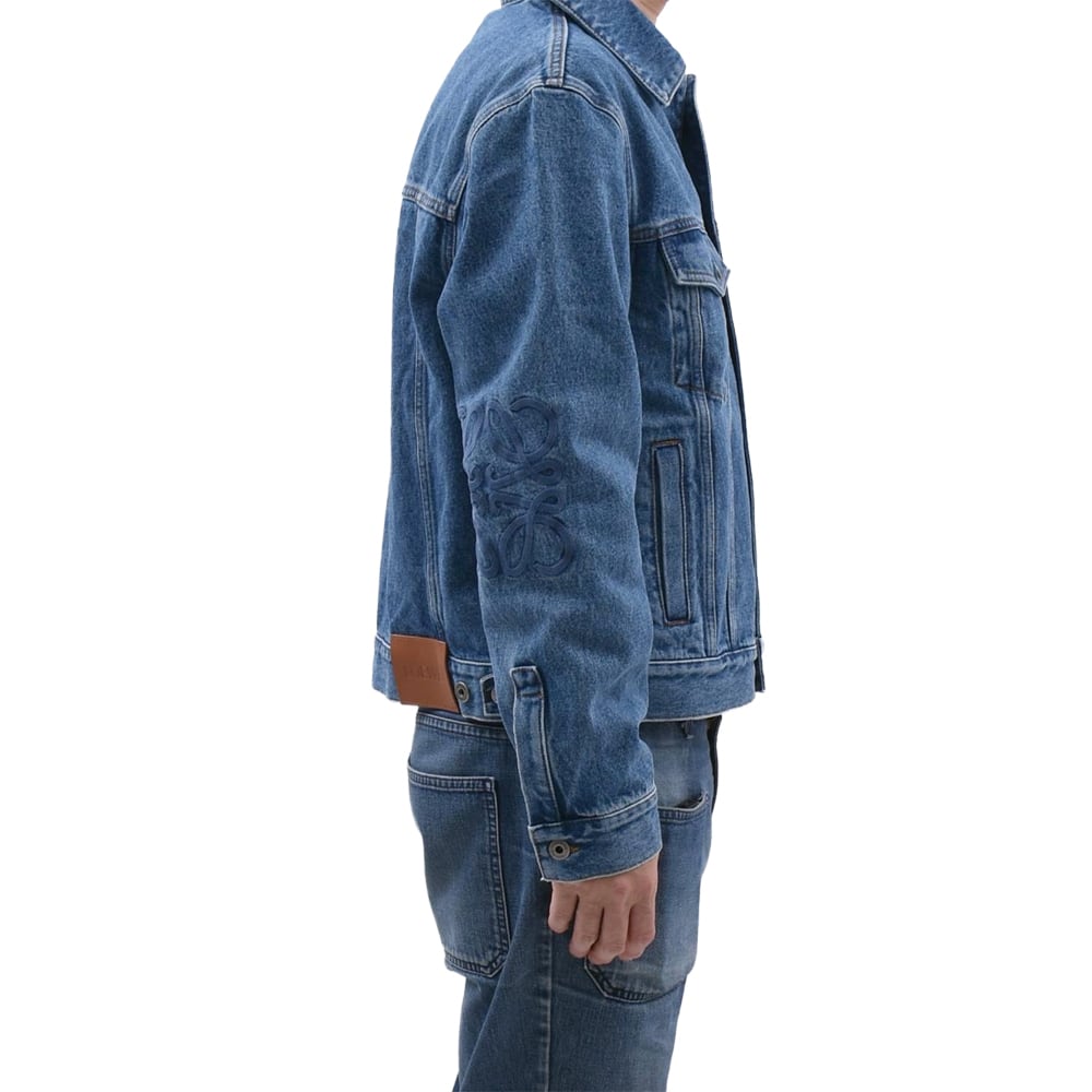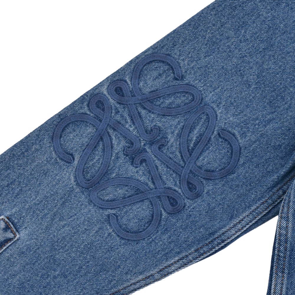 A jacket made from medium-weight washed cotton denim. An anagram embroidery is featured on the elbows.