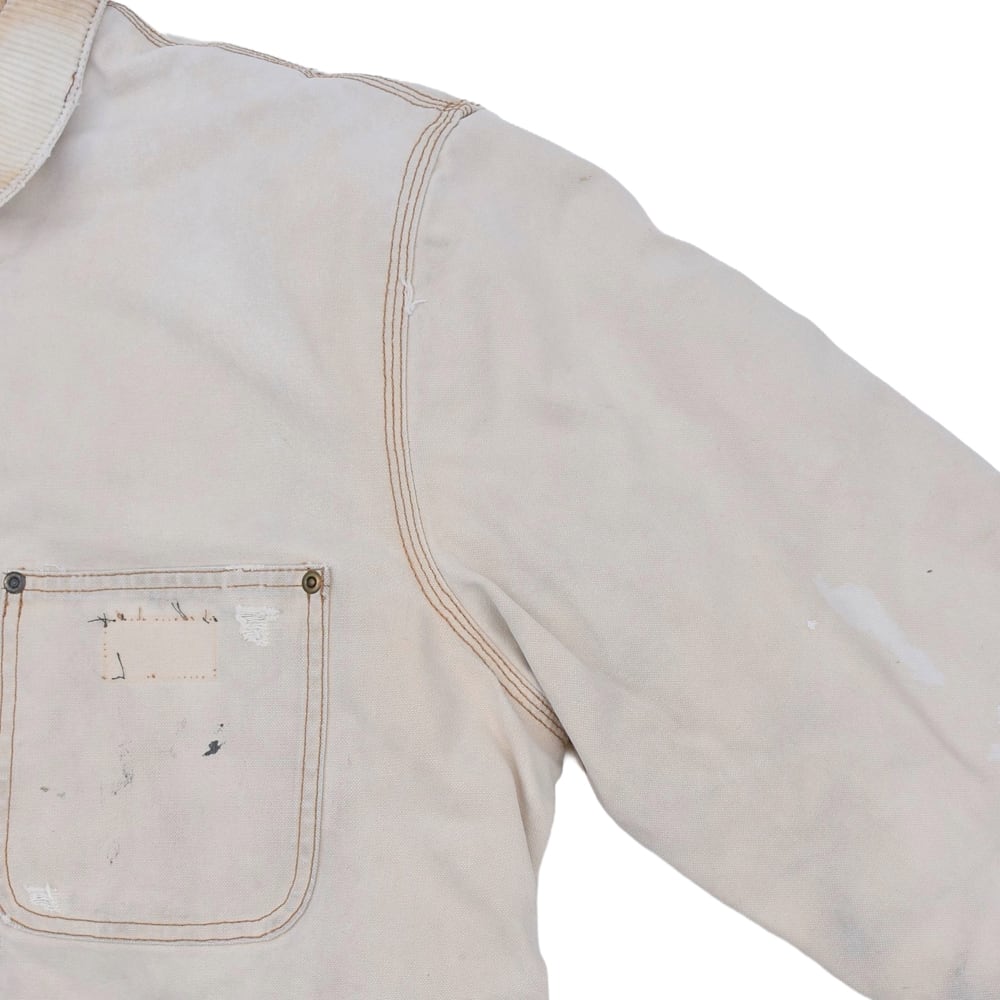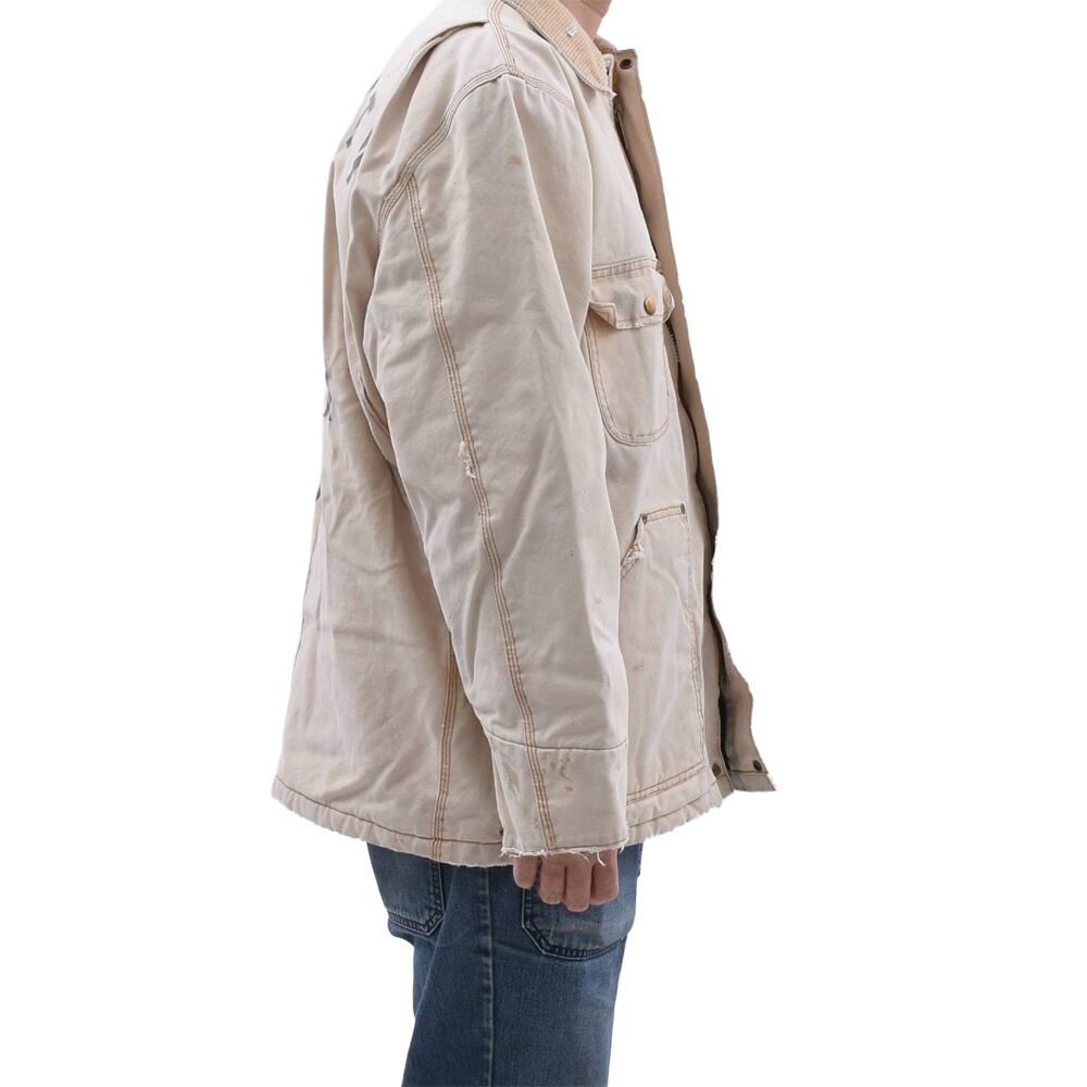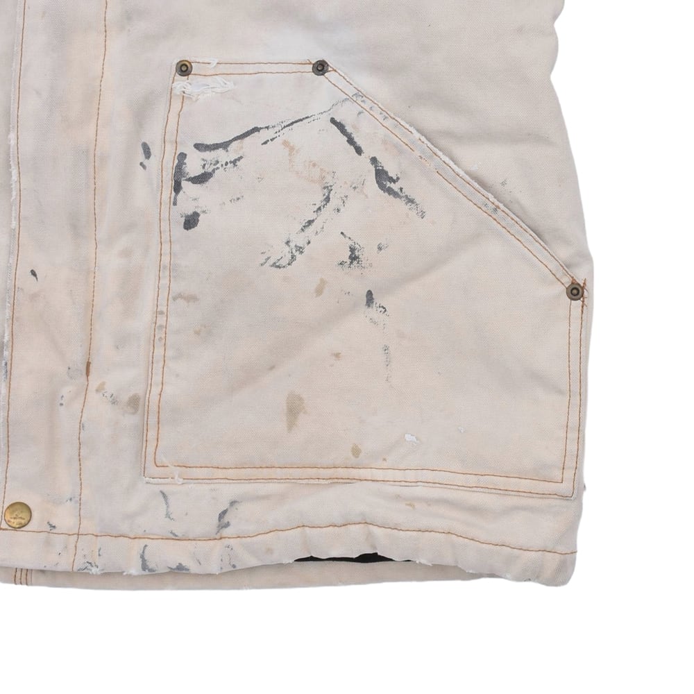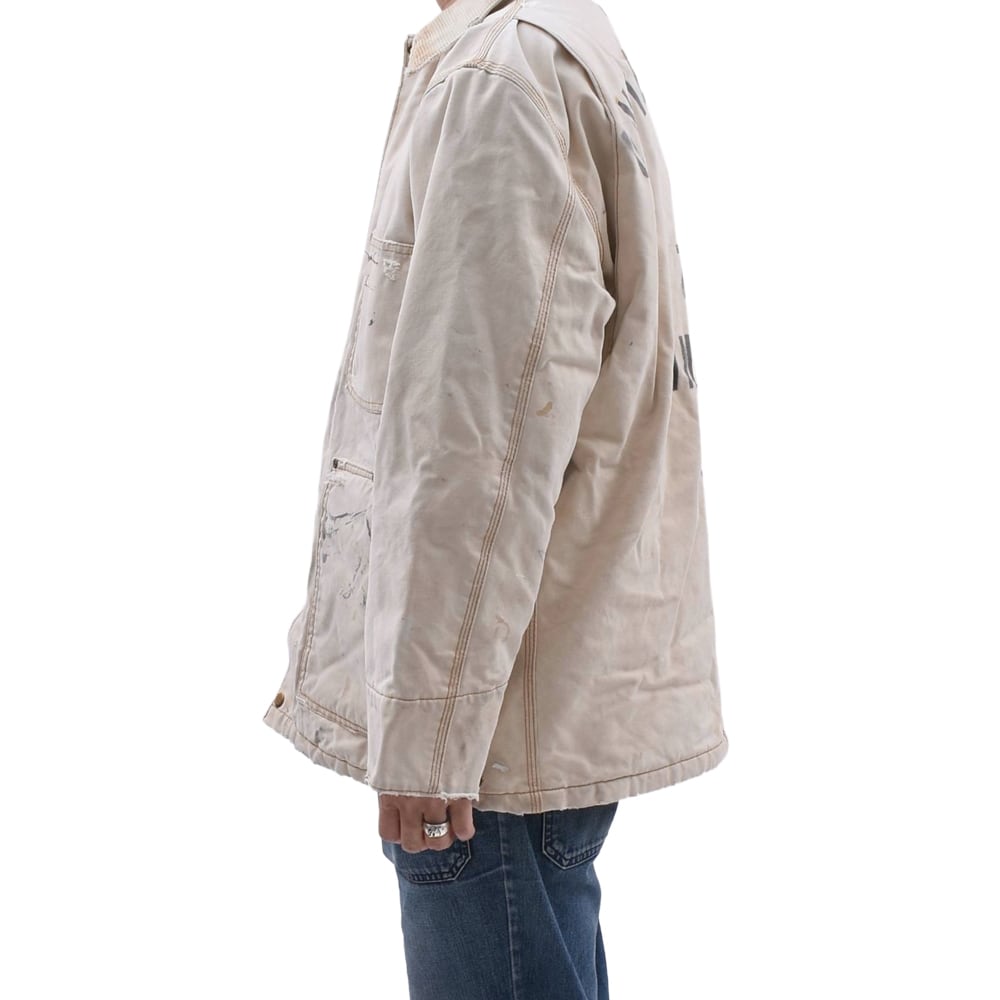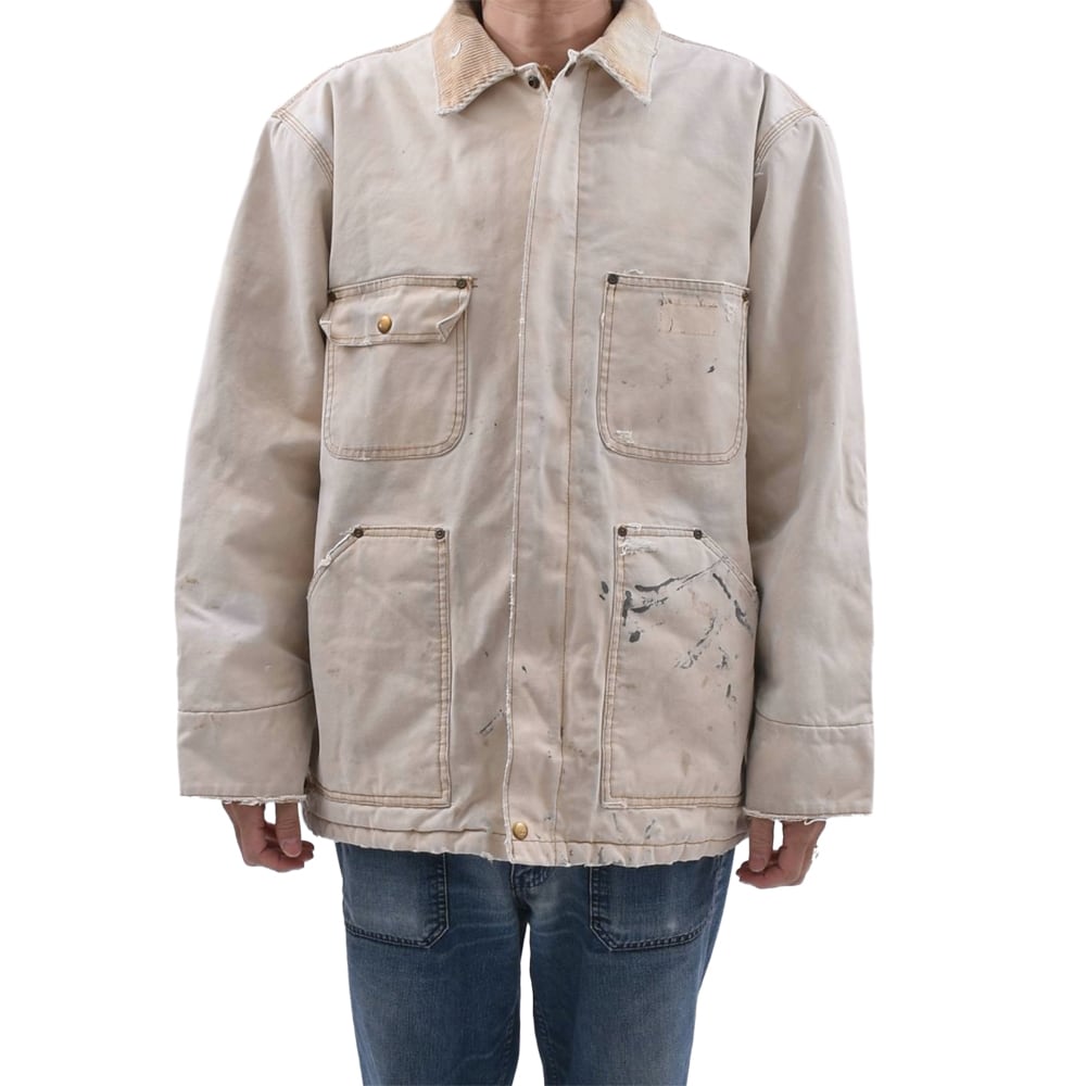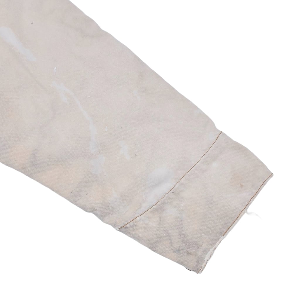 A duck cloth coverall with a paint-splattered finish, exuding the vibe of real workwear. Made from durable duck canvas, the worn texture and paint smudges create a unique character. The natural and off-white tones give it a refined look despite its workwear style. Featuring a total of four pockets—two chest pockets and two waist pockets—it also offers excellent functionality. Lined for added warmth, making it a useful piece in colder seasons.