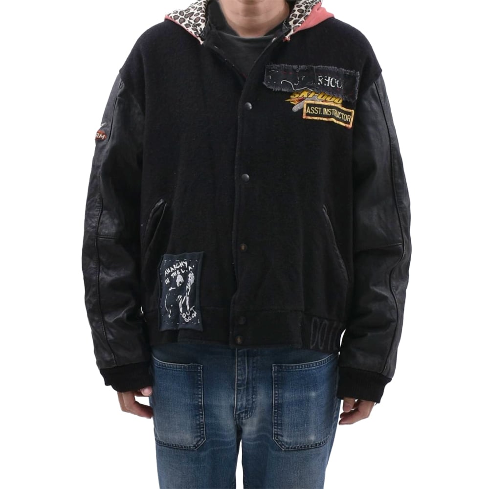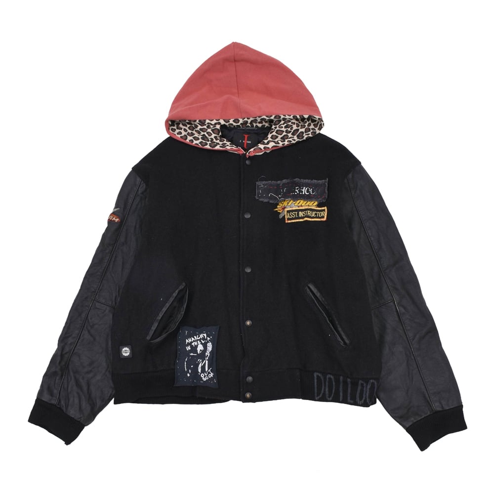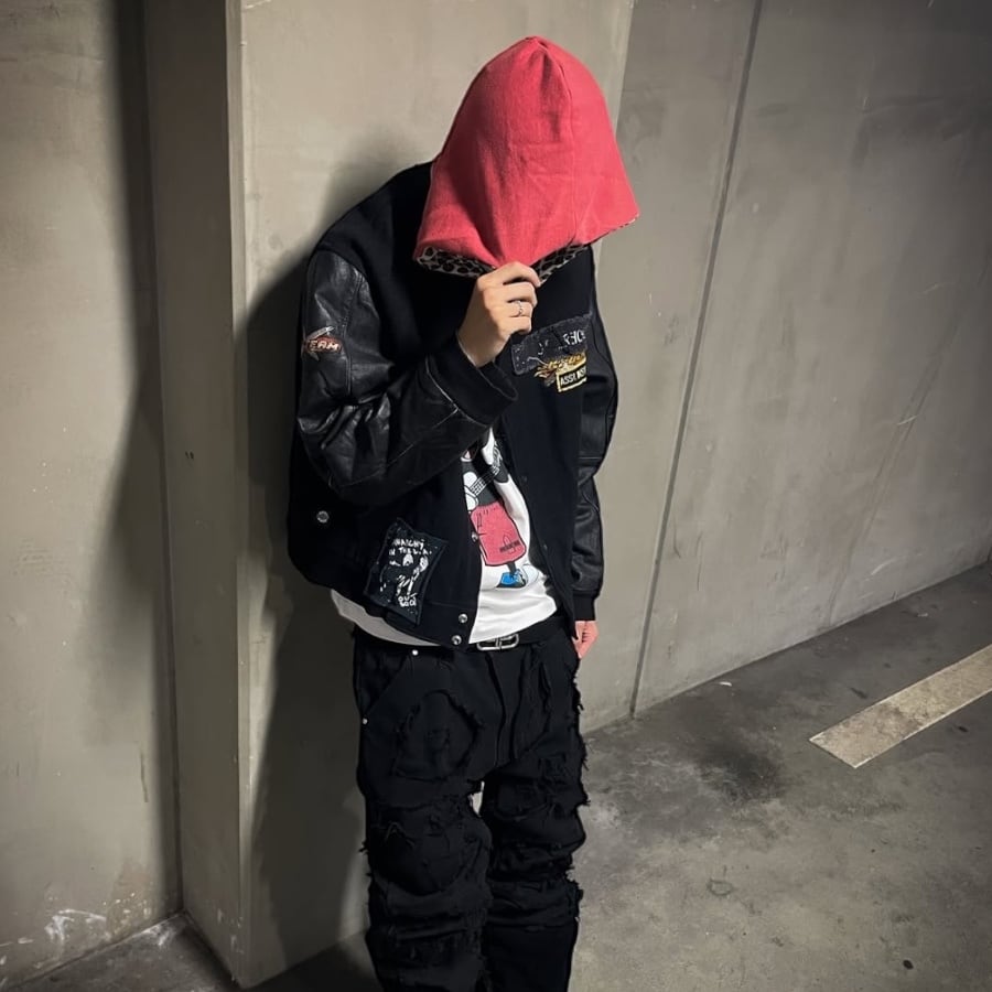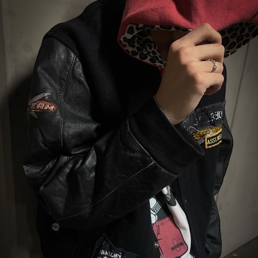 Vintage-style patches and patchwork serve as exquisite accents. The sleeves are made of leather, and the body is made of melton fabric, creating an appealing contrast in texture. The hood features a leopard print lining and red accents, adding a street vibe and playful touch. With a relaxed silhouette, it can be worn oversized by both men and women.
