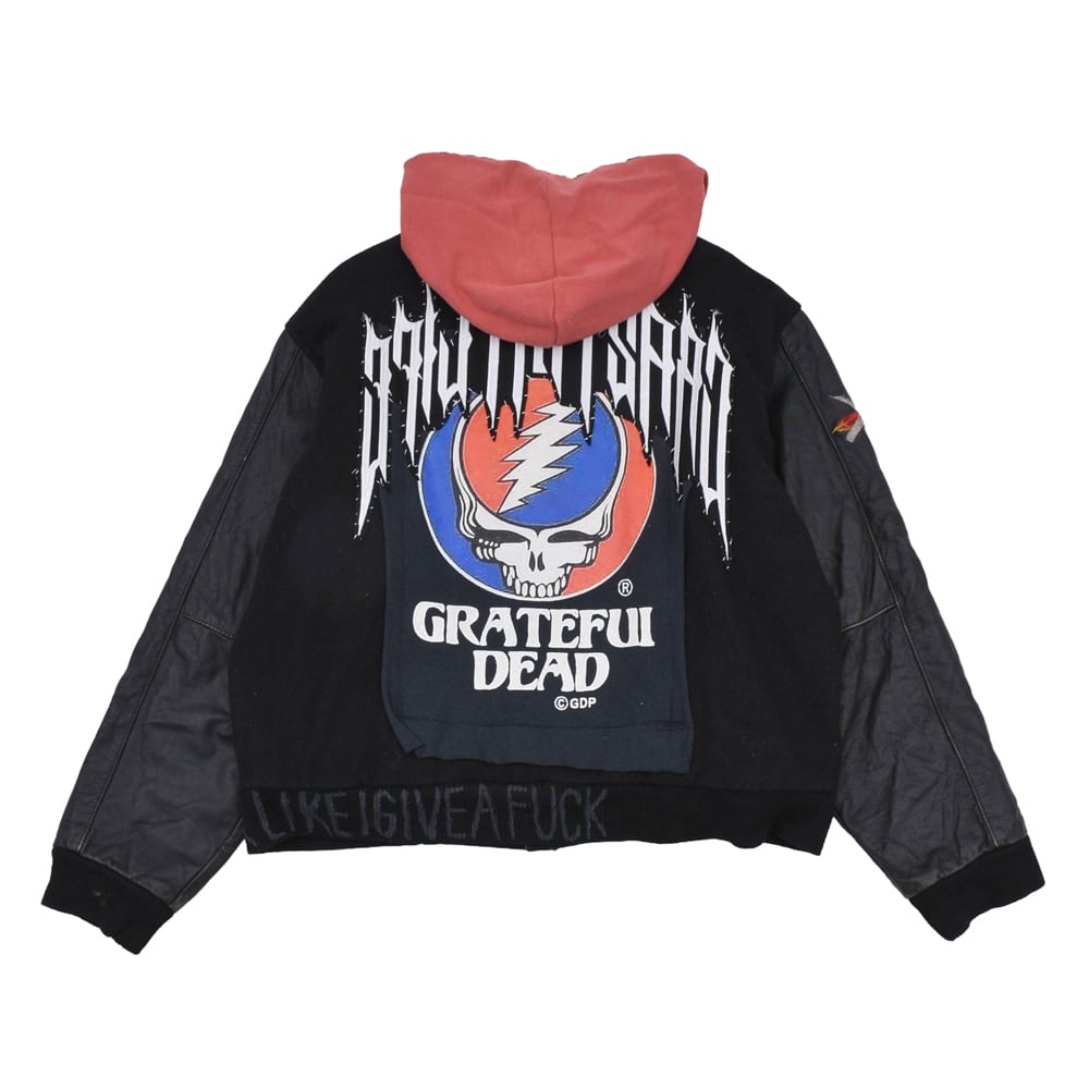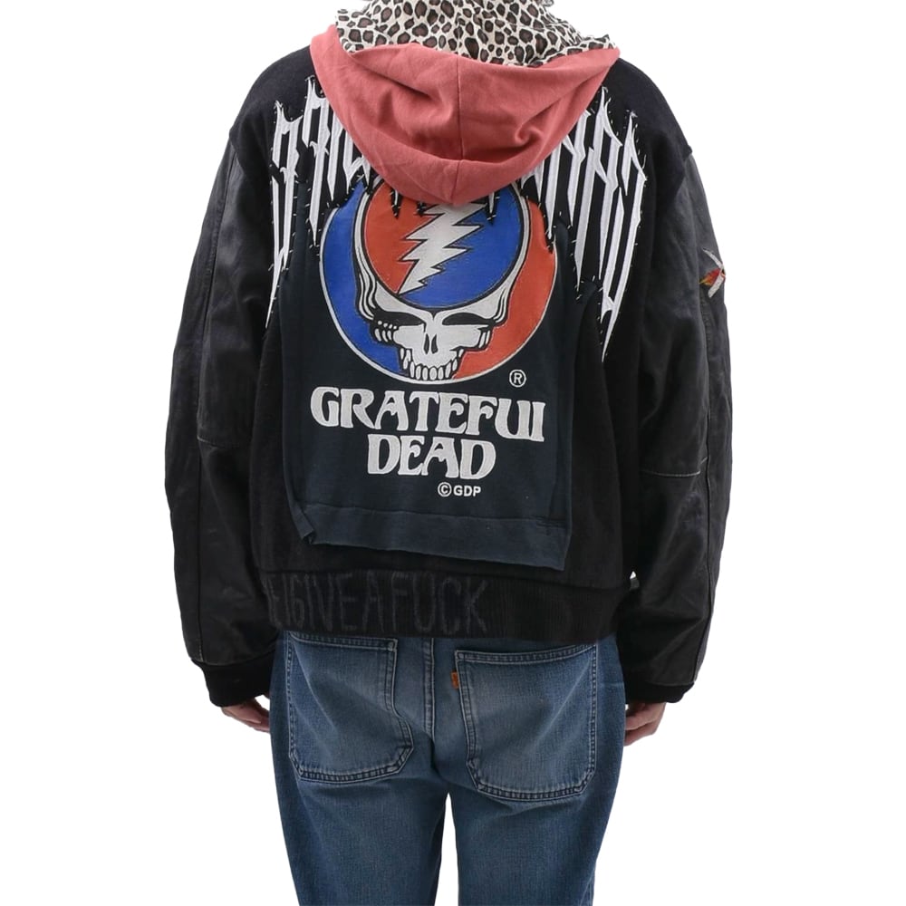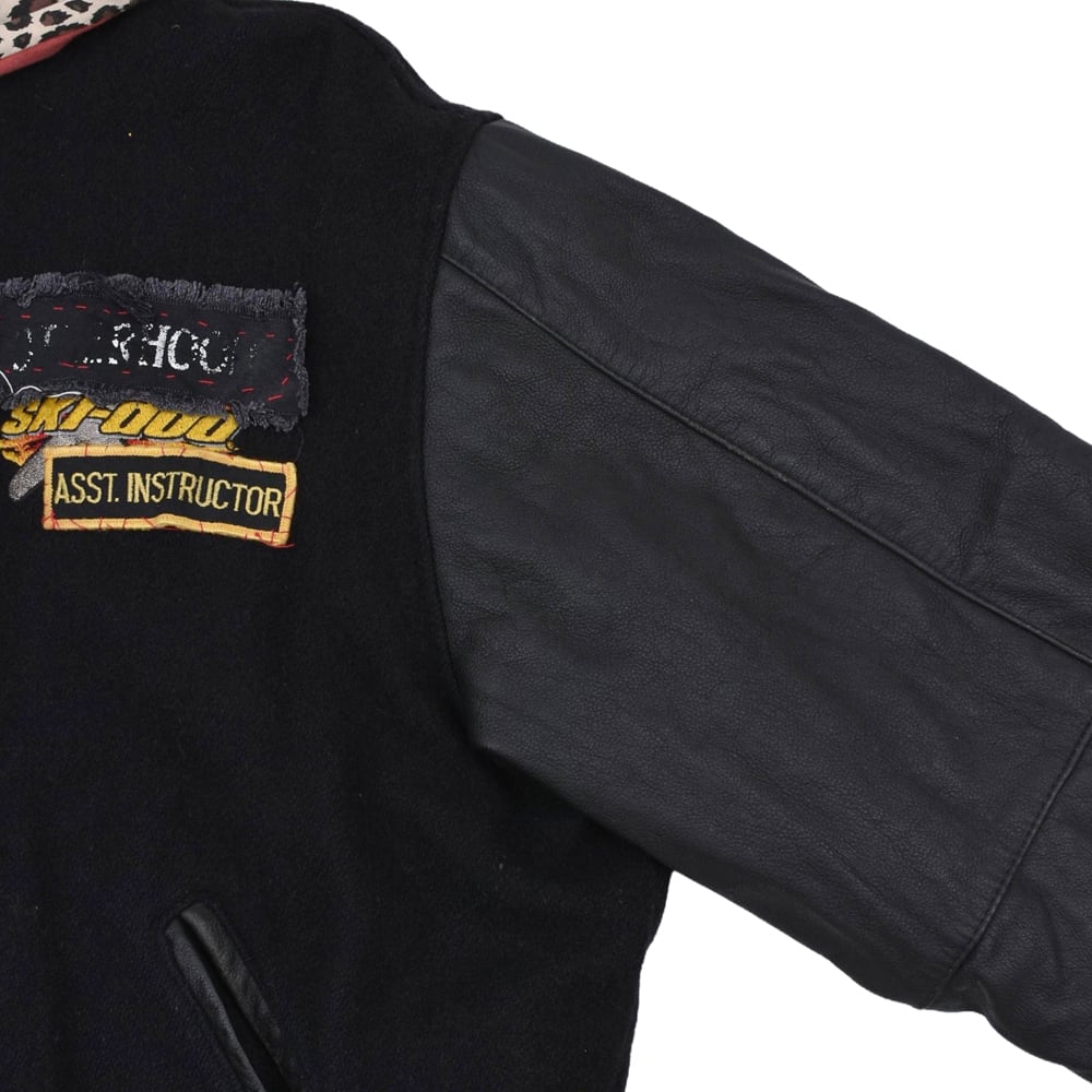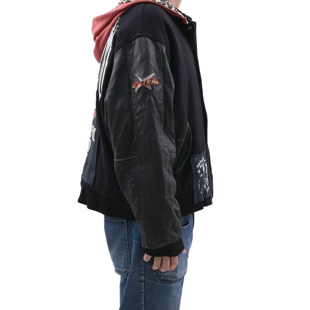 Vintage-style patches and patchwork serve as exquisite accents. The sleeves are made of leather, and the body is made of melton fabric, creating an appealing contrast in texture. The hood features a leopard print lining and red accents, adding a street vibe and playful touch. With a relaxed silhouette, it can be worn oversized by both men and women.
