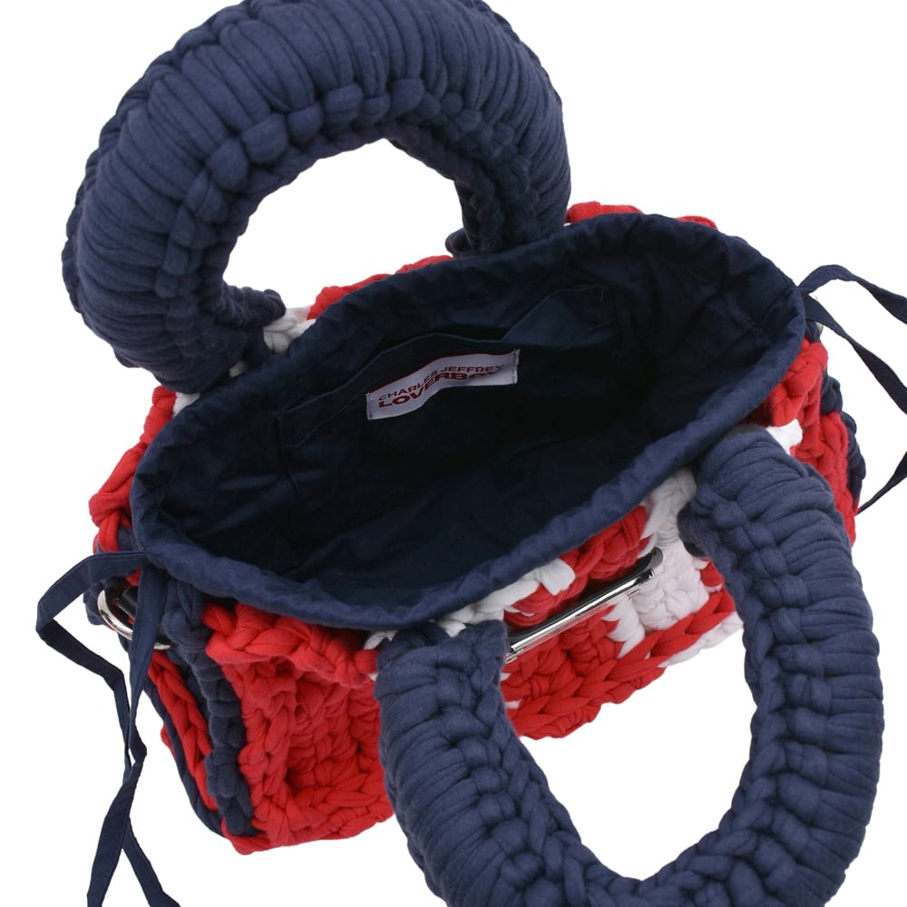 必要最低限のものだけを持ち歩きたいときにぴったりです。このニット素材のかわいいバッグには、ショルダーストラップが付き、ブランドシグネチャーであるメタルロゴプレートがあしらわれています。