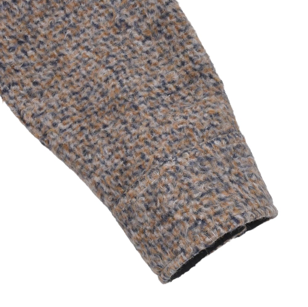 ミディアムウェイトのブラッシュドウールとラマブレンドを採用したオーバーシャツ。マイクロチェックパターンがあしらわれています。