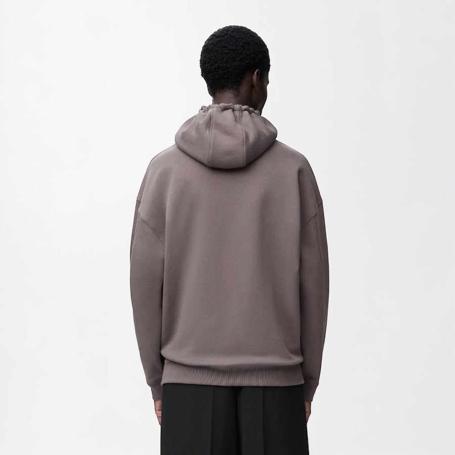ミディアムウェイトのループバックコットンフリースを採用したフーディー。フード付きの襟に、フラメンコバッグから着想を得たレザーのドローストリングがあしらわれています。