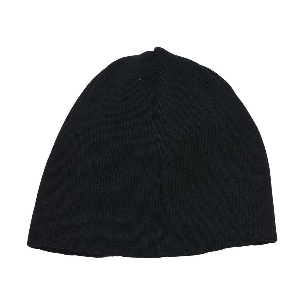 シンプルながら存在感のあるロゴが目を引くブラックニットキャップ。