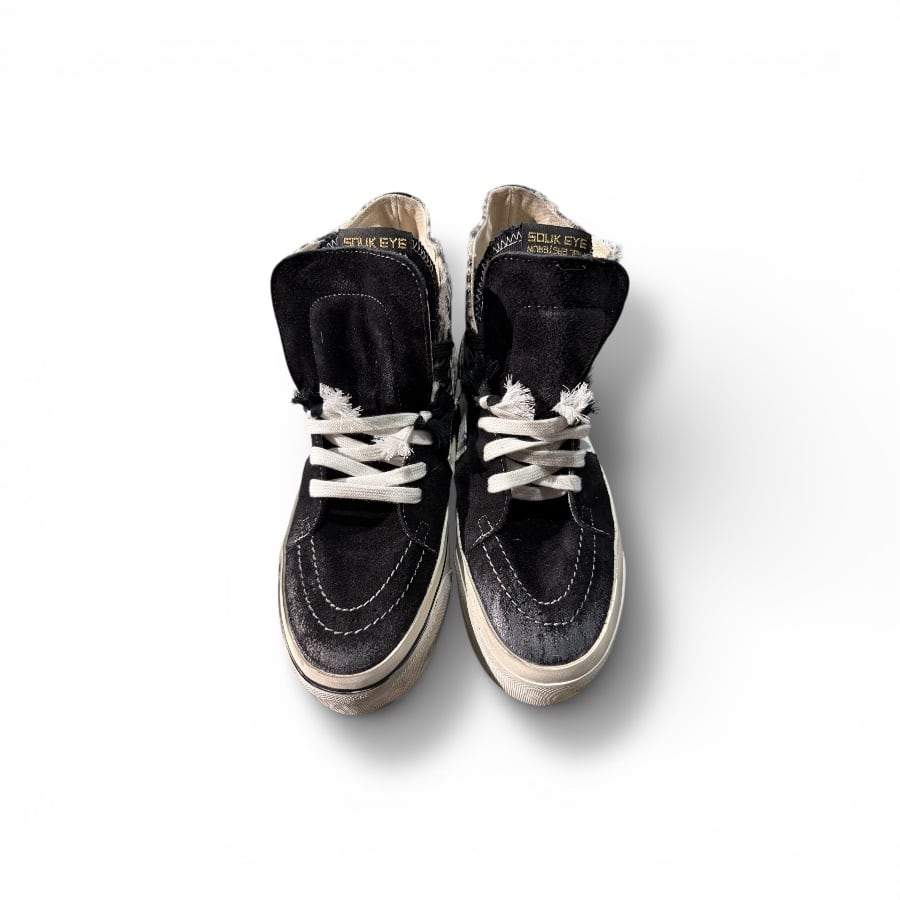 スエード×レザーの異素材コンビに、左右非対称なブラックとグレーの切り替えがインパクト抜群。
