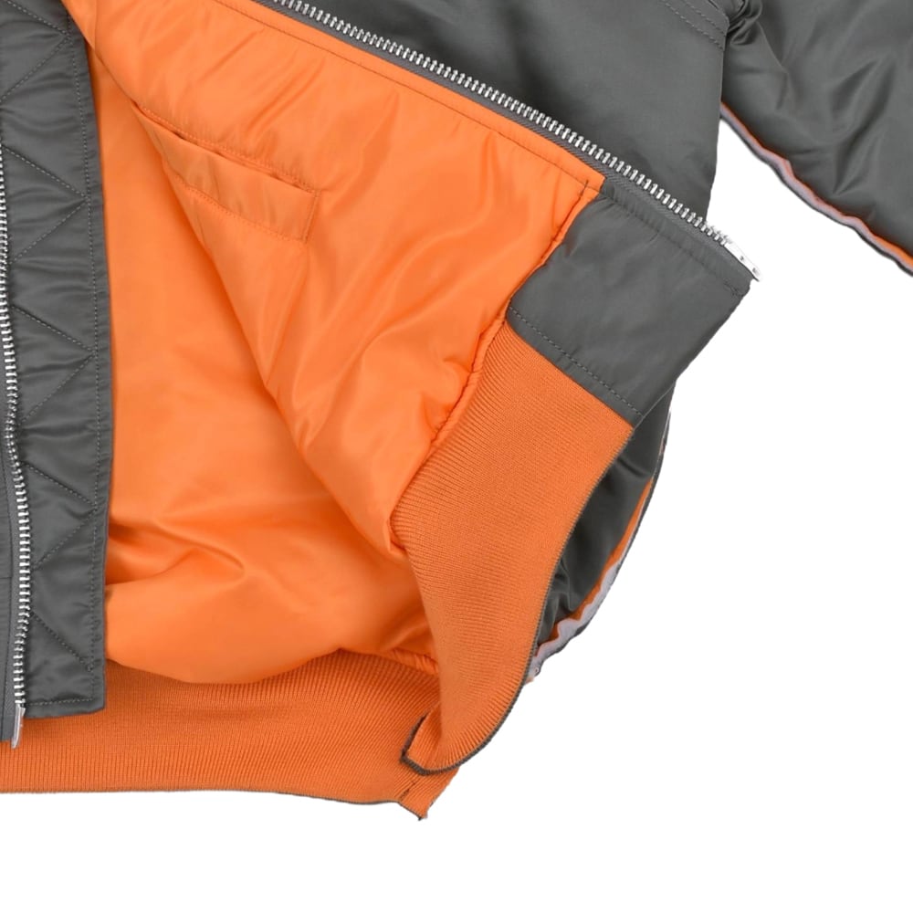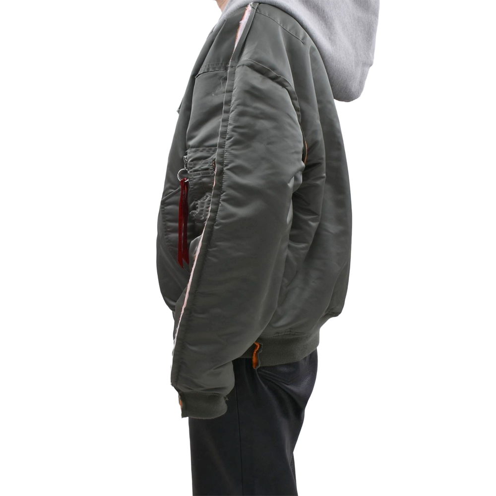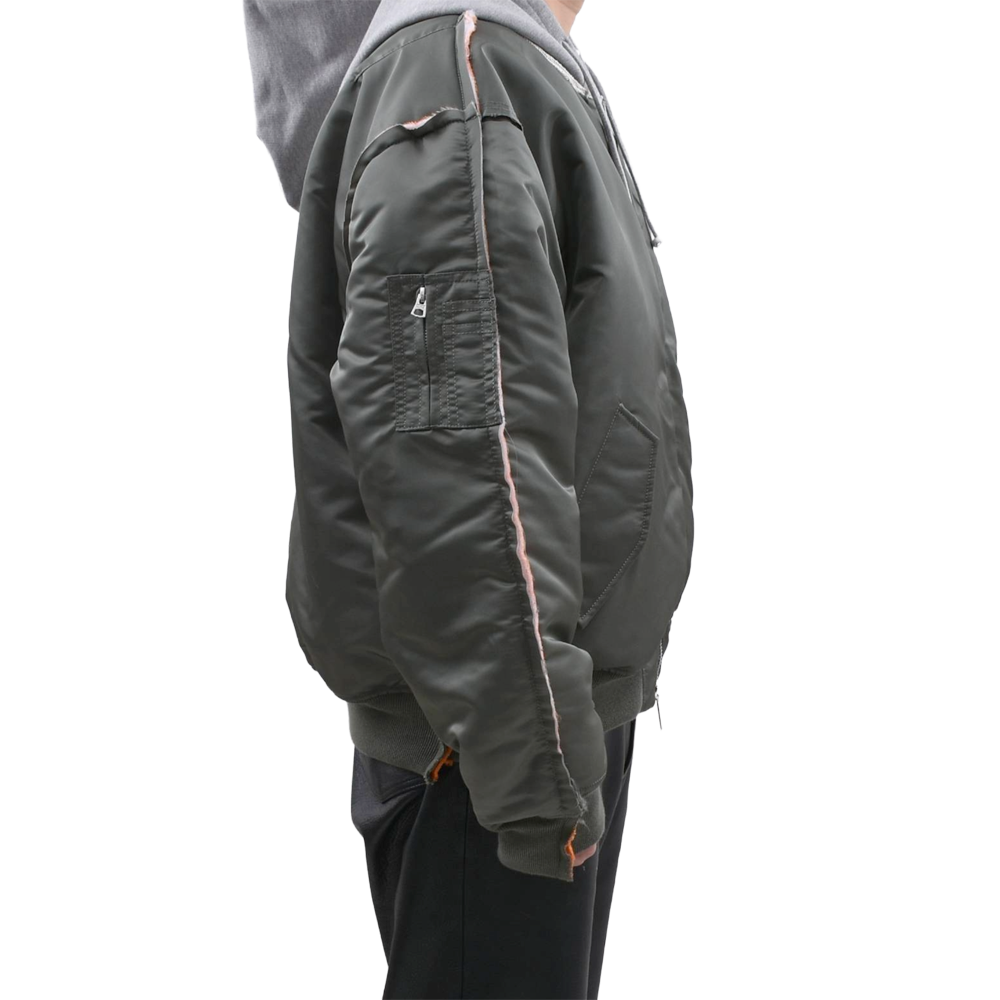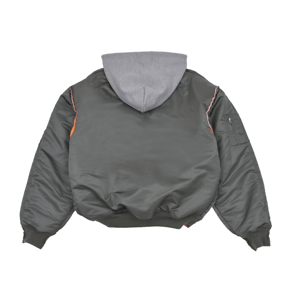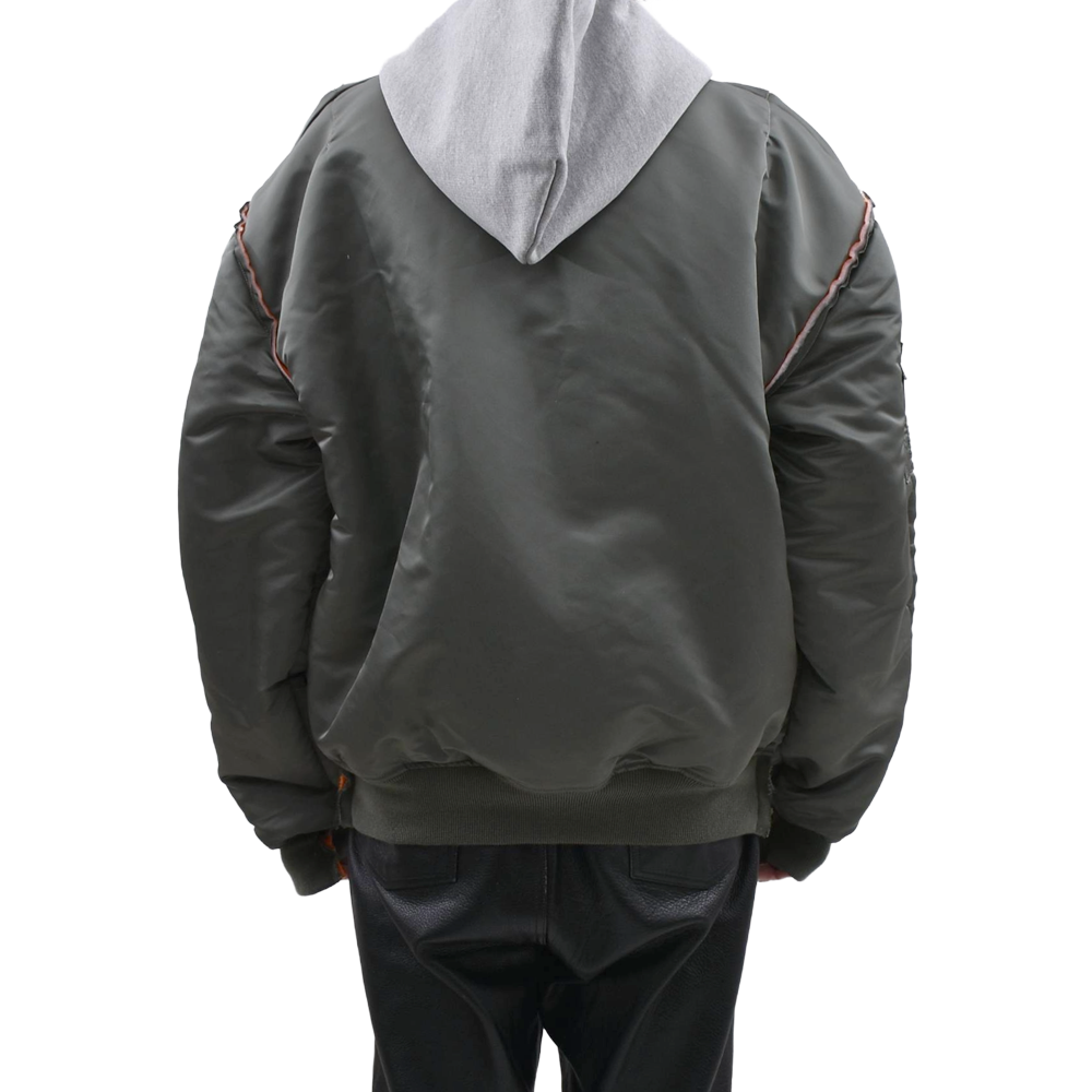 米軍のフライトジャケットをベースに、スウェットフードをレイヤードしたような再構築デザインが目を引く一着。