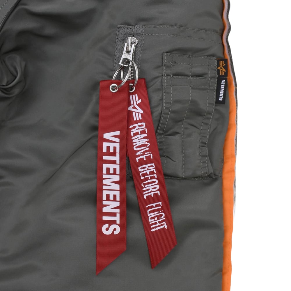 Based on the US military flight jacket, this eye-catching piece features a reconstructed design that looks like a layered sweatshirt hood. The contrast between the glossy, tough nylon material and the vintage-inspired sage green creates an urban military style. Iconic red ribbon tags on the sleeve add a touch of VETEMENTS' signature street flair. The extreme oversized silhouette provides a unique volume and trendy look, making it a versatile outerwear essential.