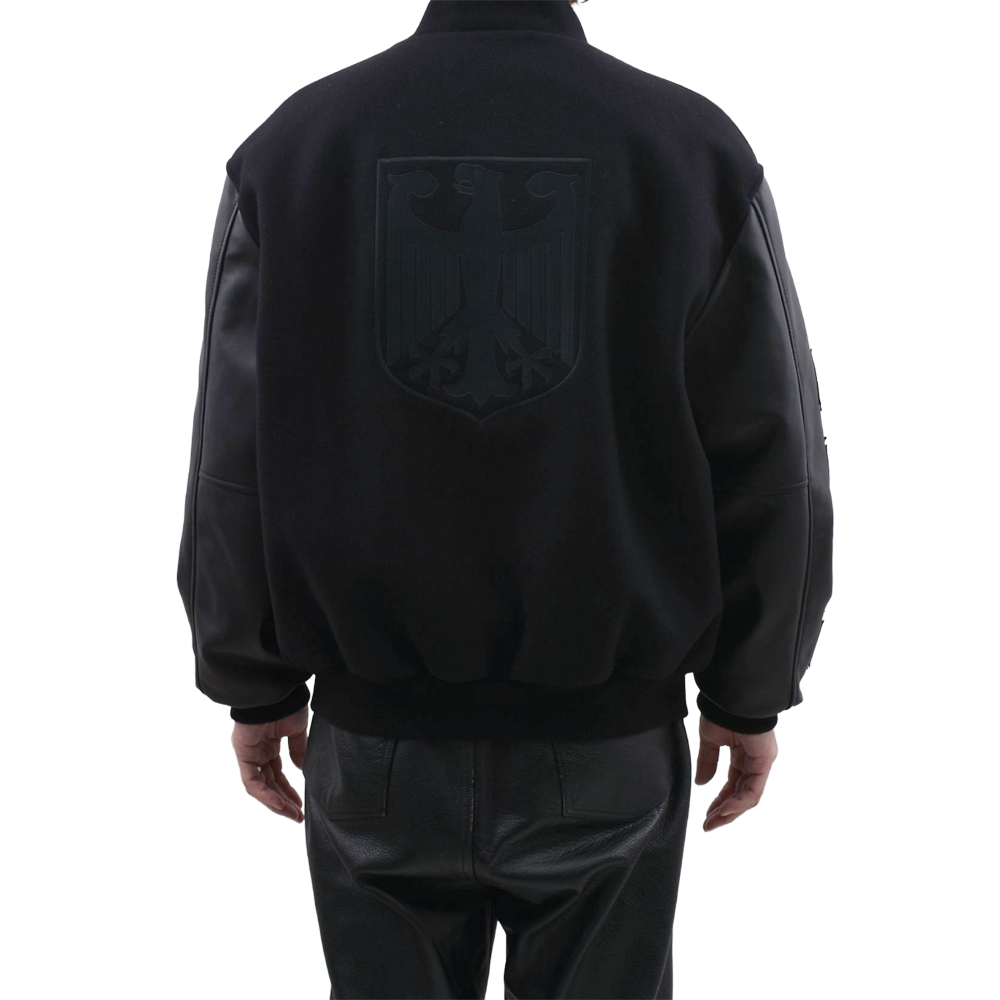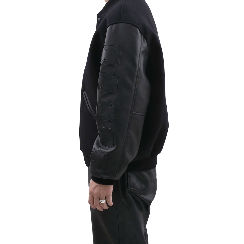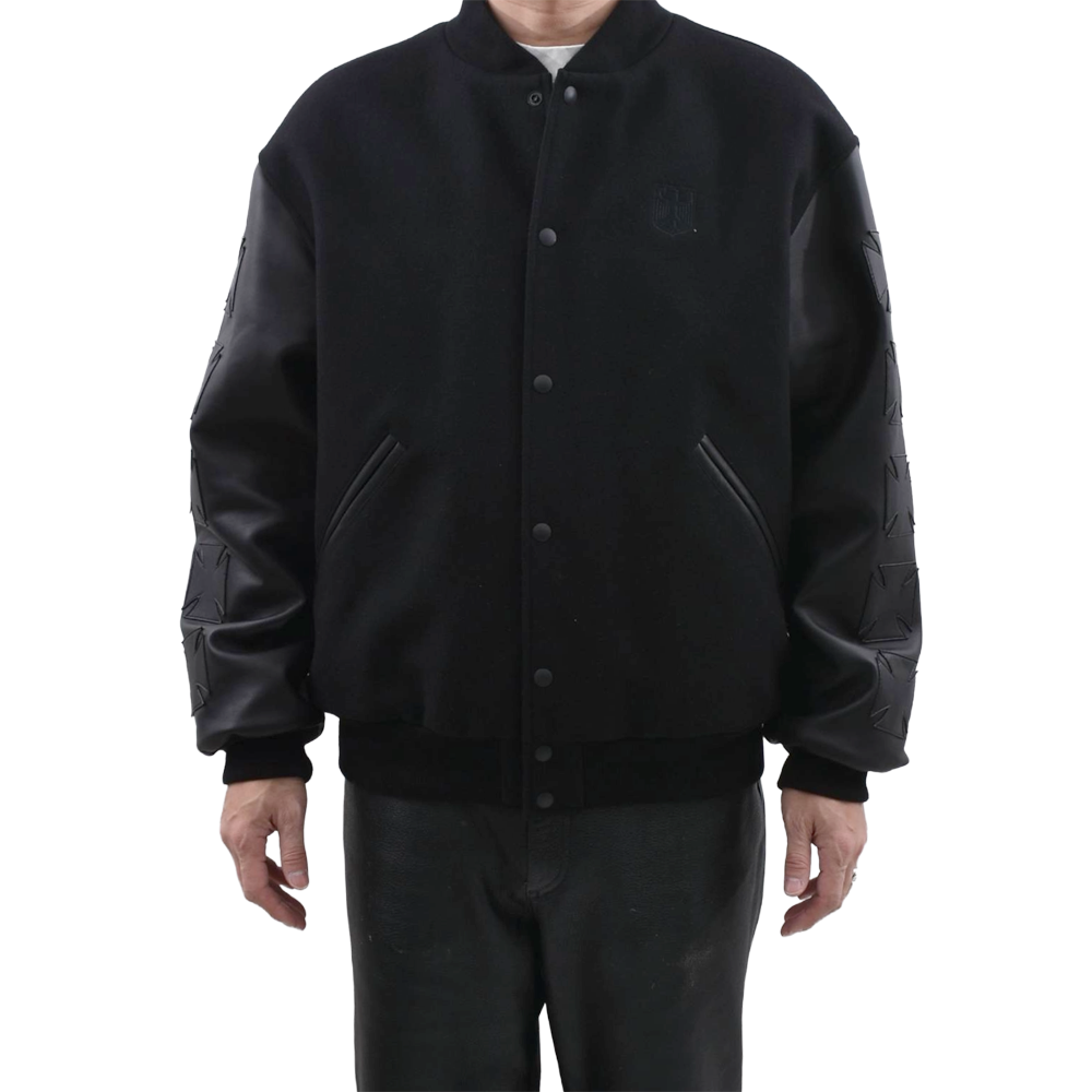 This high-end varsity jacket combines heavy melton wool with premium leather for a luxurious feel. The stoic all-black colorway is complemented by 3D "cross embroidery" on both sleeves, creating an overwhelming presence. Featuring the brand's signature logo on the left chest, the edgy design is meticulously detailed. Its oversized silhouette elevates any street style, making it a masterpiece for your winter wardrobe.