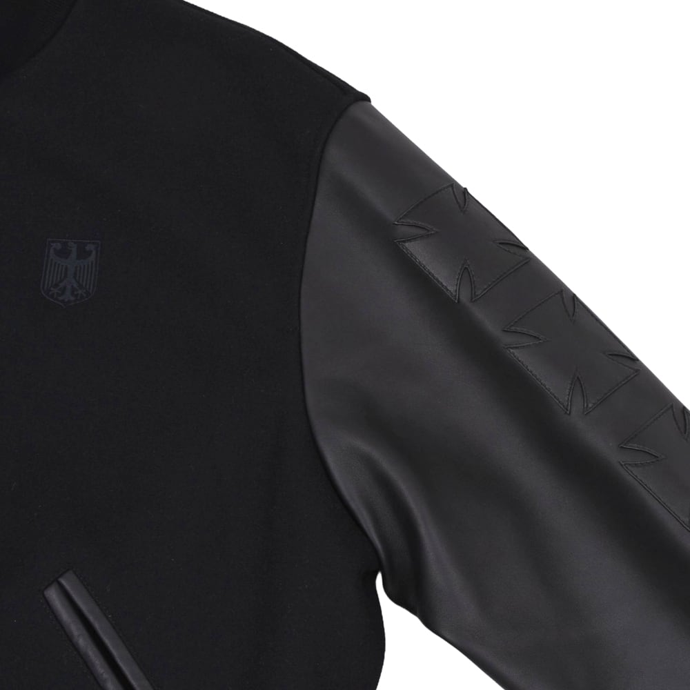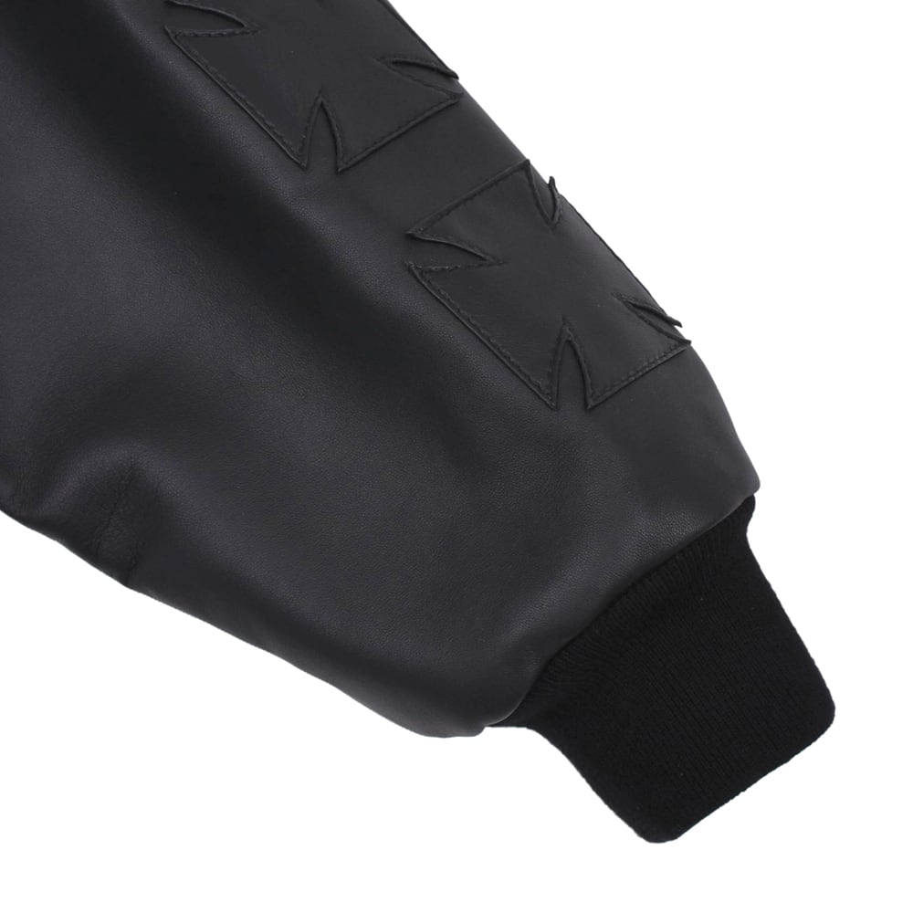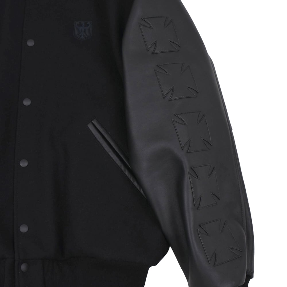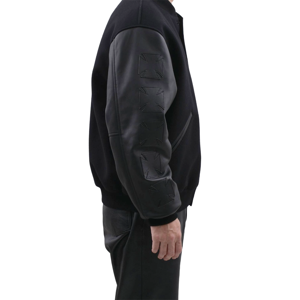This high-end varsity jacket combines heavy melton wool with premium leather for a luxurious feel. The stoic all-black colorway is complemented by 3D "cross embroidery" on both sleeves, creating an overwhelming presence. Featuring the brand's signature logo on the left chest, the edgy design is meticulously detailed. Its oversized silhouette elevates any street style, making it a masterpiece for your winter wardrobe.