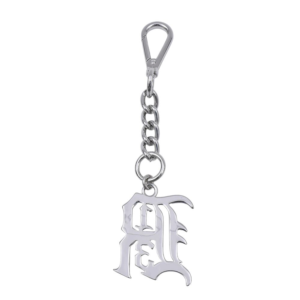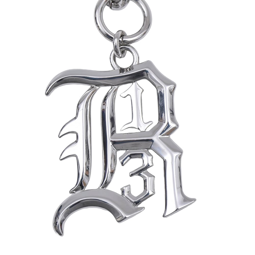 This edgy keychain features R13's iconic "R" logo as a substantial metal charm. The Old English-inspired font, reminiscent of medieval script, perfectly embodies the brand's punk and rockabilly aesthetic. Combining a sturdy chain with a robust lobster clasp, it balances practicality with style when attached to belt loops or bags. The rugged silver texture gains character with every use, making it a must-have accessory that adds a hard-edged accent to any look.