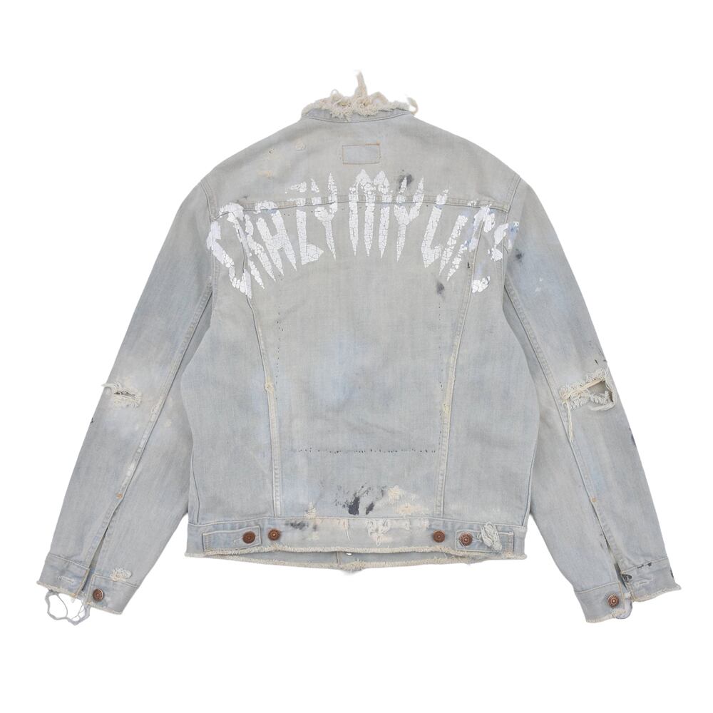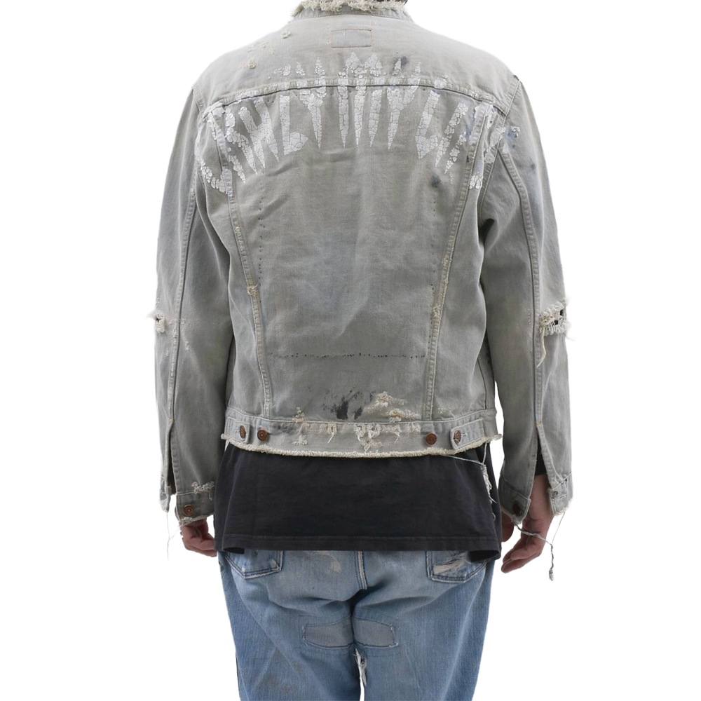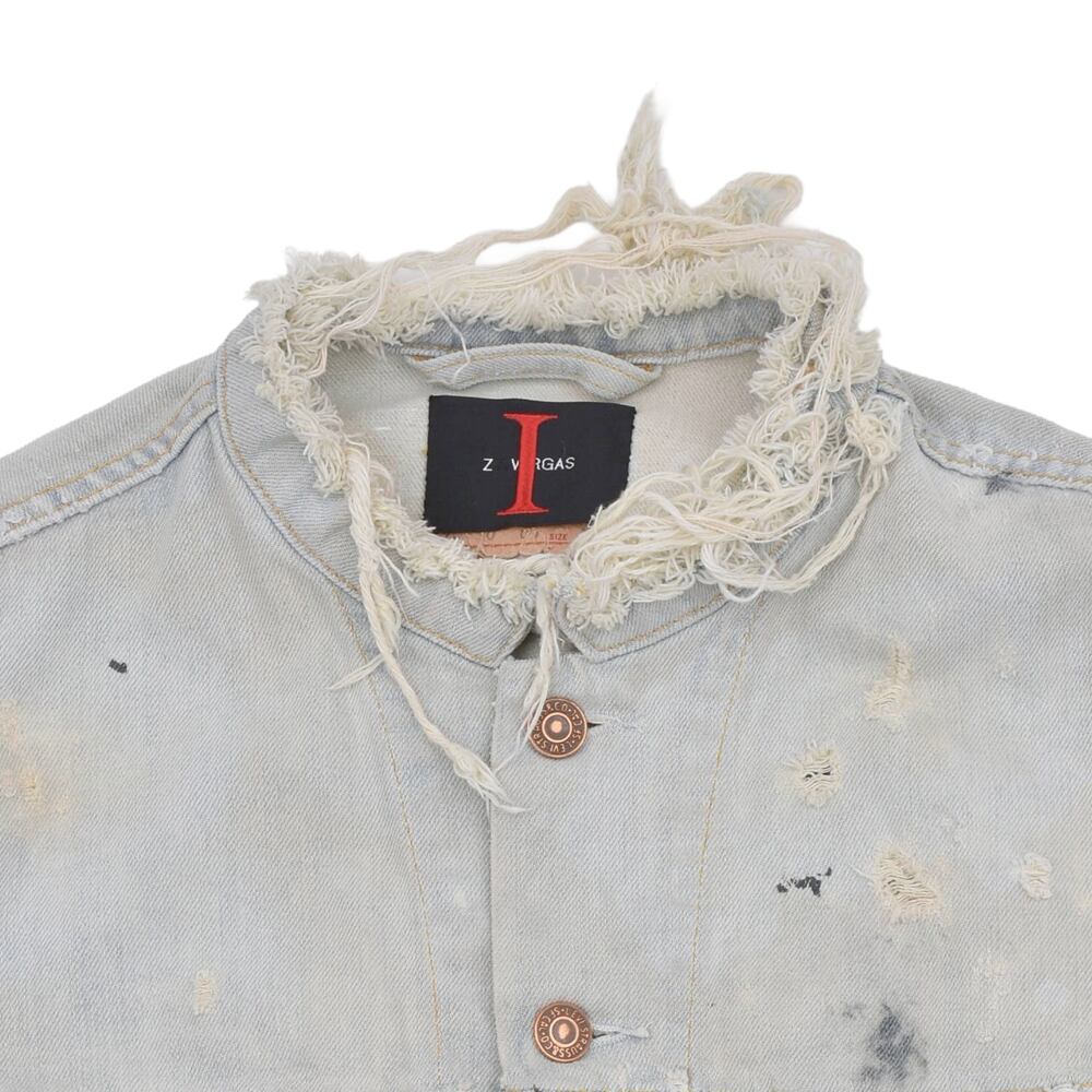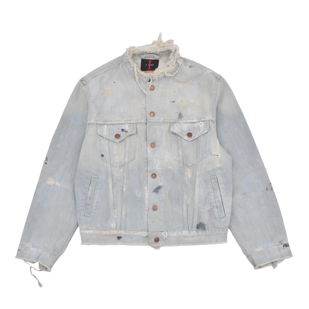首元の激しいフリンジ加工や、長年着古したかのような絶妙なオイル染み・リペア跡が、既製品にはない圧倒的なオーラを放ちます。襟を敢えて排除したノーカラーのような首周りのデザインは、パーカーとのレイヤードも完璧。ロックやパンクの精神を現代のストリートに落とし込んだ、まさに「着るアート」と呼べる一着です。