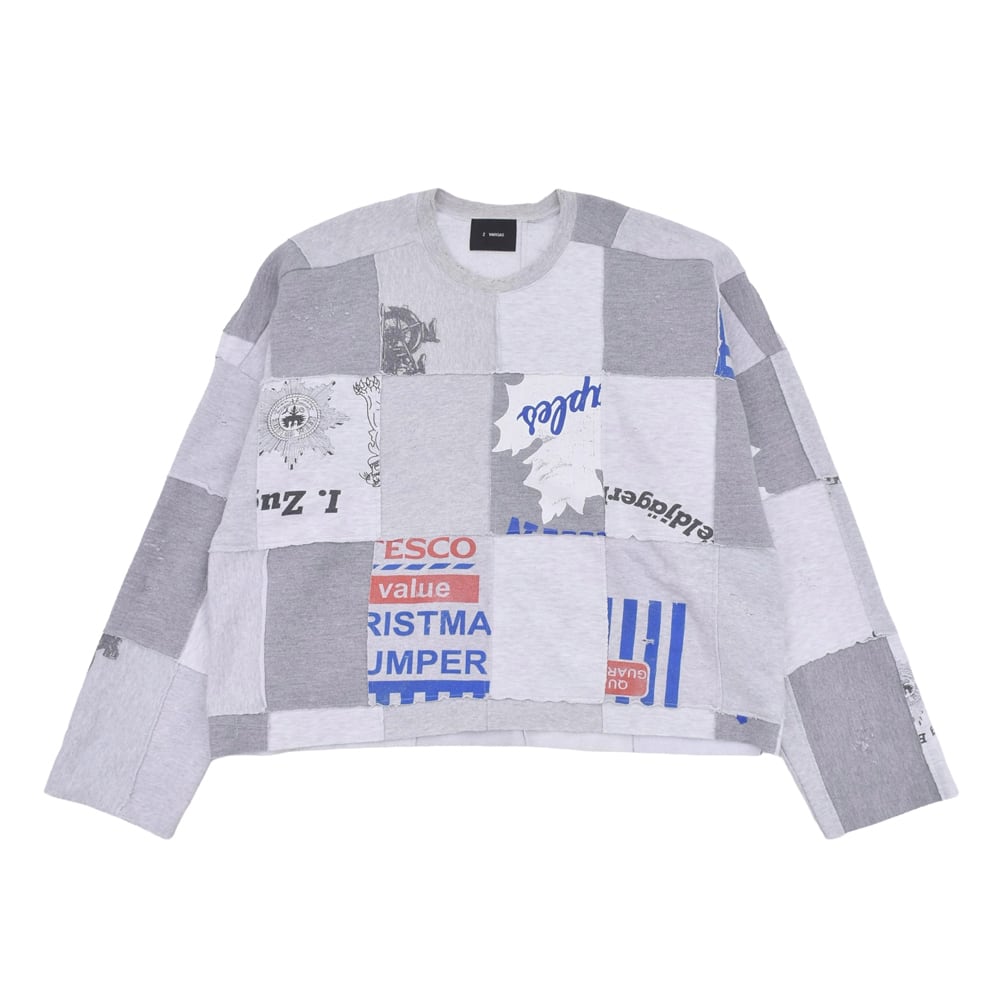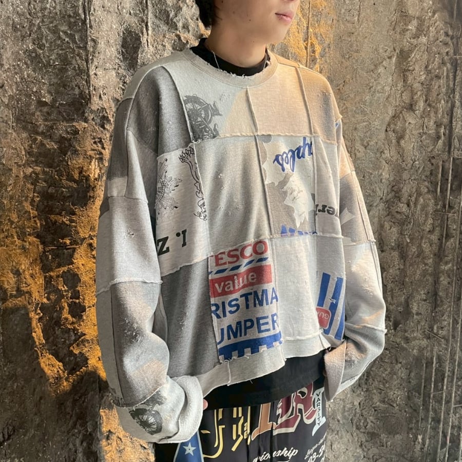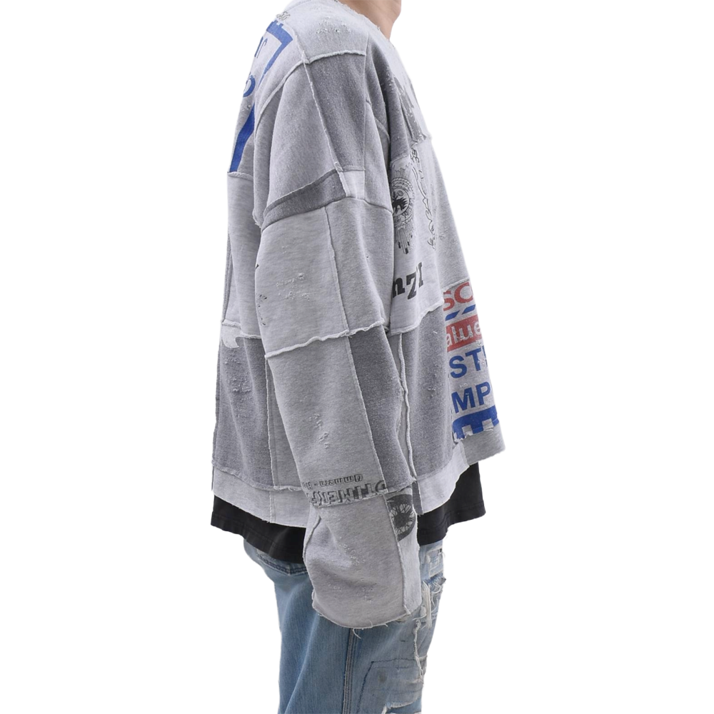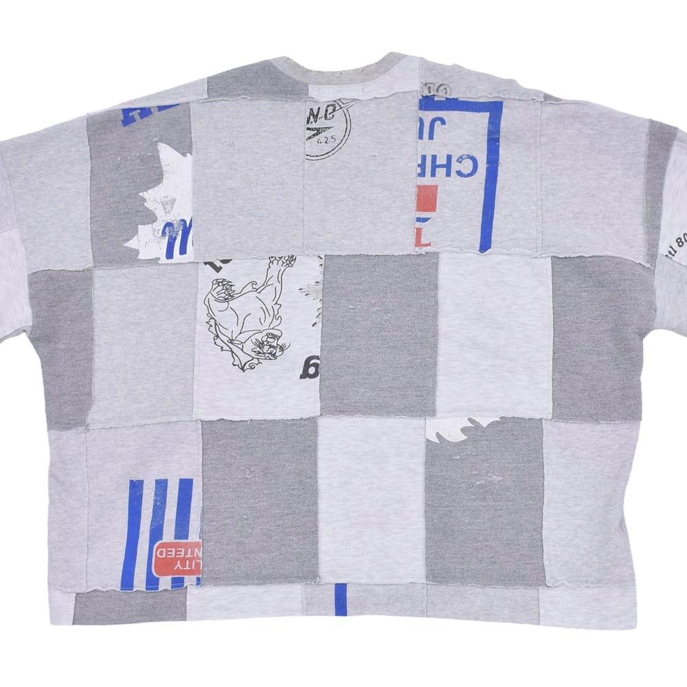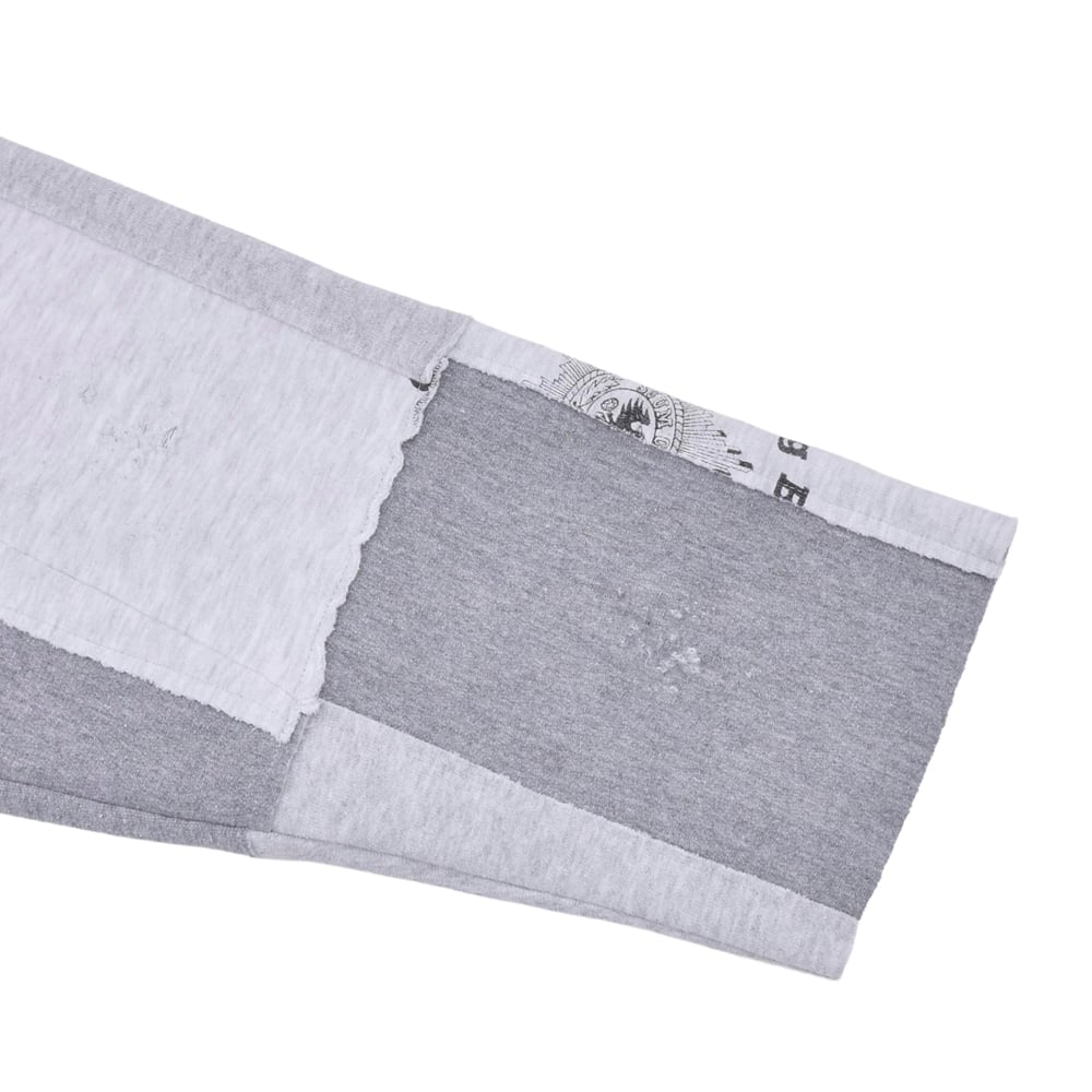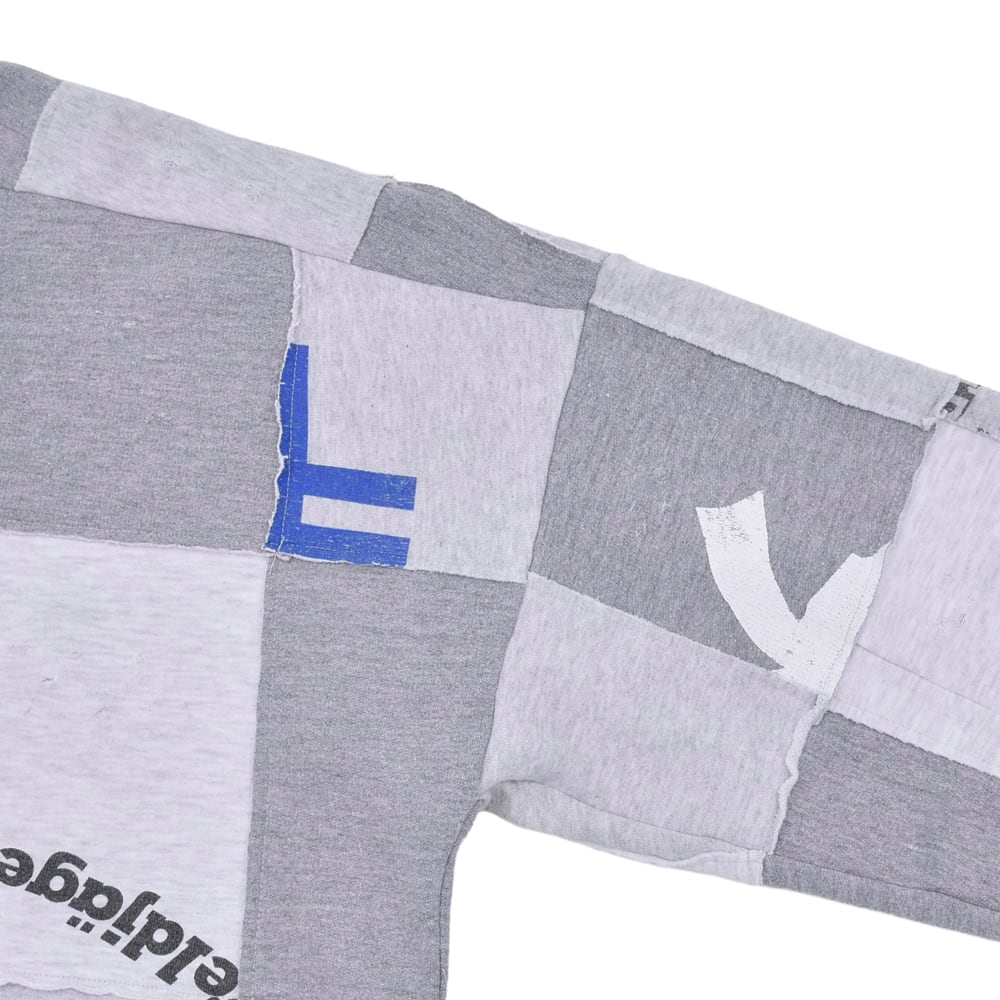 様々なヴィンテージスウェットを解体し、大胆にパッチワーク。絶妙なフェード感のあるグレーを基調に、グラフィックの配置までこだわり抜かれています。