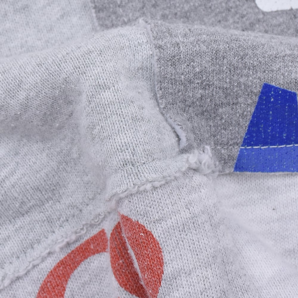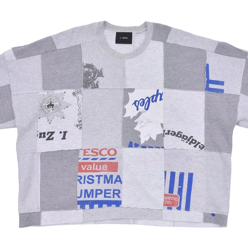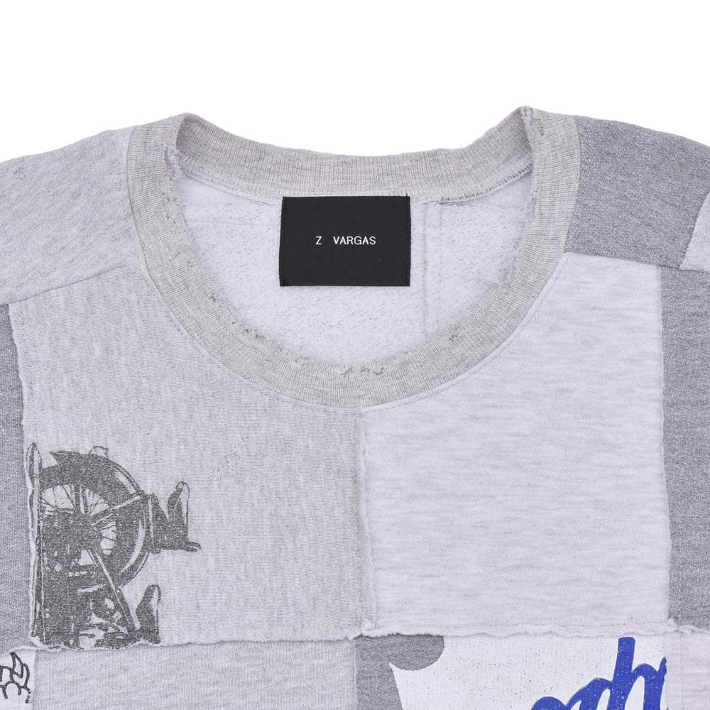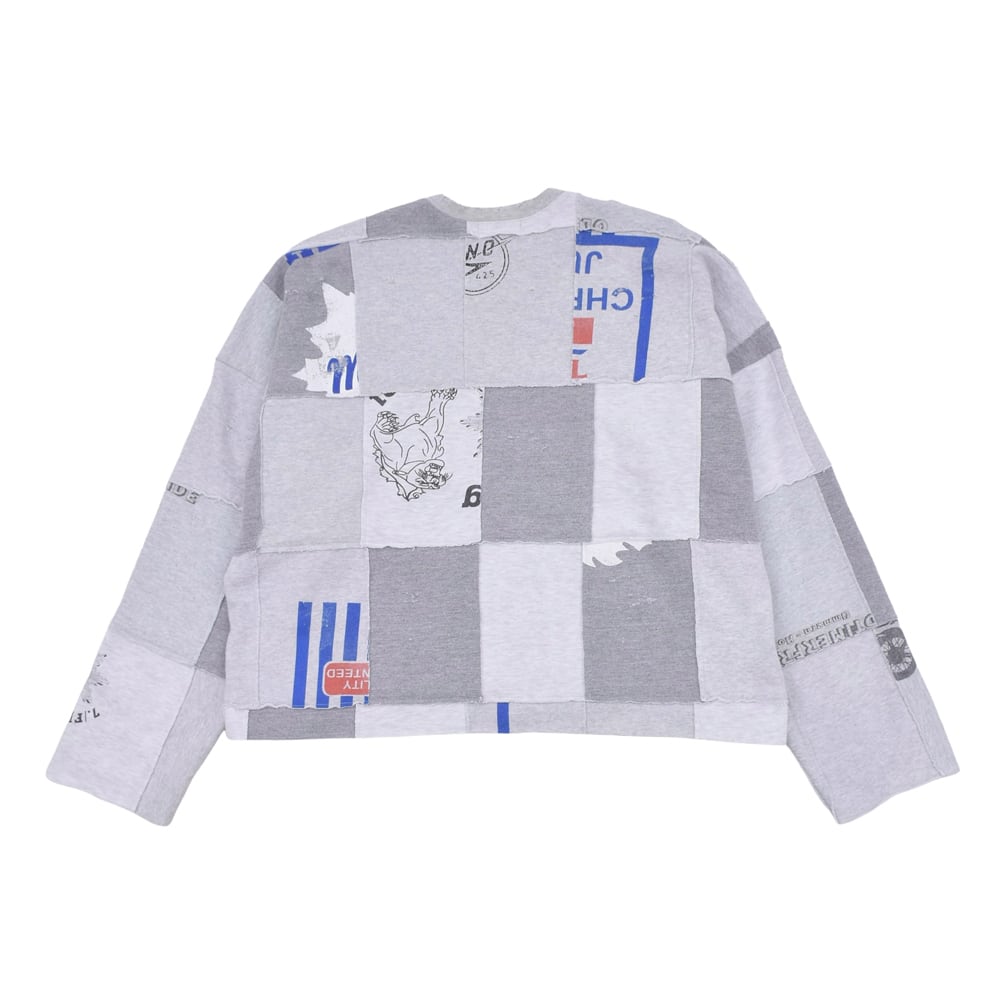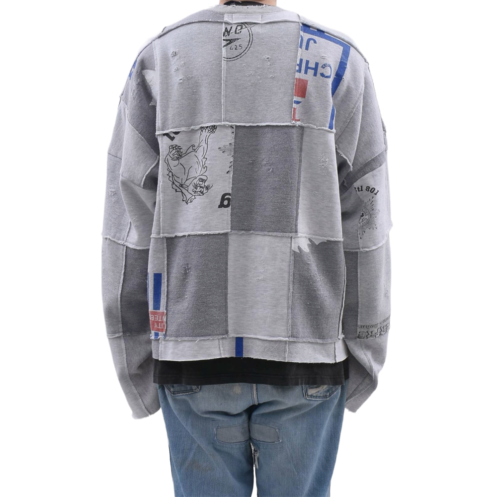 様々なヴィンテージスウェットを解体し、大胆にパッチワーク。絶妙なフェード感のあるグレーを基調に、グラフィックの配置までこだわり抜かれています。