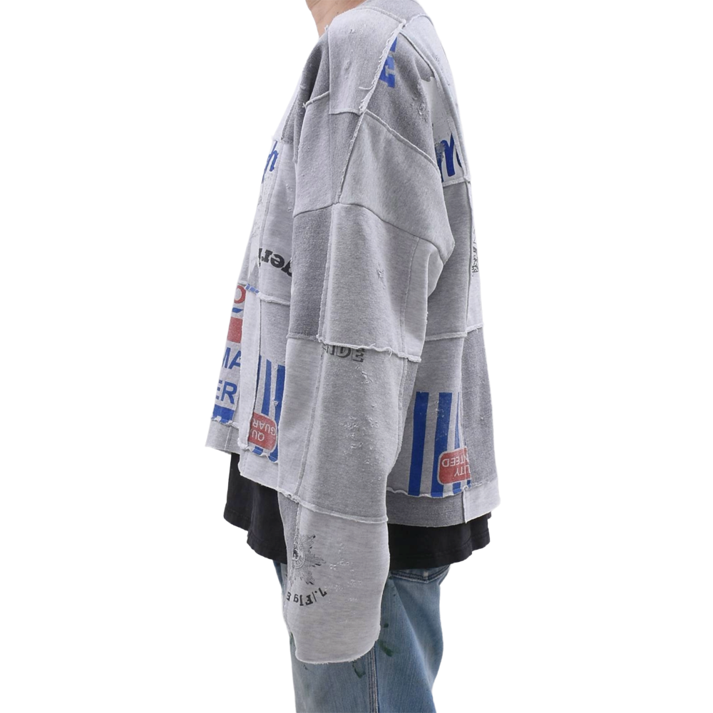 Various vintage sweatshirts have been disassembled and boldly patchworked. The base color is an exquisitely faded gray, and even the placement of the graphics has been carefully considered.