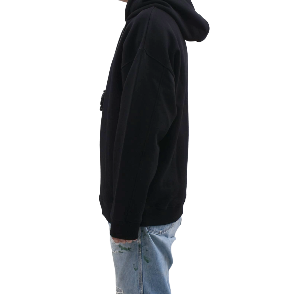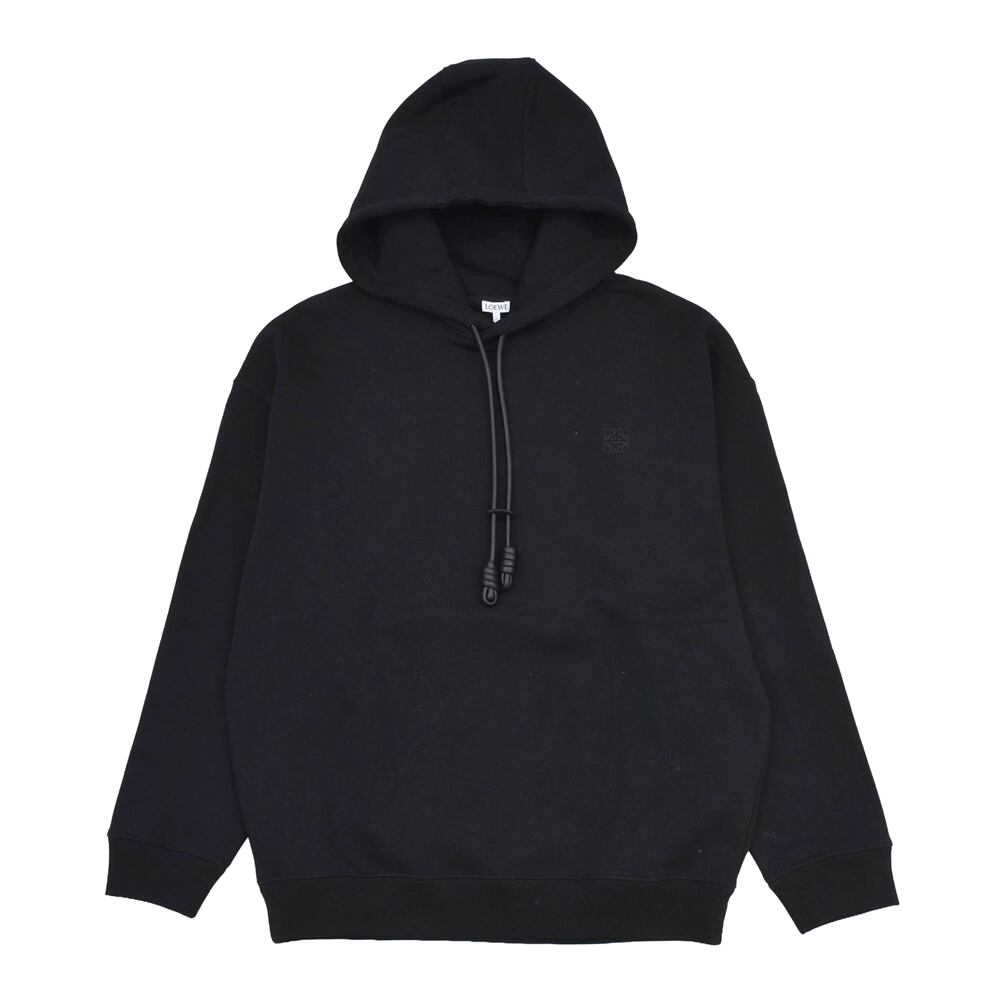 While at first glance it appears to be a simple black hoodie, it features a subtle Anagram embroidery in the same color on the chest, giving it a sophisticated look that appears and disappears depending on the light, evoking a sophisticated and sophisticated feel. The long drawstring and leather details that are characteristic of Loewe hoodies add a modern accent to the back and profile. This item combines versatility that can be worn with any style with the elegance of the brand.