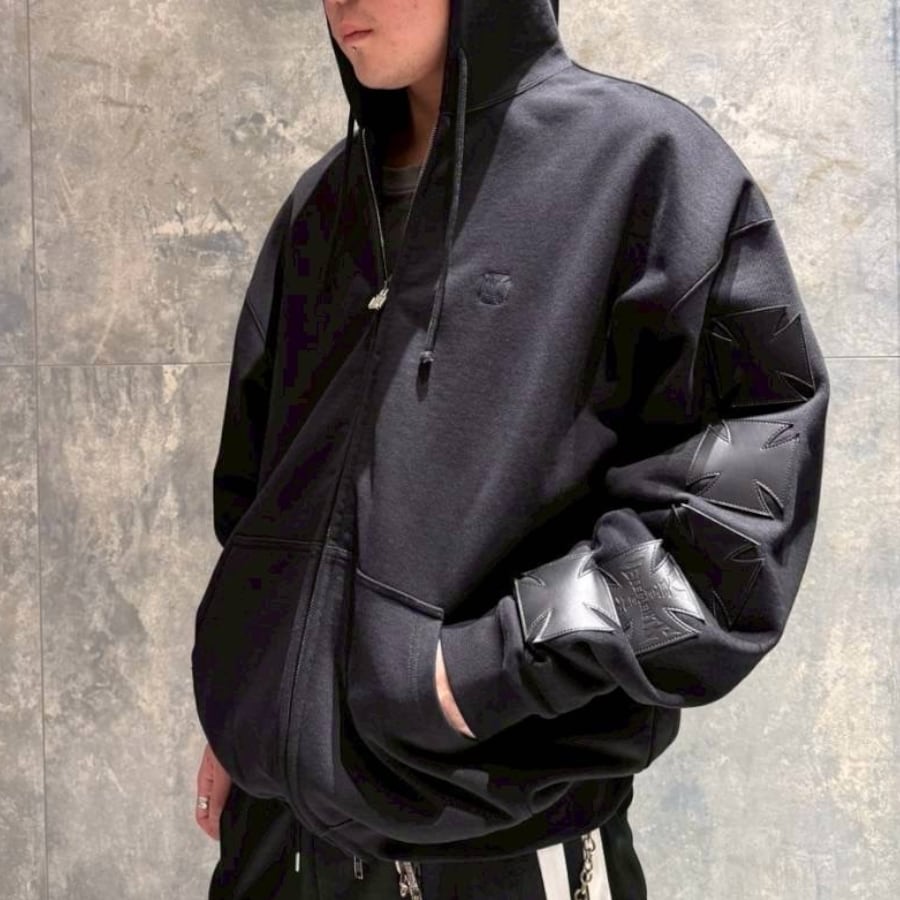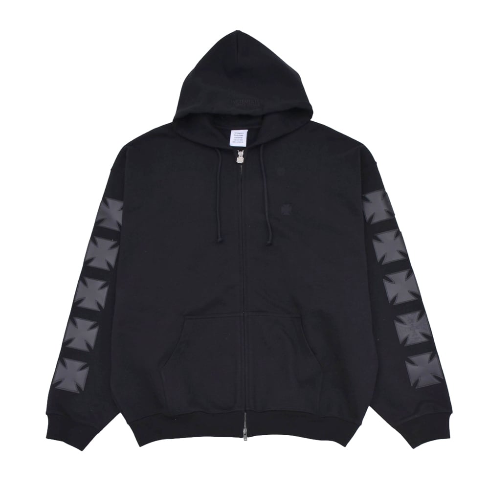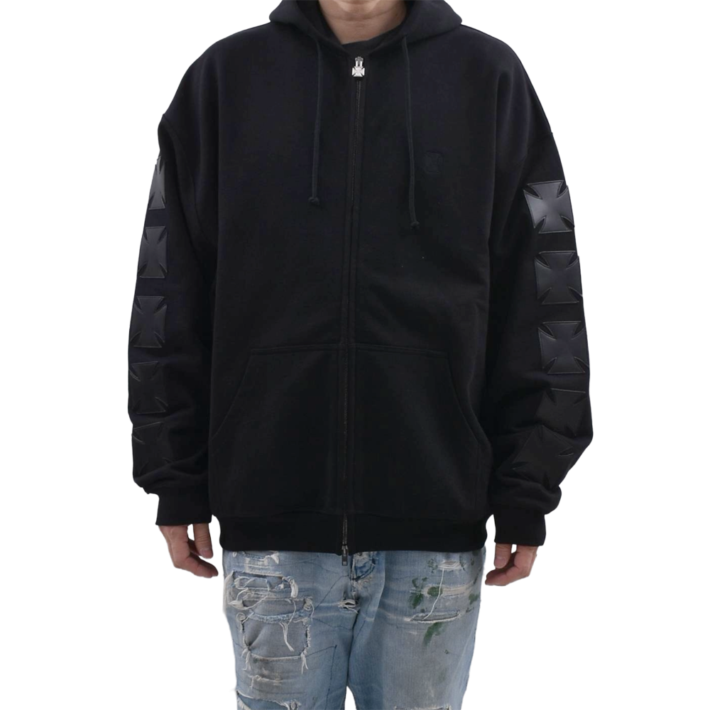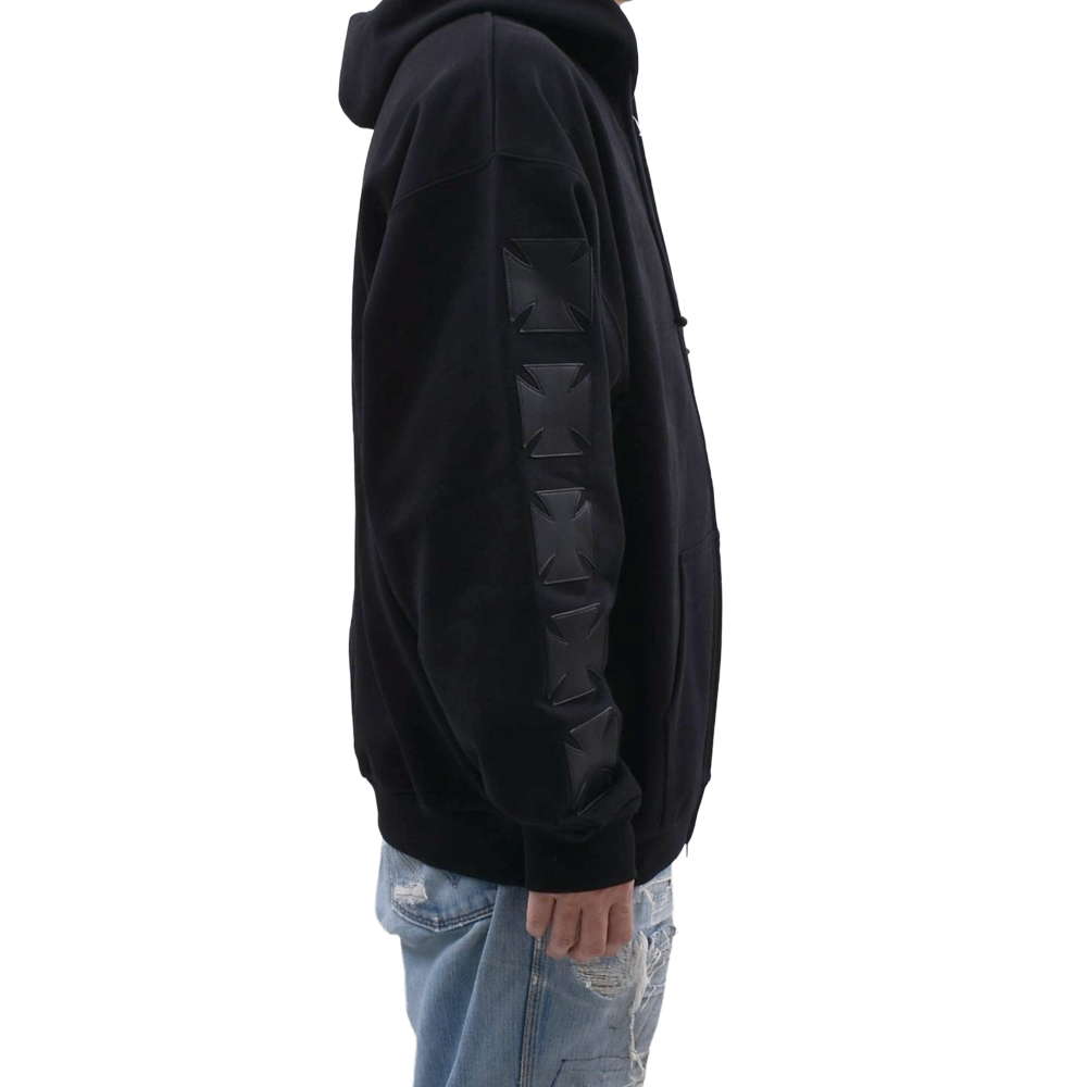 フロントのアイコニックなクロスロゴが目を引くZIPUPフーディ