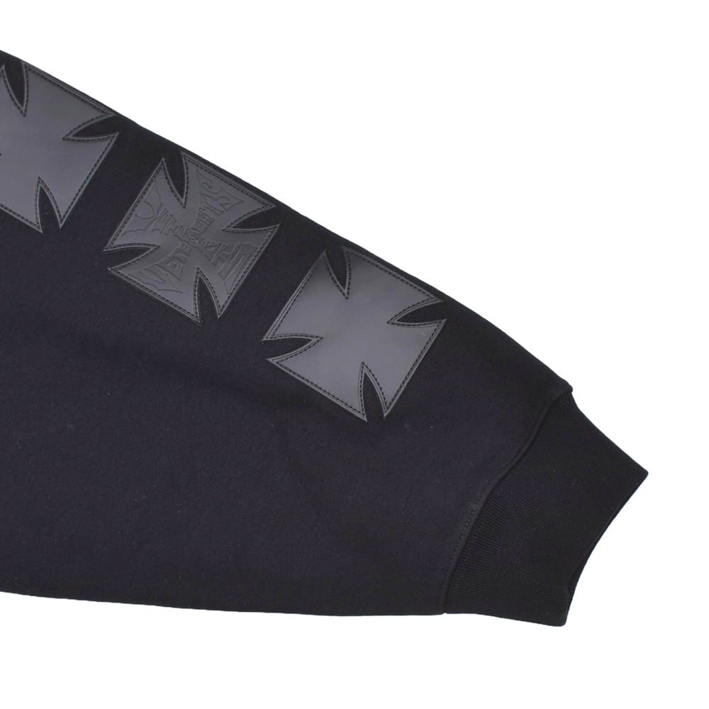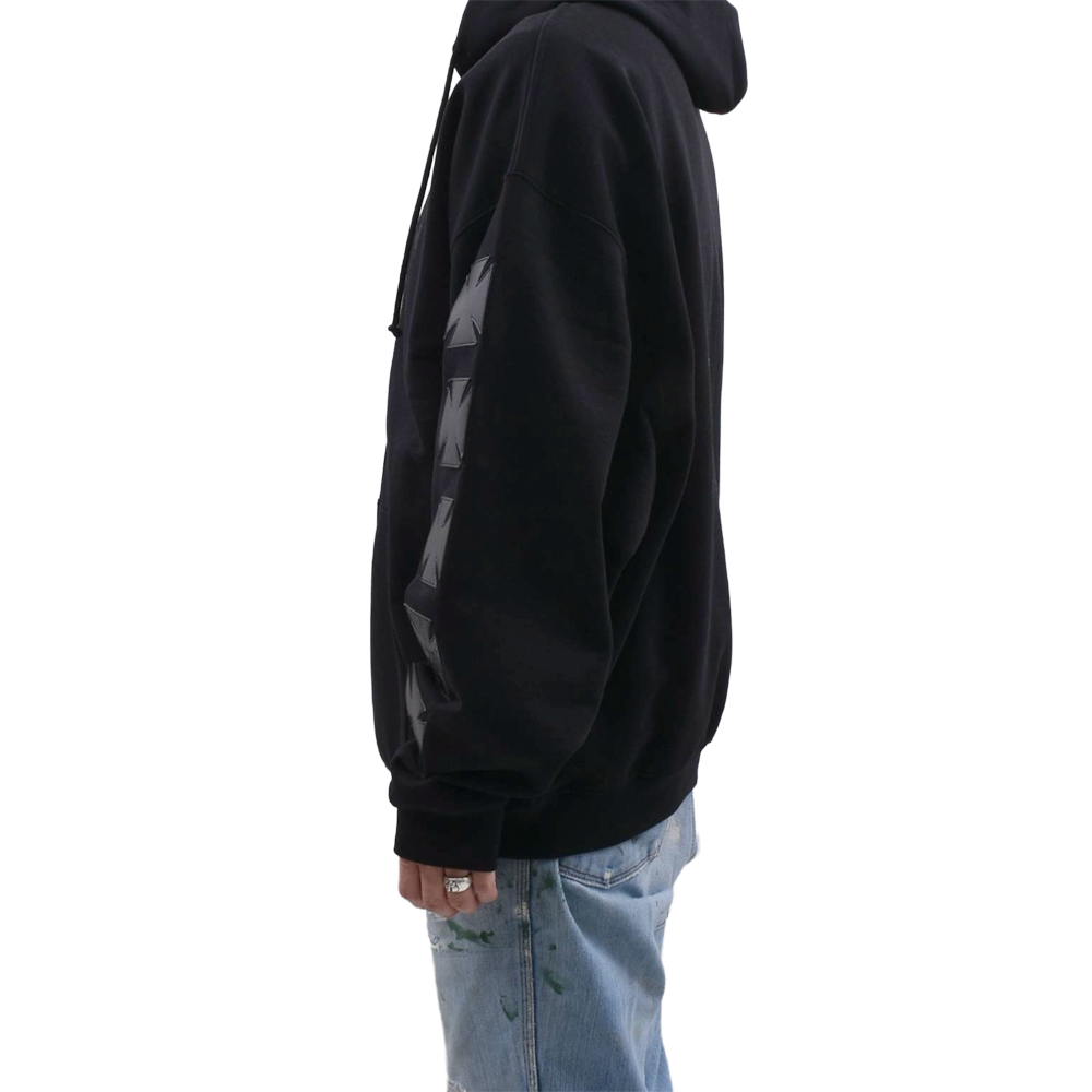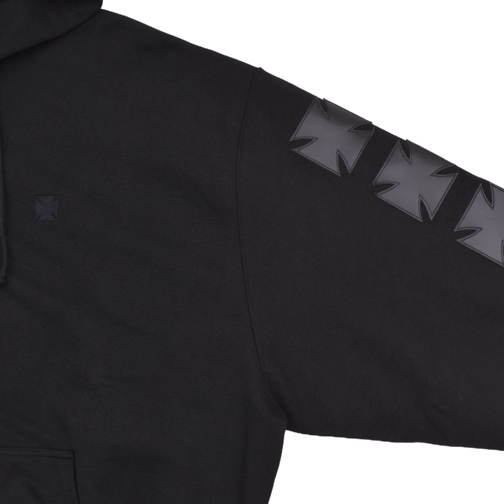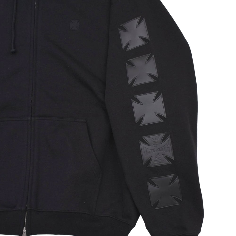 フロントのアイコニックなクロスロゴが目を引くZIPUPフーディ