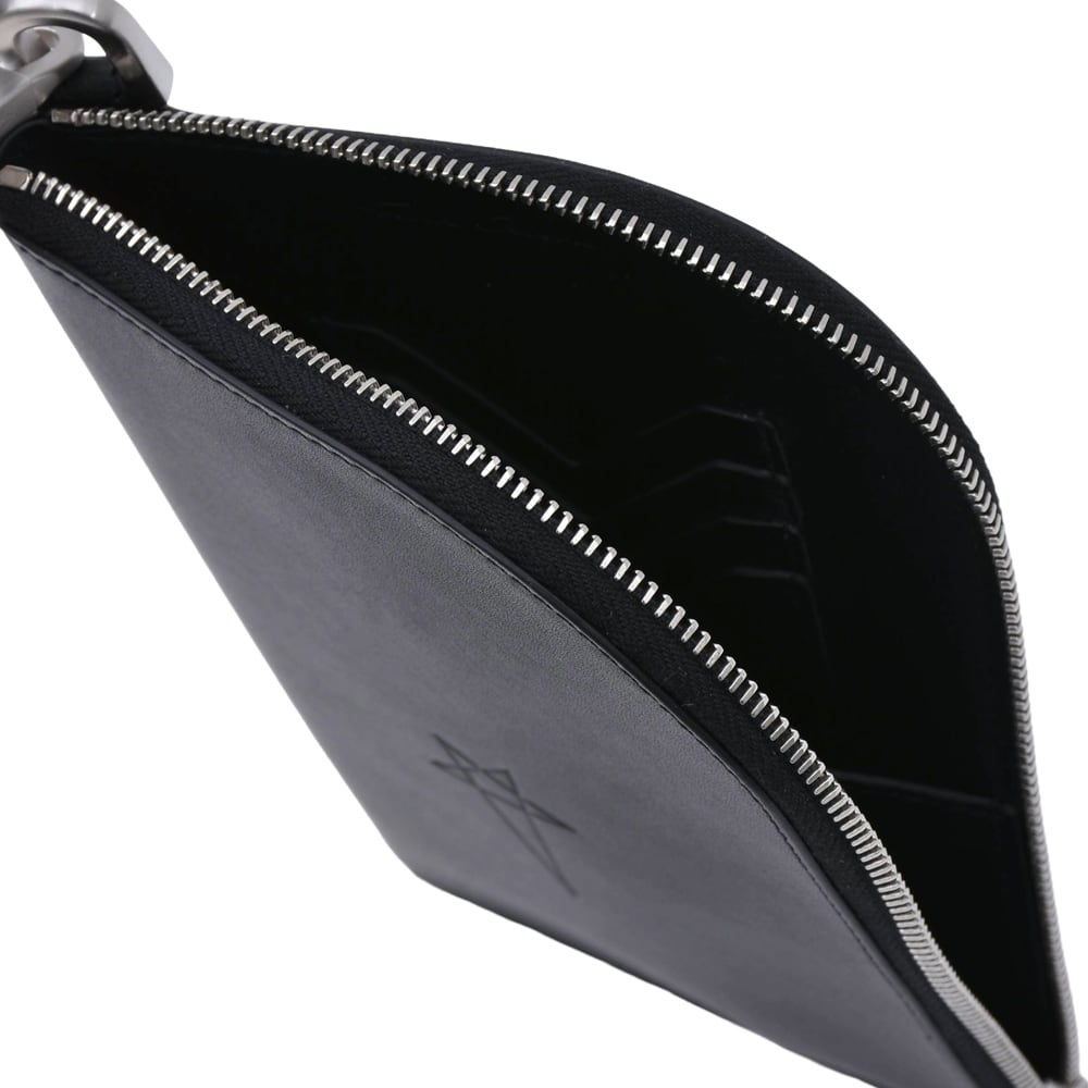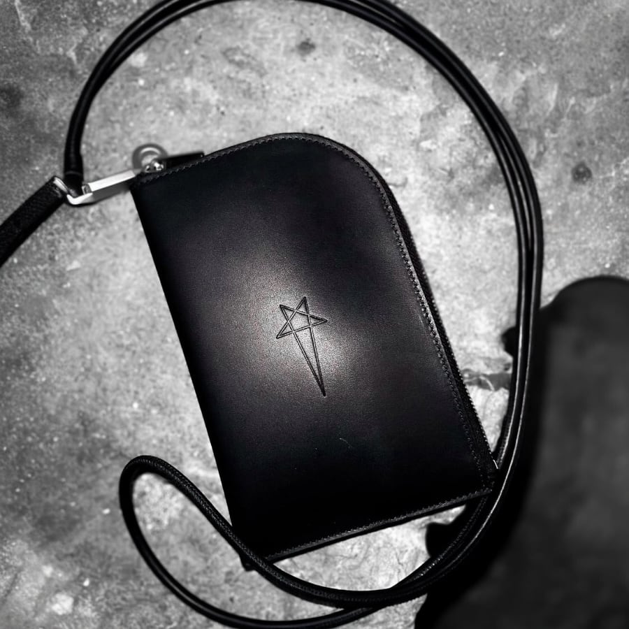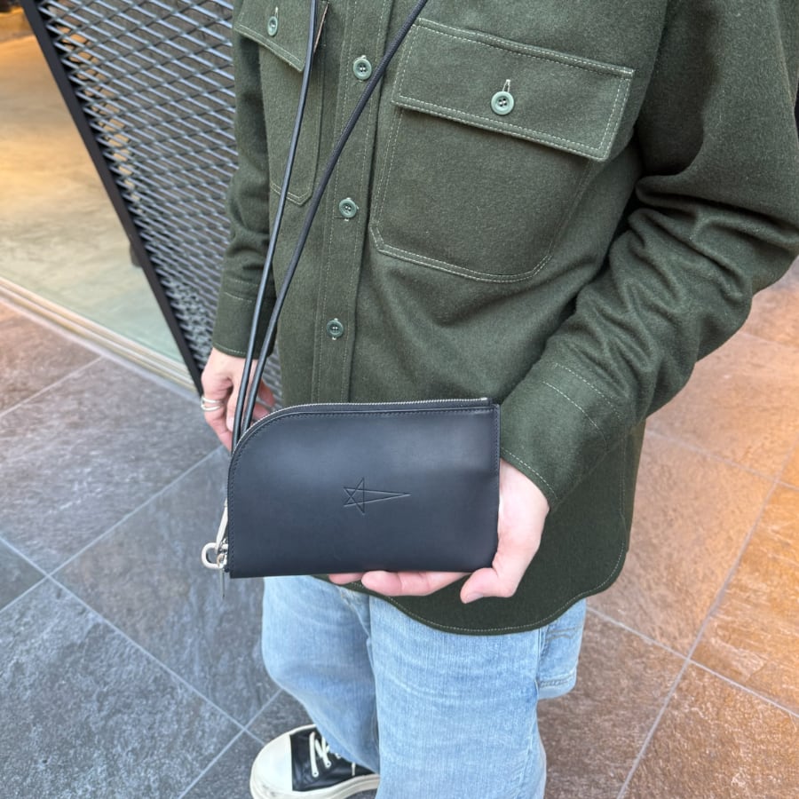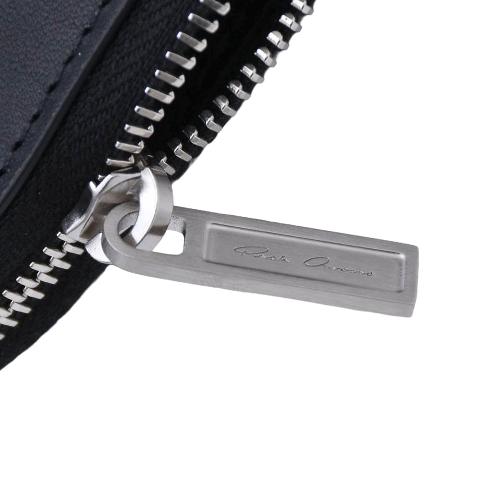 This is an L-shaped zip leather pouch and wallet embossed with the brand's iconic 'Long Star' on the front. It uses Rick's characteristic smooth and high-quality cowhide (or lamb leather). The matte texture that fits comfortably in the hand exudes luxury. Despite its slim, compact design, it can smartly store coins, cards and folded banknotes. The parts on the zip are finished with an inorganic, substantial feel, reflecting Rick's aesthetics down to the finest detail.