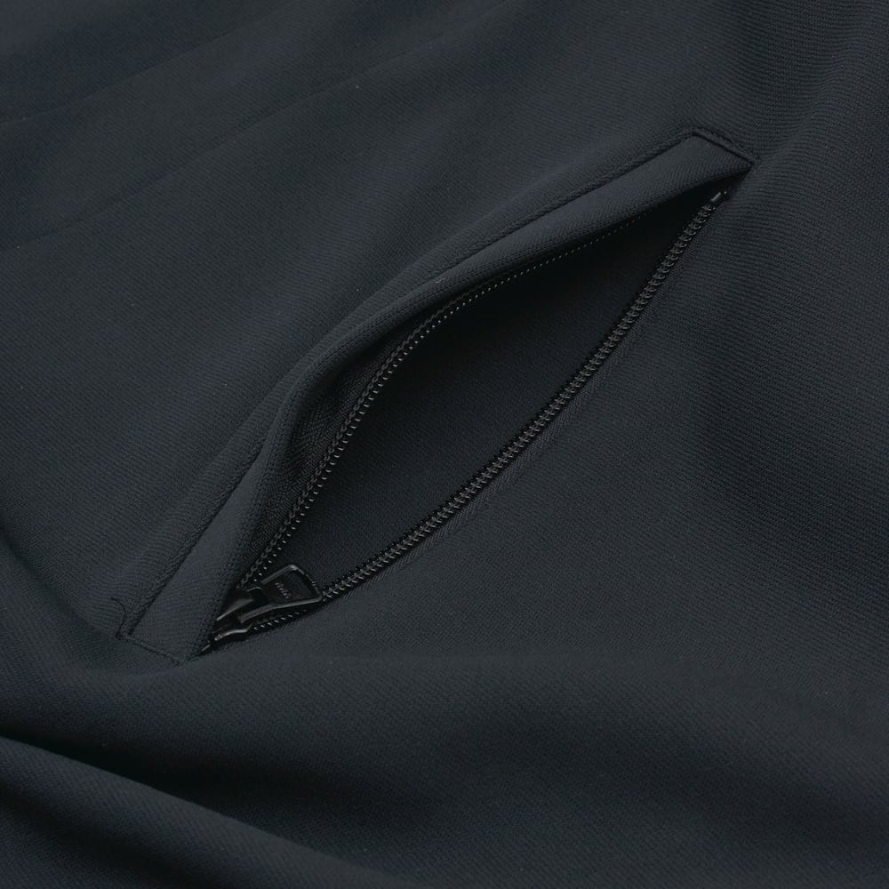 フロントや袖に散りばめられたコードストッパーは、単なる装飾ではなく、シルエットを自在に操るためのスイッチ。コードを絞ることで生地に複雑なドレープやシワ感を生み出し、着る人の感性で「形」を再構築できるアート性の高い一着です。