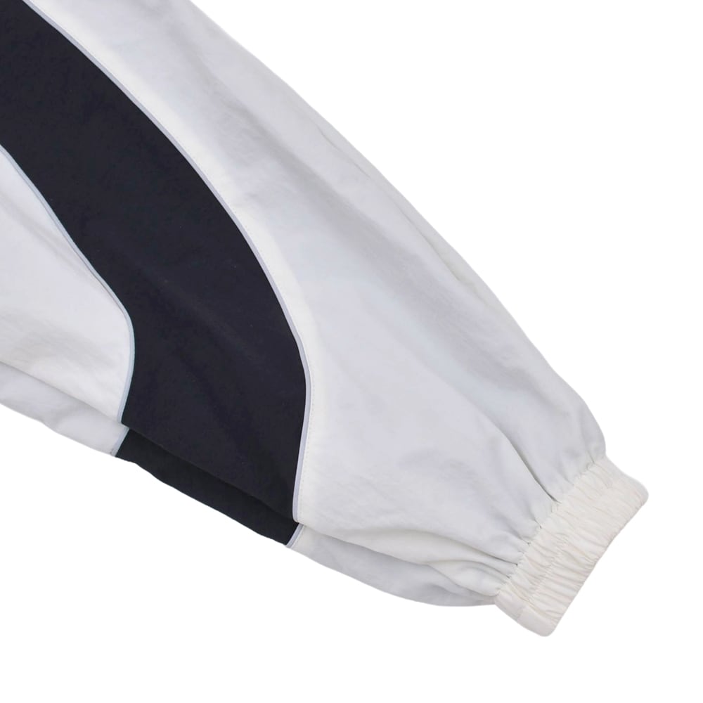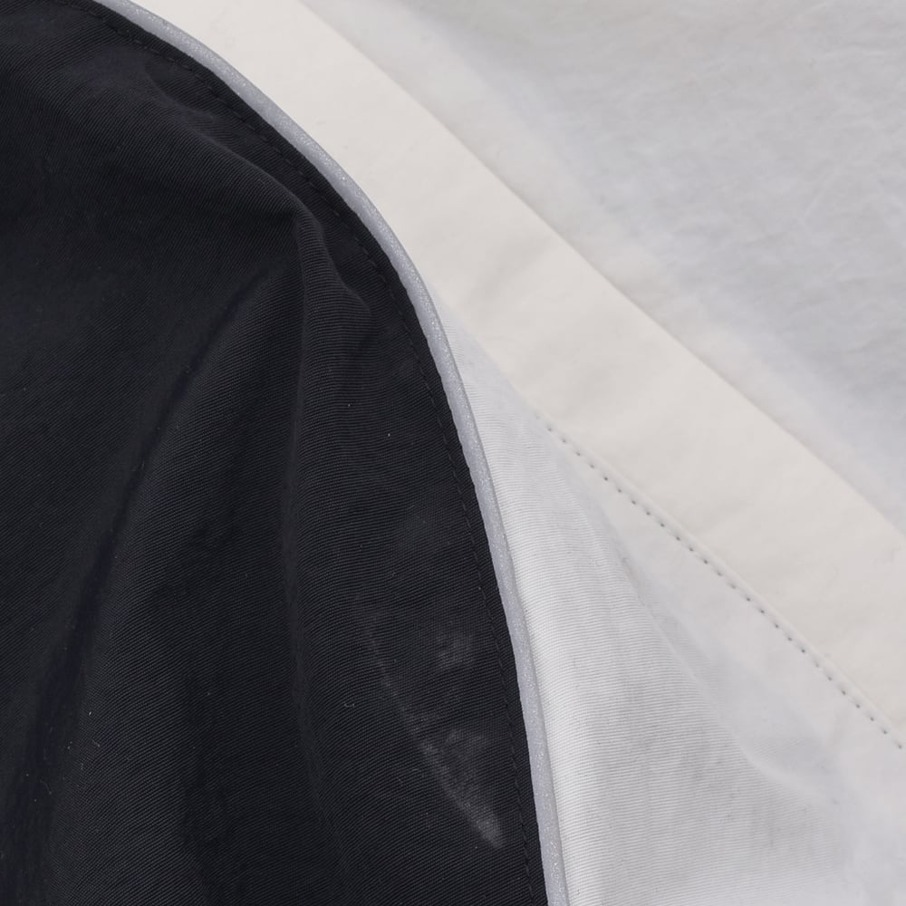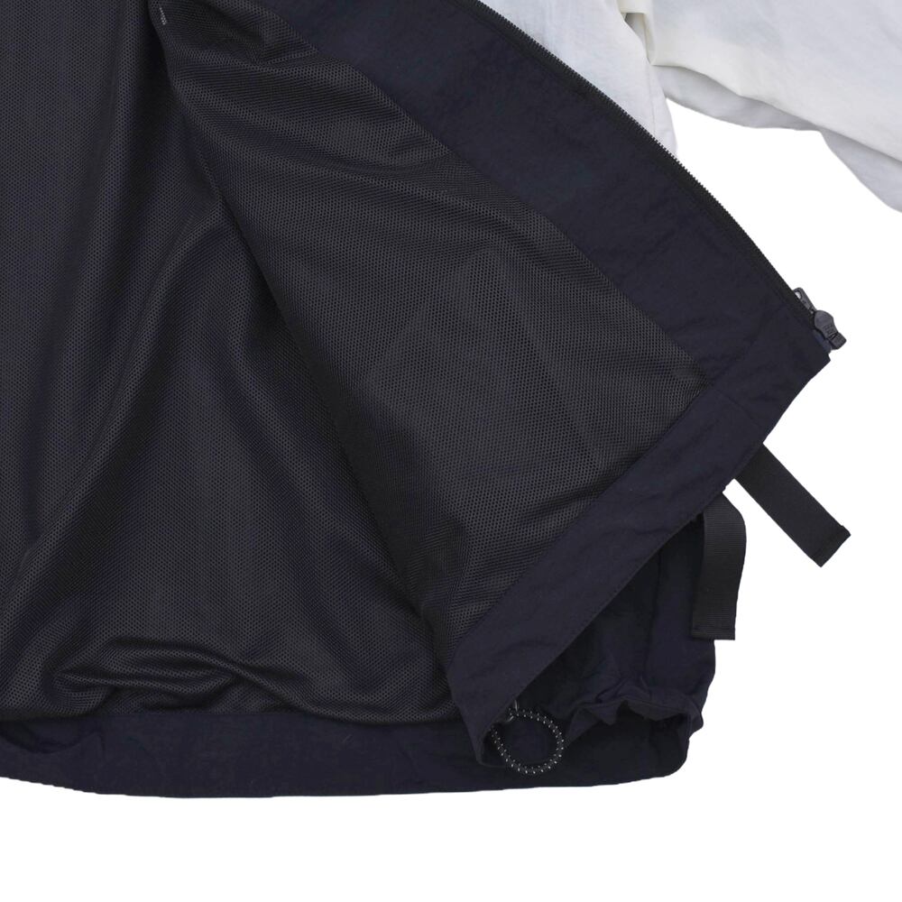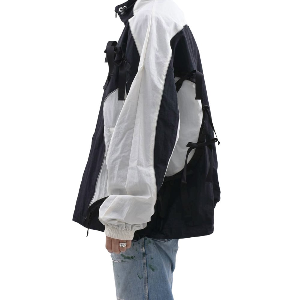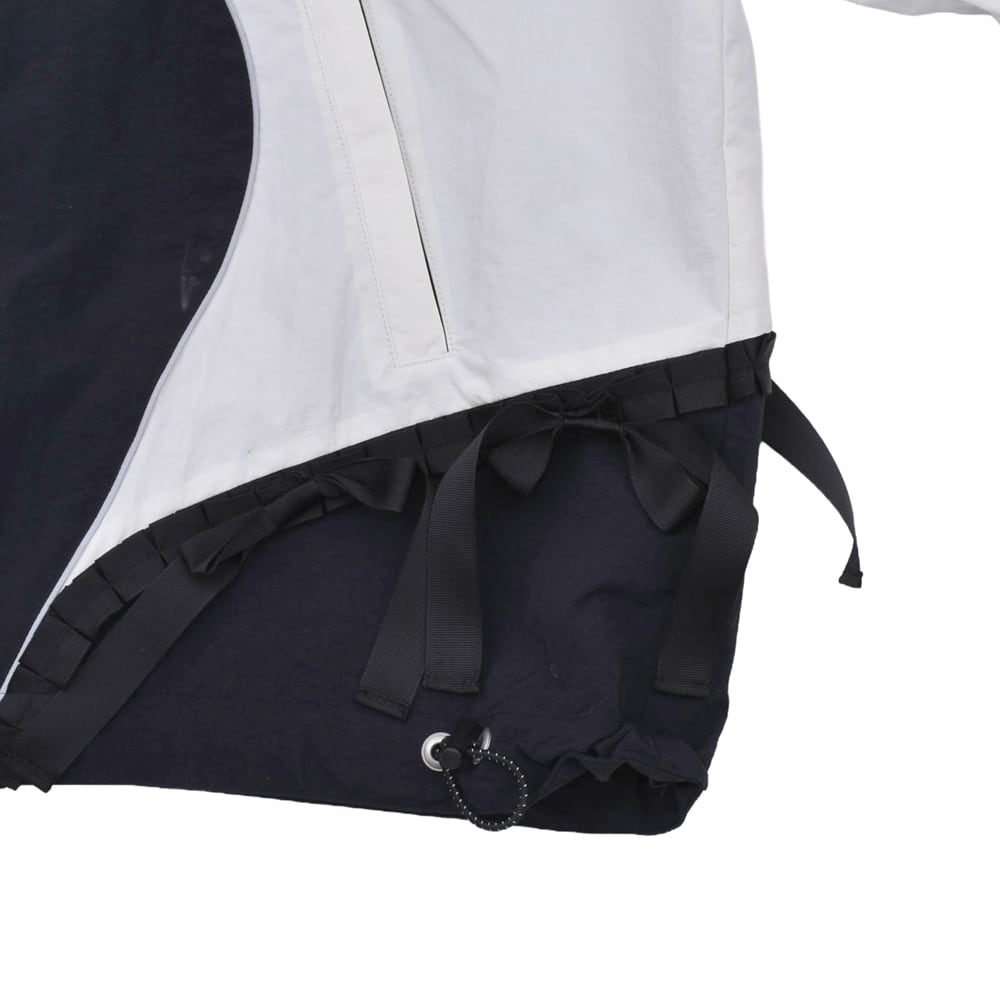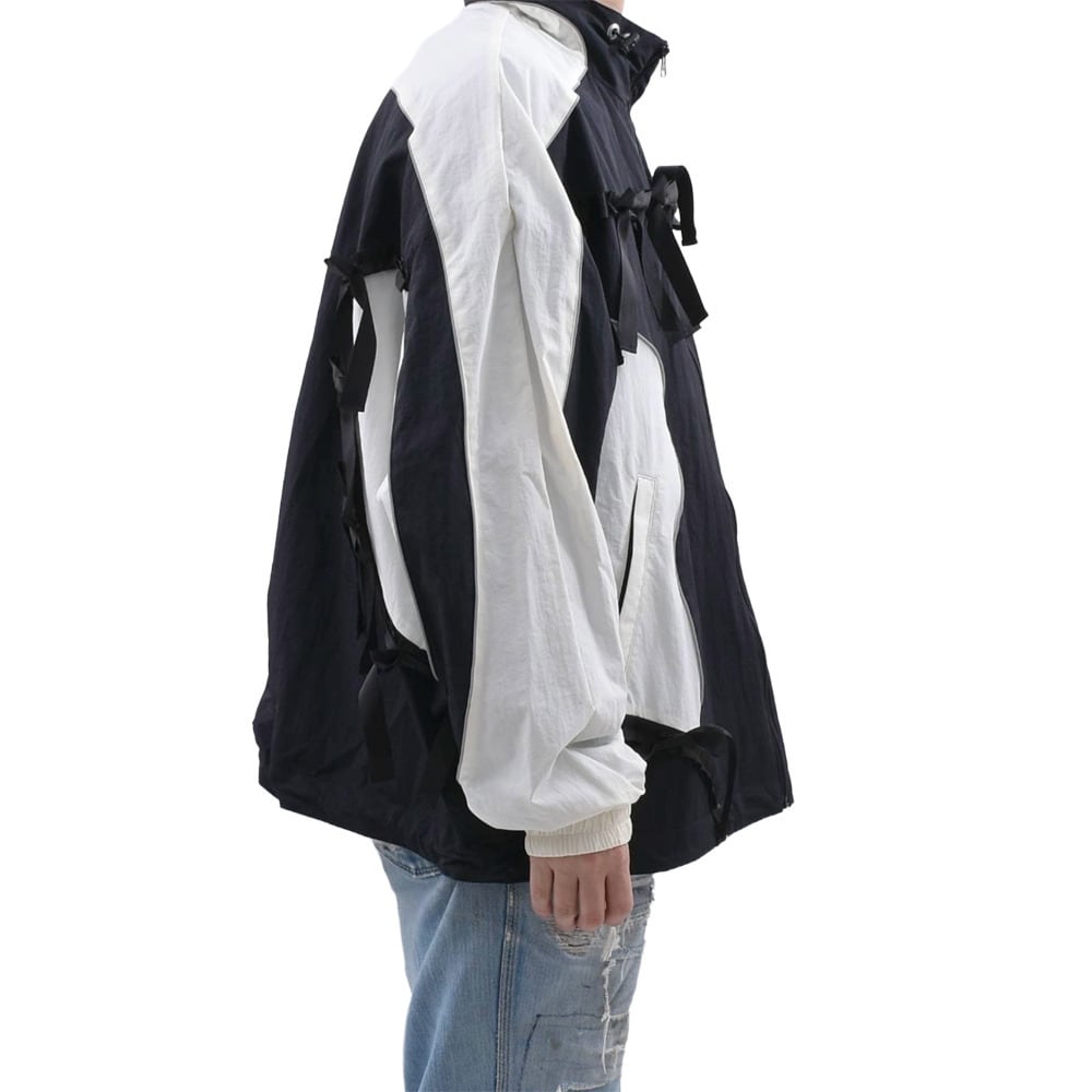 A nylon jacket that sublimates the contrasting elements of 'punk' and 'girly' with KIDILL's unique interpretation. The eye-catching feature is the numerous ribbons lavishly arranged from the front to the back. It adds a somewhat fetishistic and dark cuteness to the functional beauty of a sporty track jacket. The fluid monochrome panel switching creates a dynamic silhouette. This piece embodies the 'modern punk spirit' that the brand pursues.